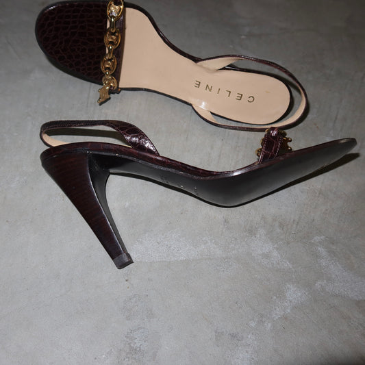 Celine Croc Print Leather Heels with Gold Charm Hardware (38)