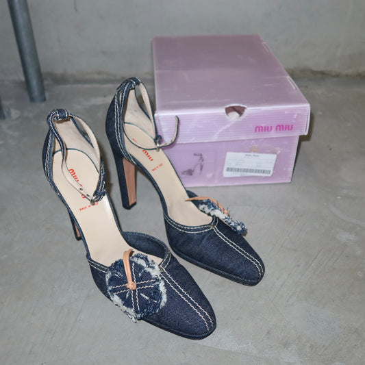 Miu Miu Rare Denim Heels with Floral Appliqué (40)