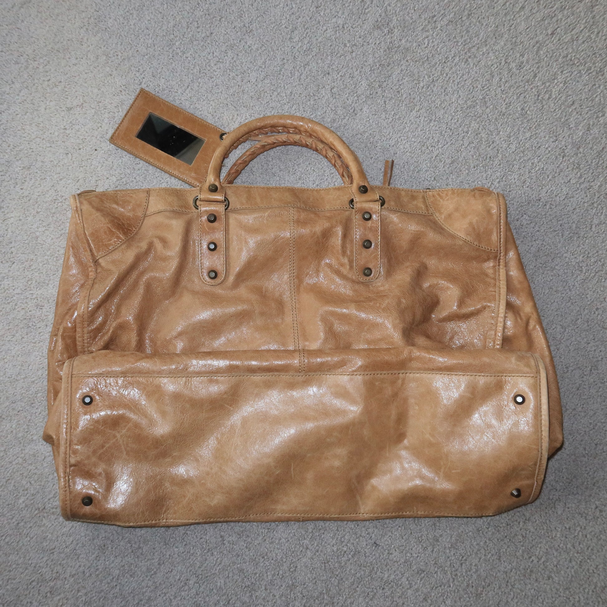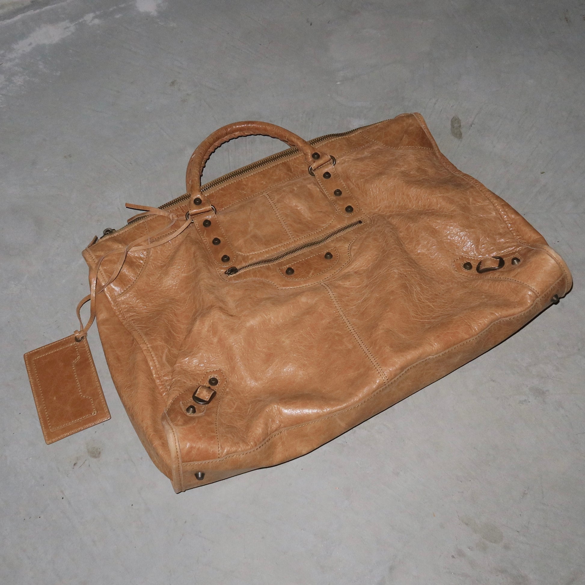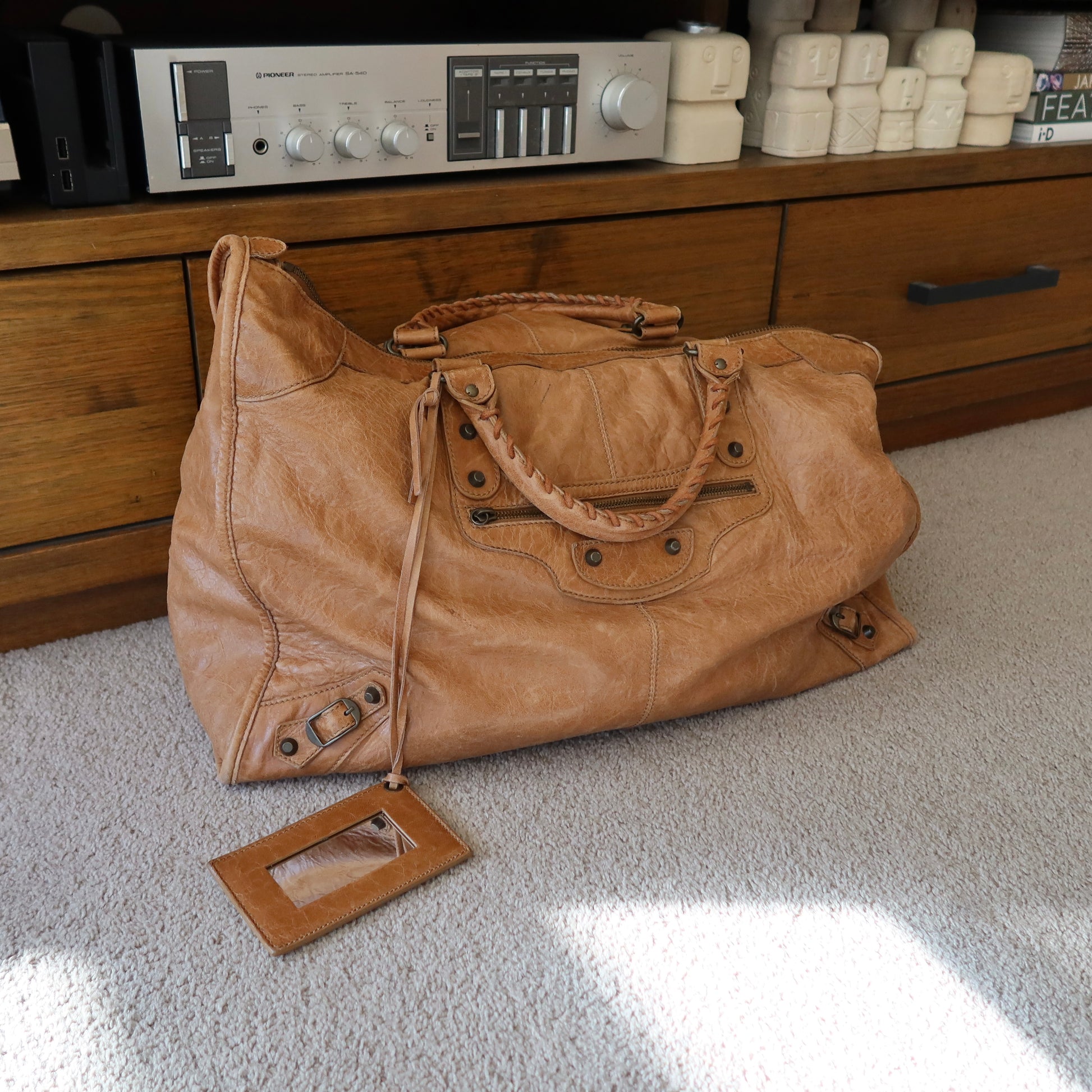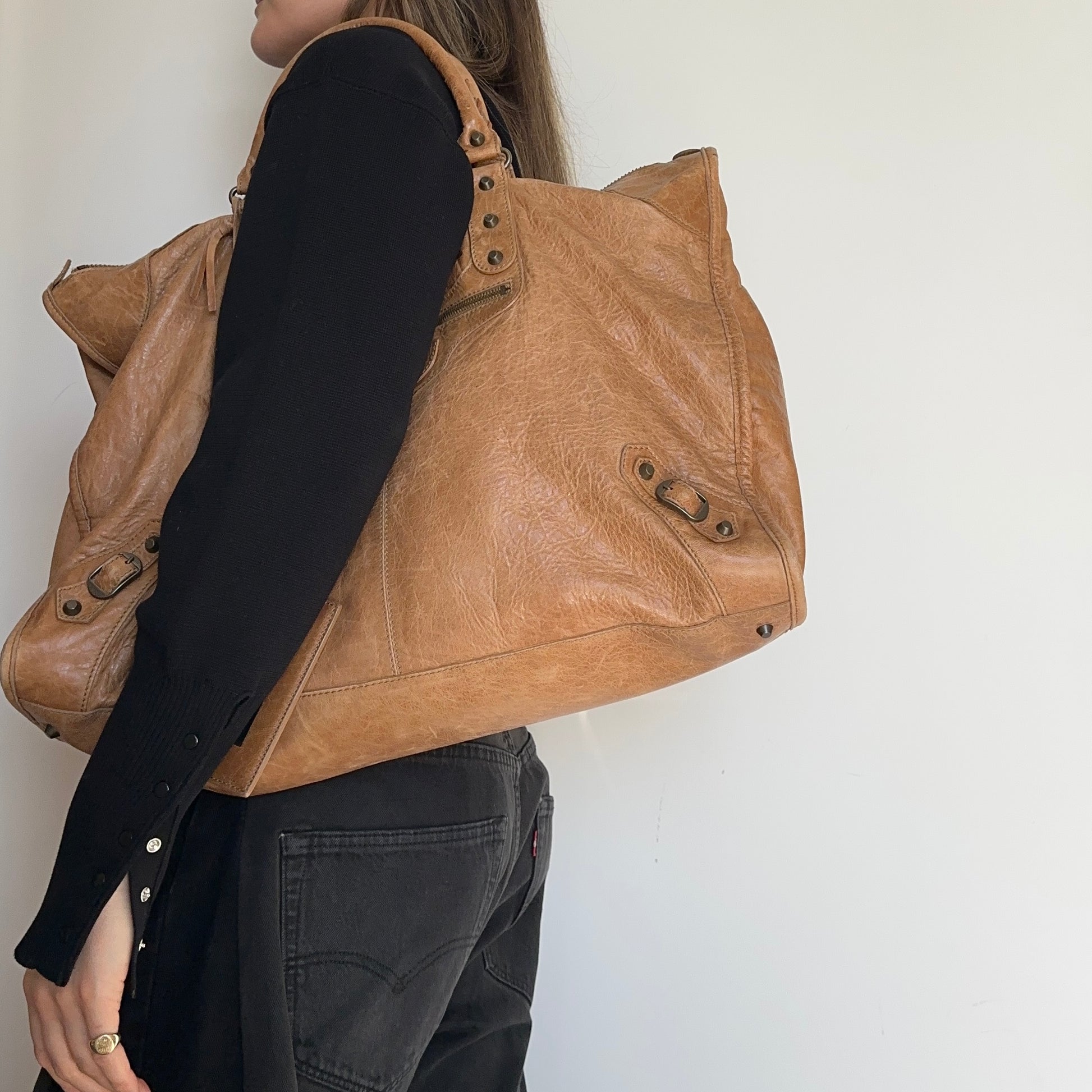 Incredible XL Balenciaga motorcycle/city bag. This model was dubbed the 'Weekender'. This size is notoriously difficult to hunt down! The Weekender does not come with a long strap but the handles can fit over the shoulder, it is quite snug however.