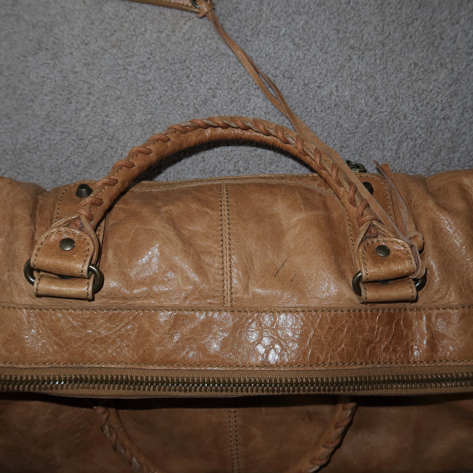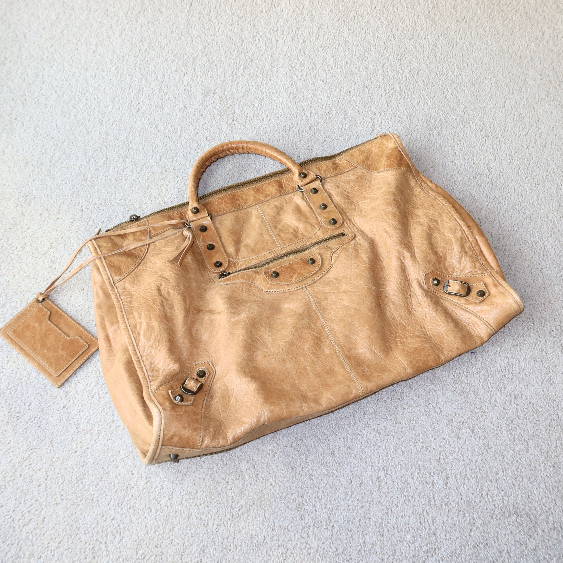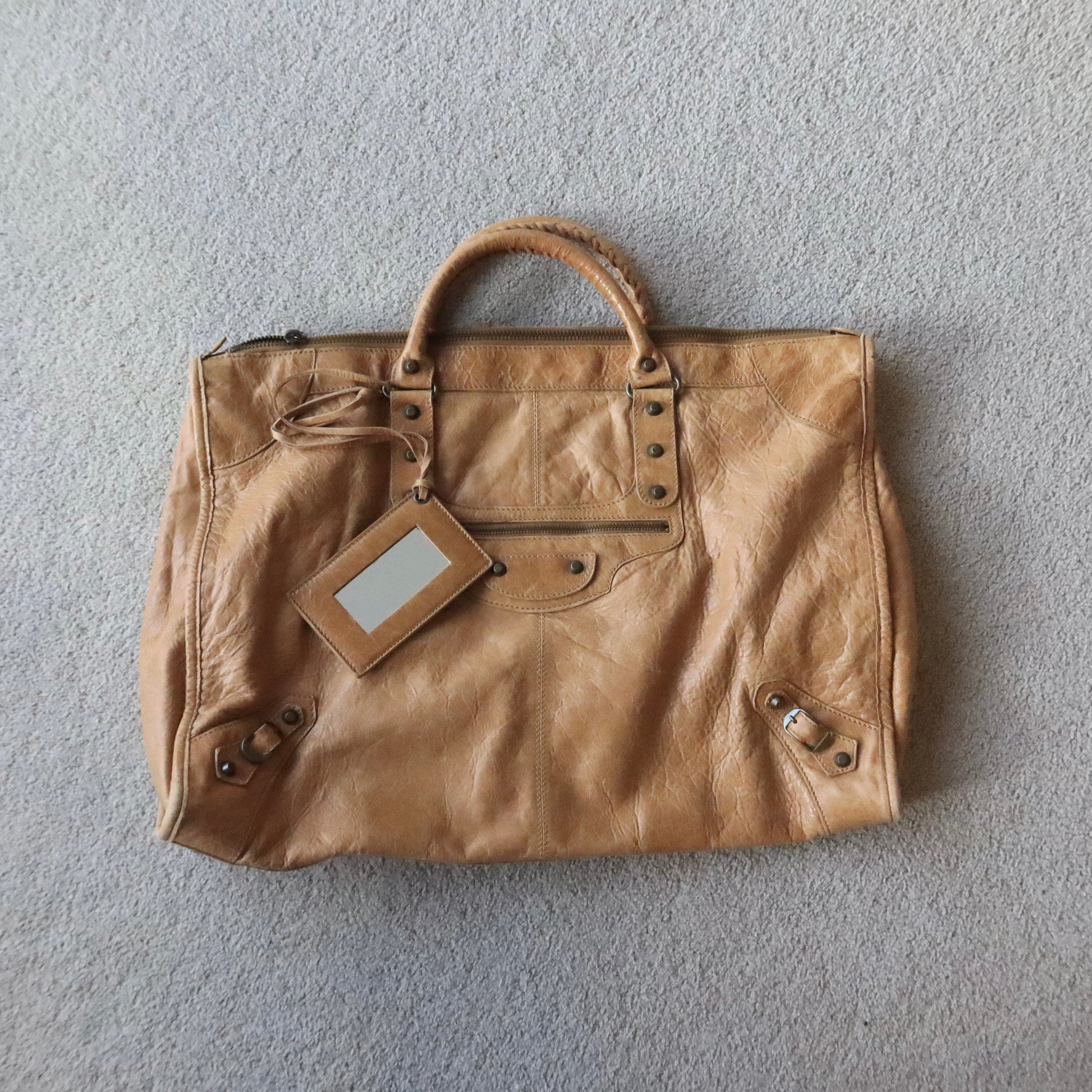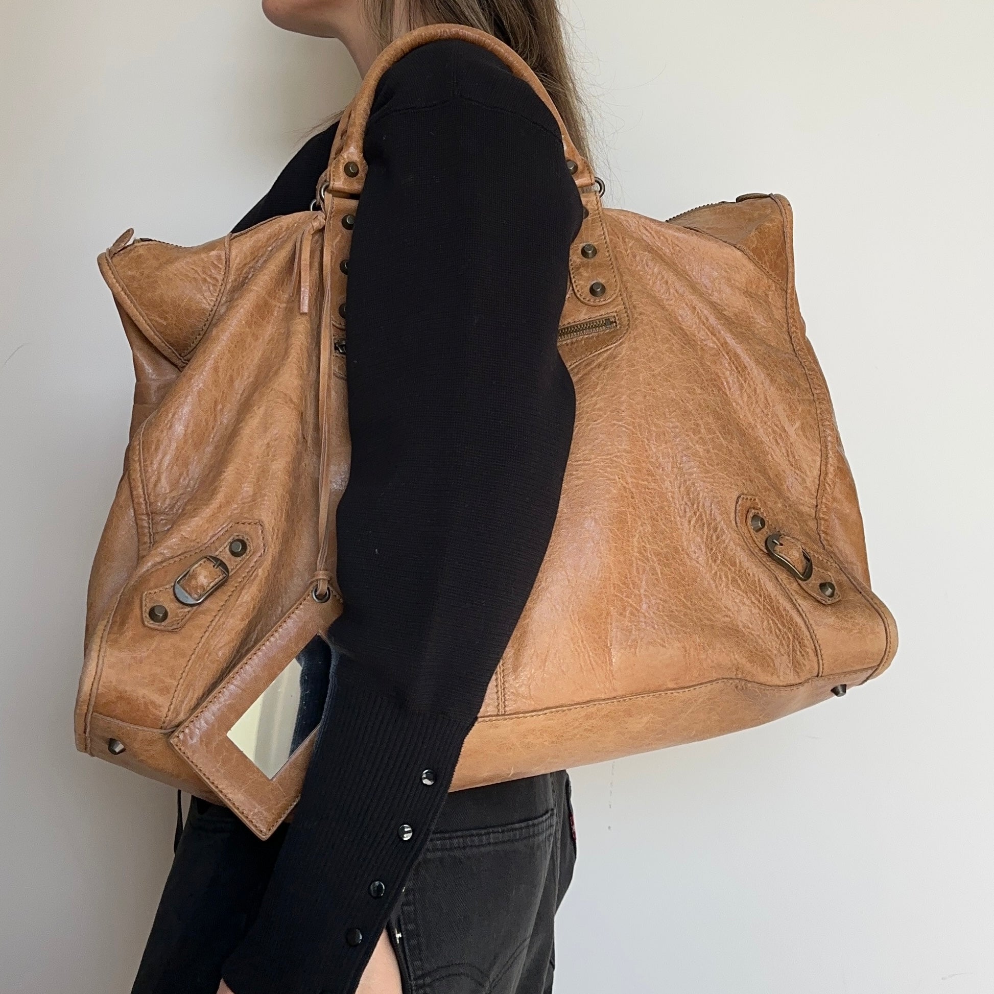 Incredible XL Balenciaga motorcycle/city bag. This model was dubbed the 'Weekender'. This size is notoriously difficult to hunt down! The Weekender does not come with a long strap but the handles can fit over the shoulder, it is quite snug however.