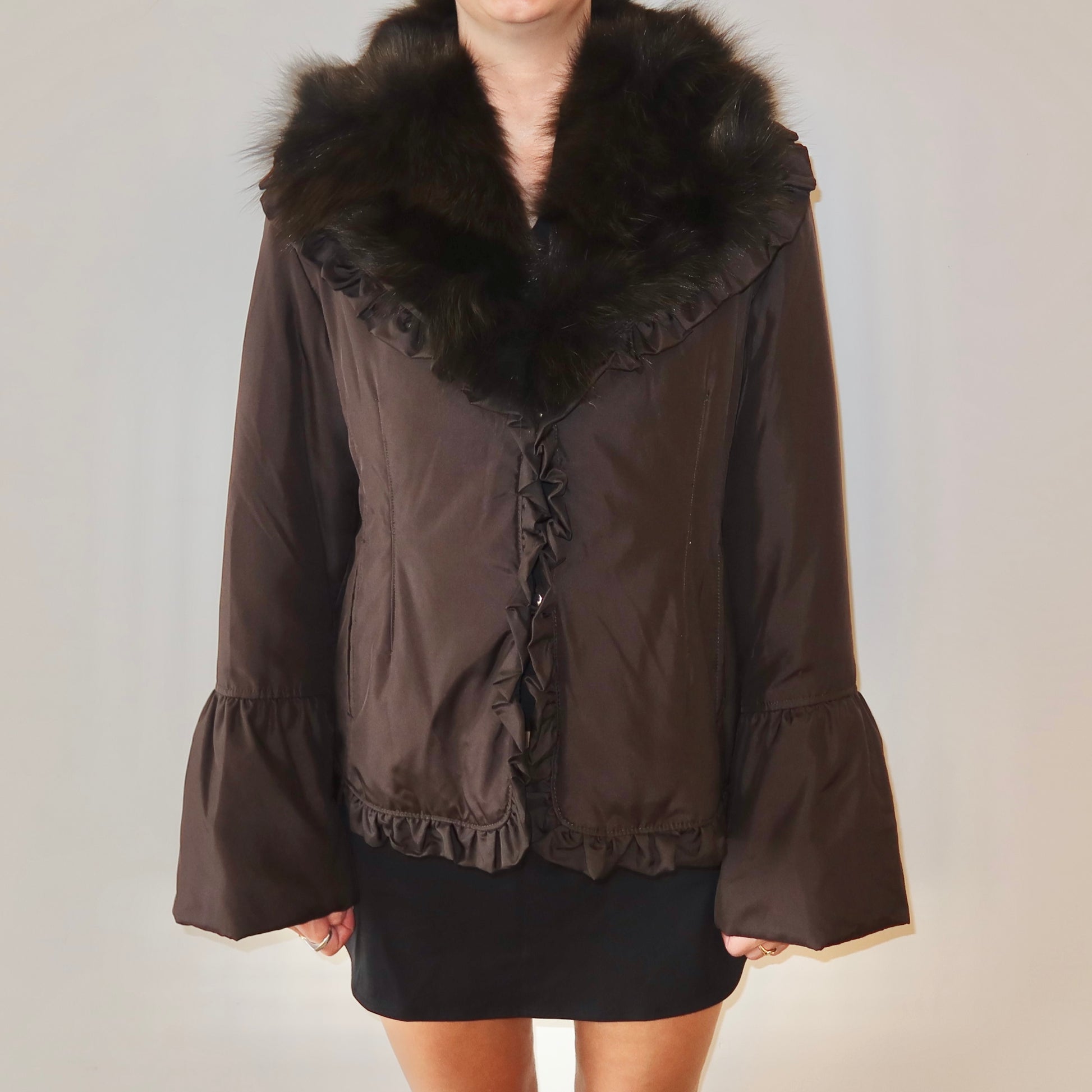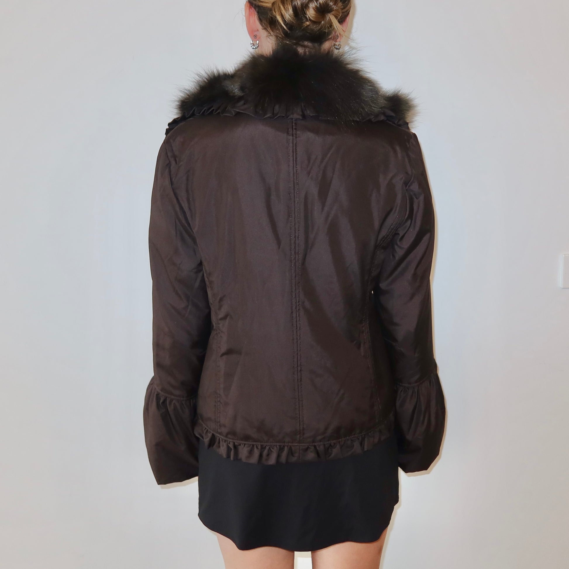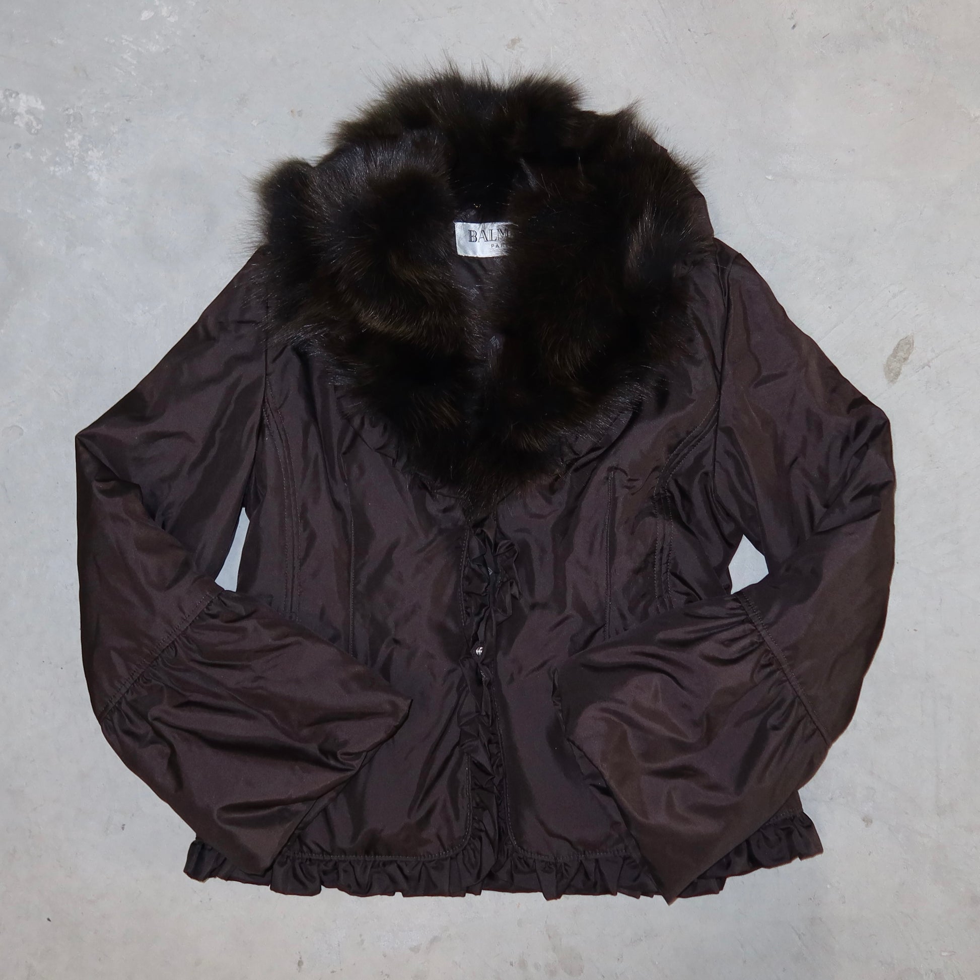Gorgeous Balmain brown nylon jacket with detachable real fur collar. Flared sleeve detail.