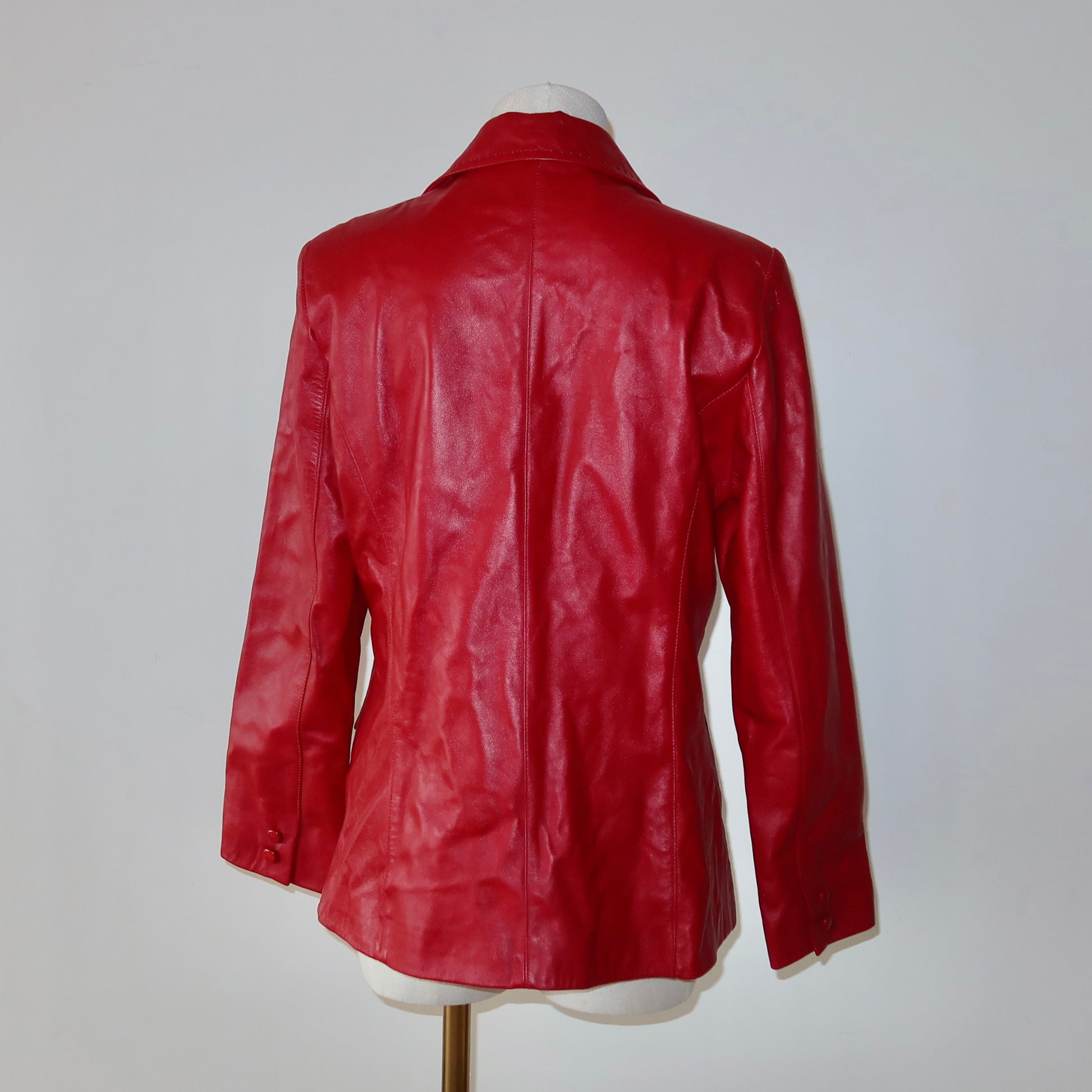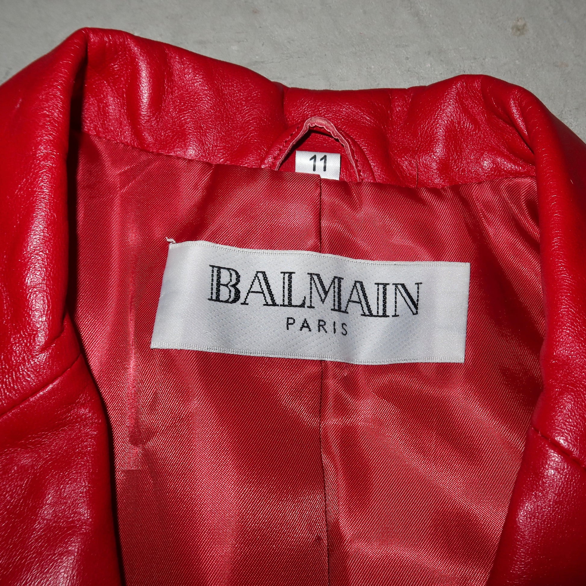 Red leather Balmain blazer. Subtle padding in the shoulders.