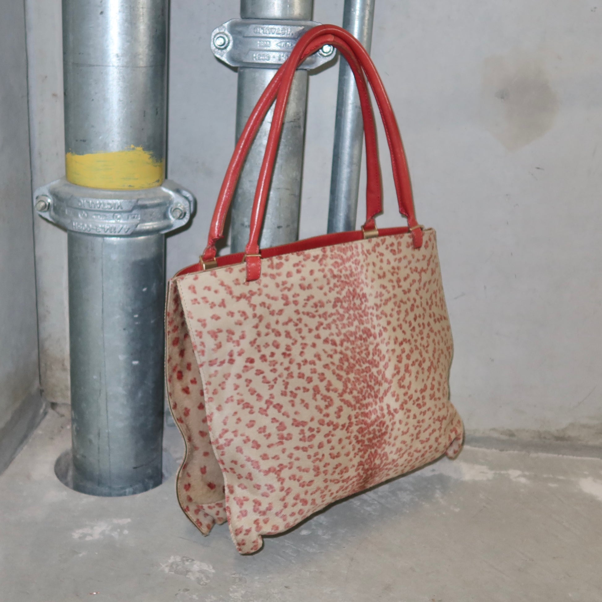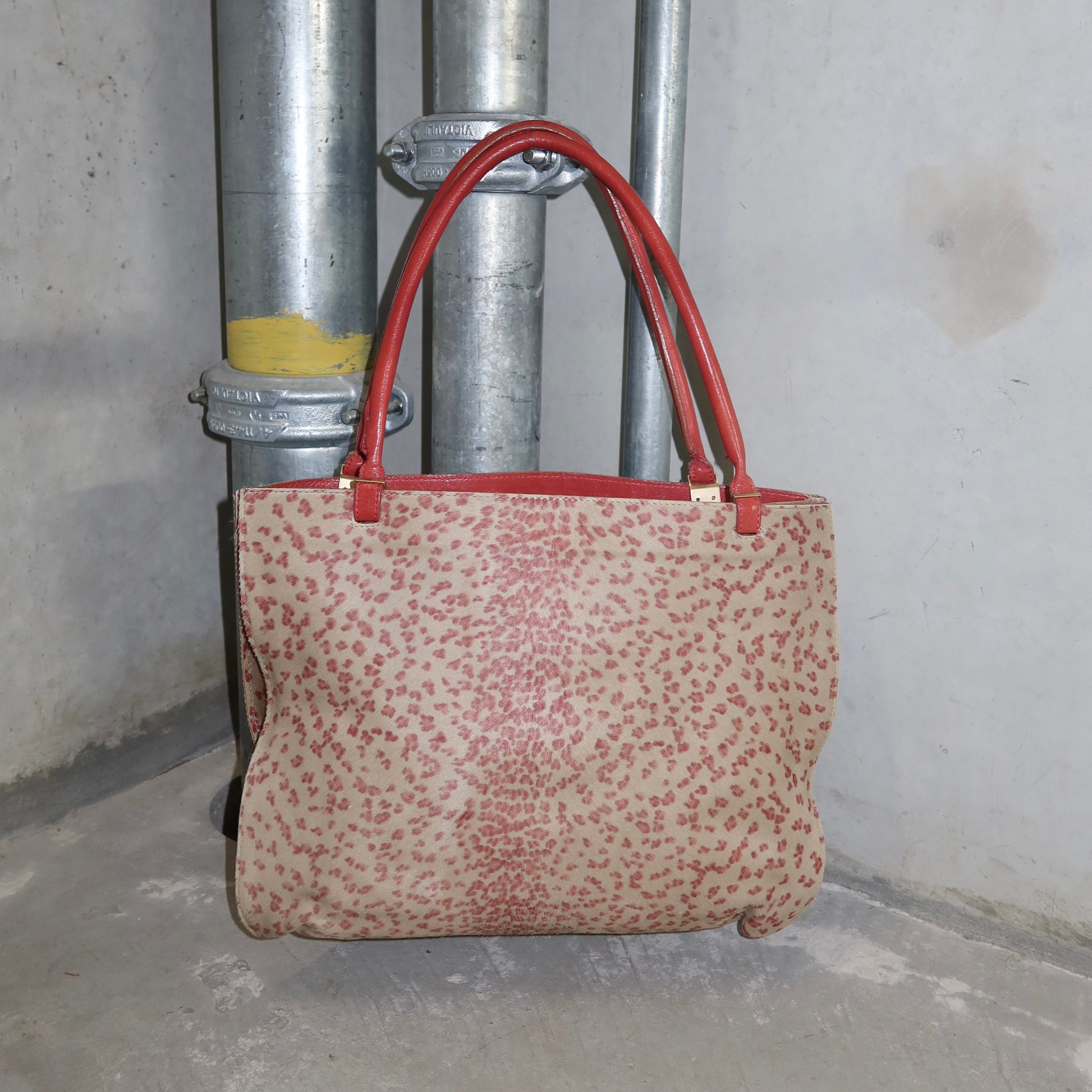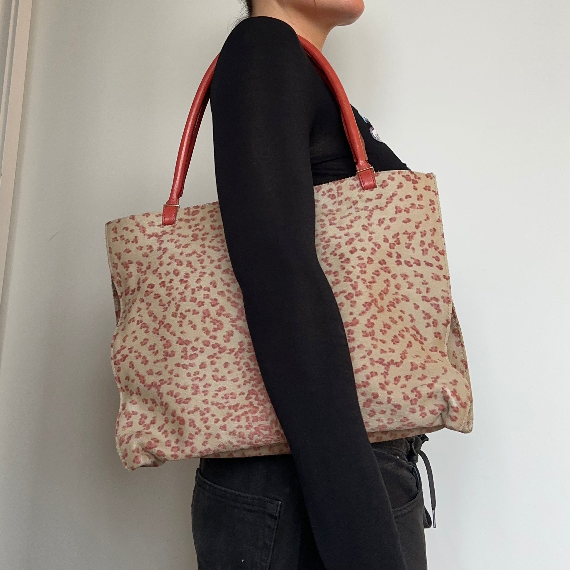 Incredible pink leopard print cowhide Bottega Veneta tote bag. Pink leather accents. Boasts two large compartments, one with a zipped smaller pocket and open smaller pocket.