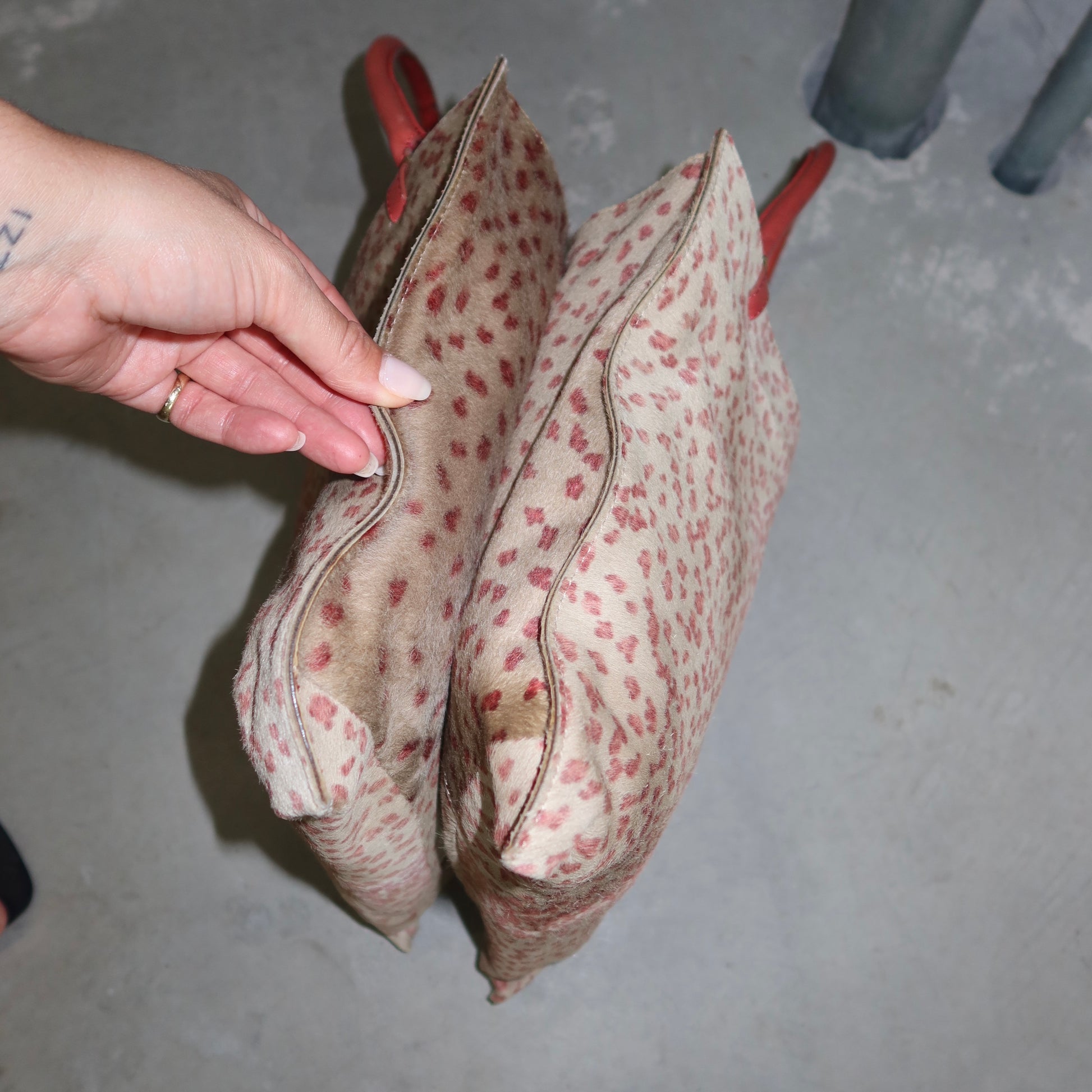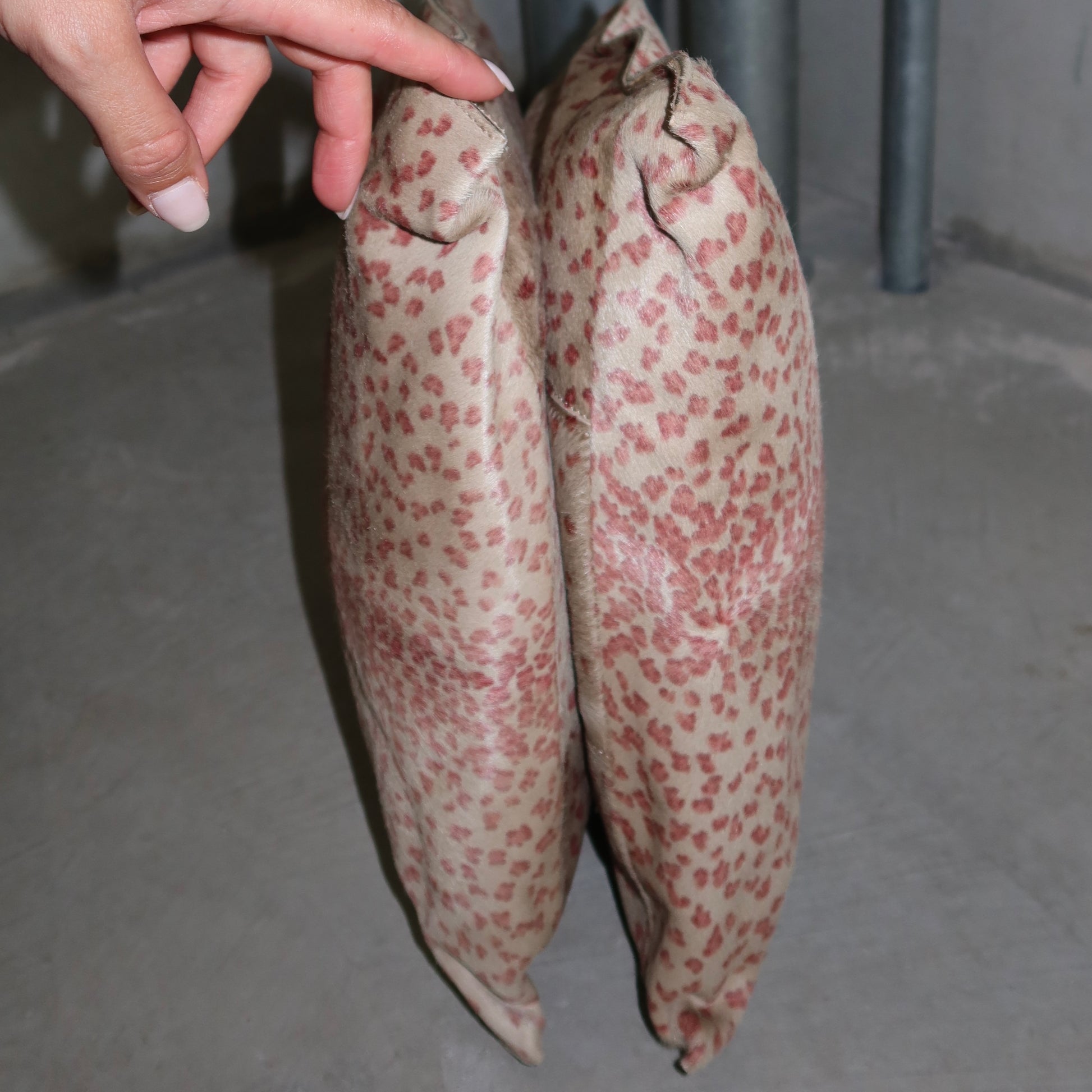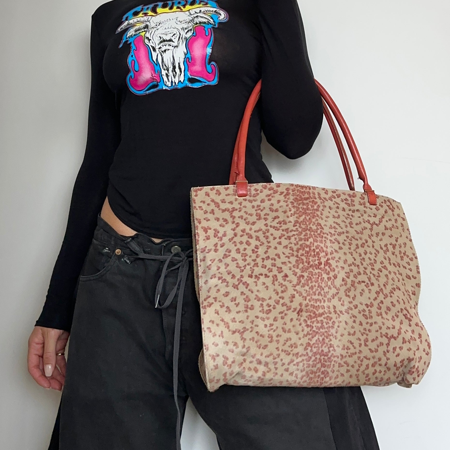 Incredible pink leopard print cowhide Bottega Veneta tote bag. Pink leather accents. Boasts two large compartments, one with a zipped smaller pocket and open smaller pocket.