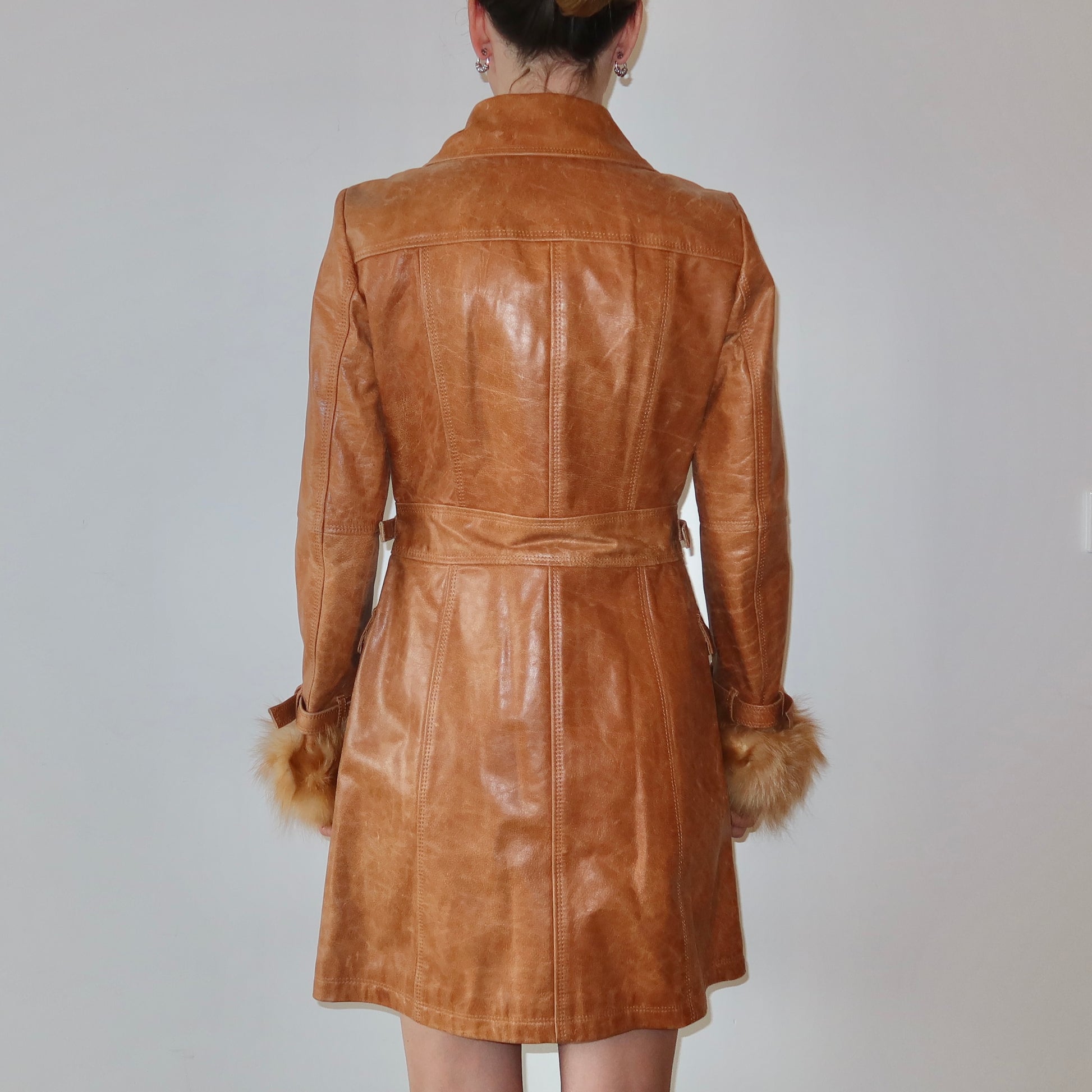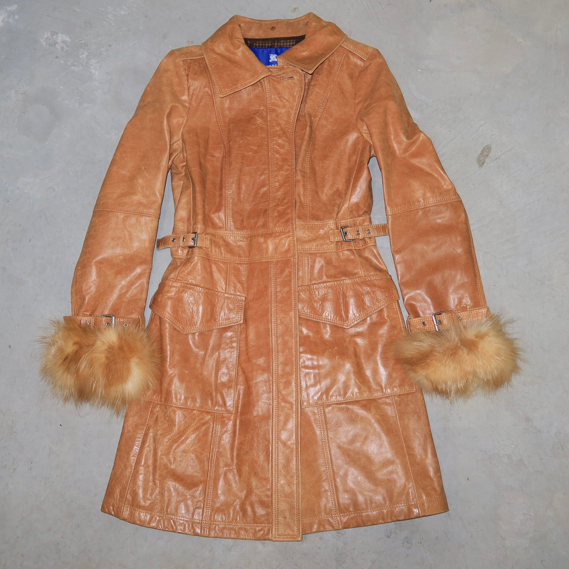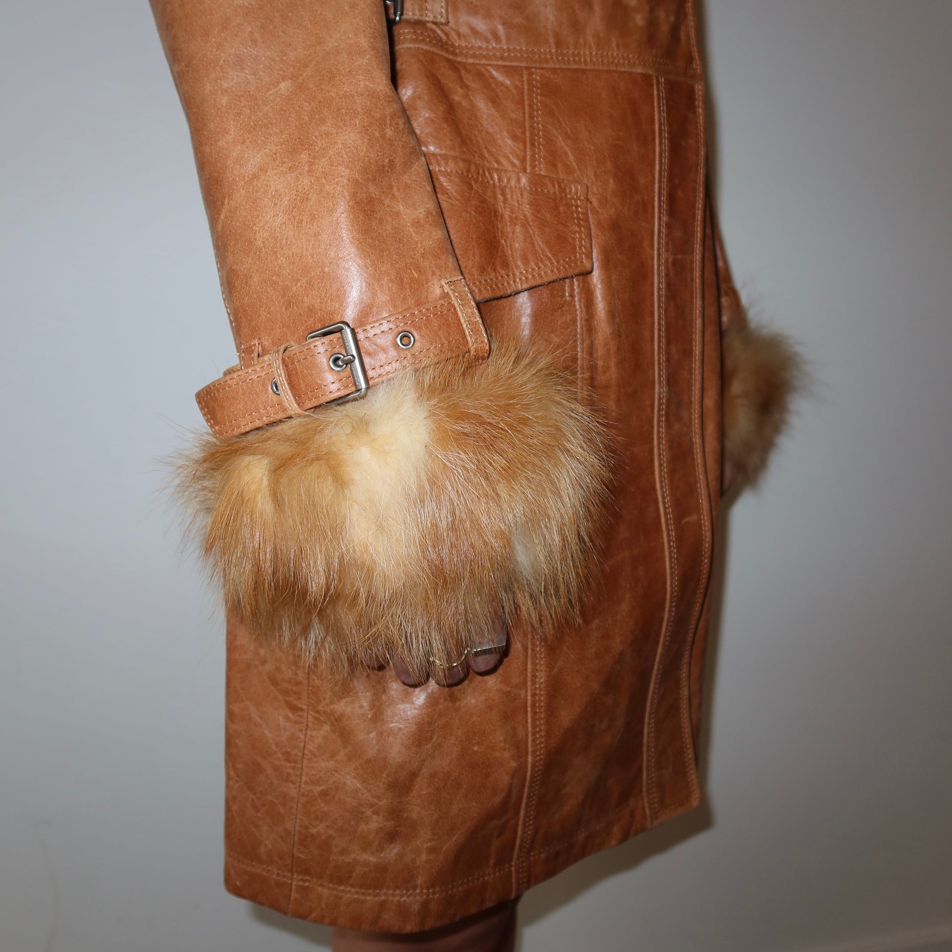 Gorgeous long brown leather coat by Burberry. Fox fur cuffs on the sleeves.