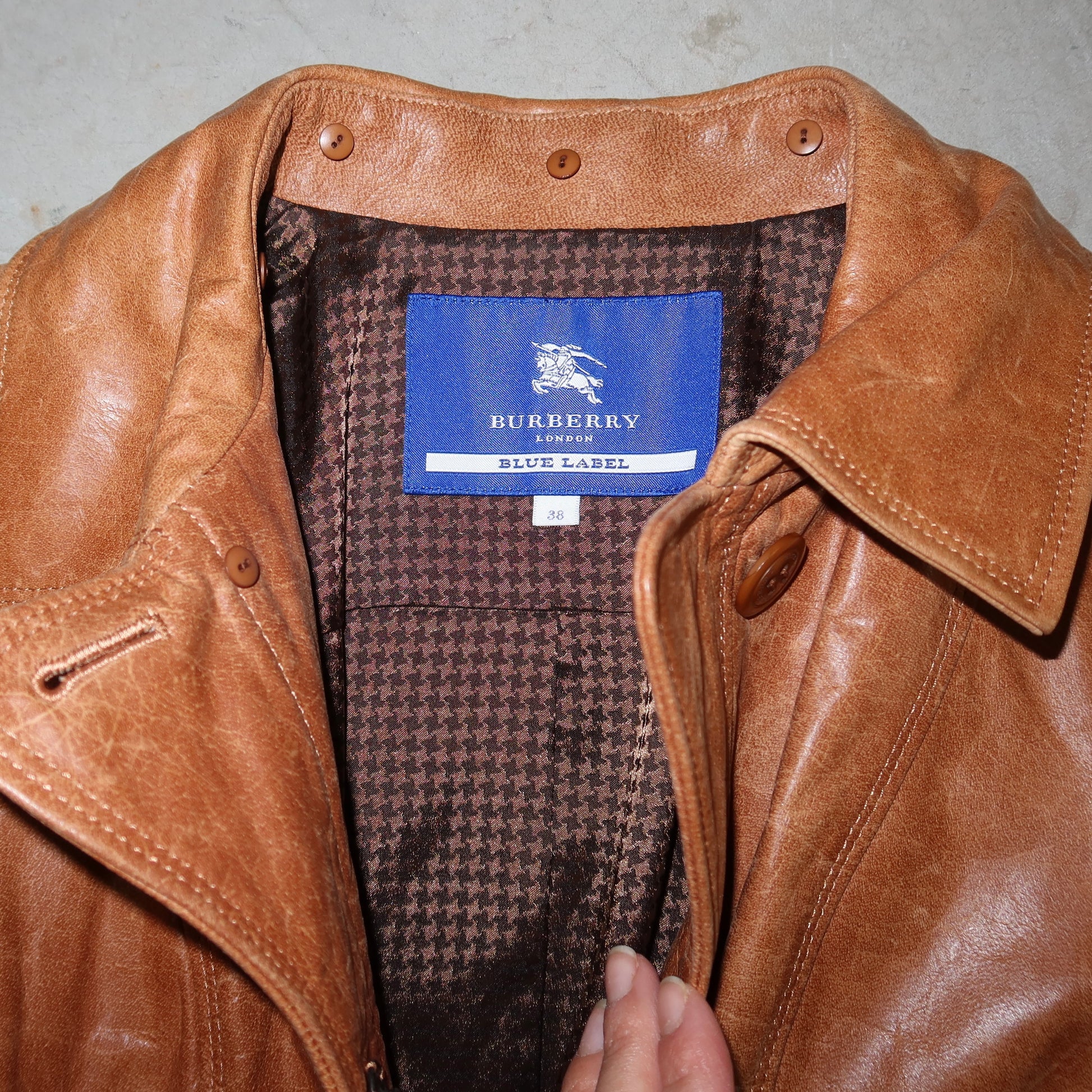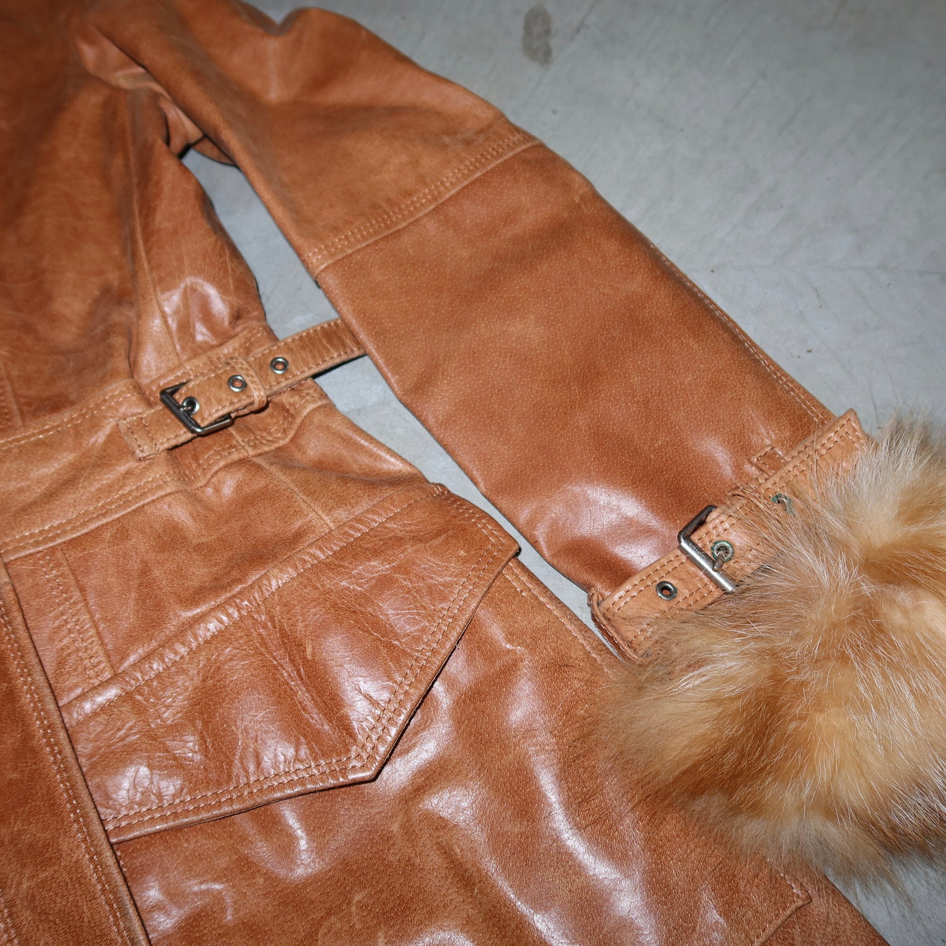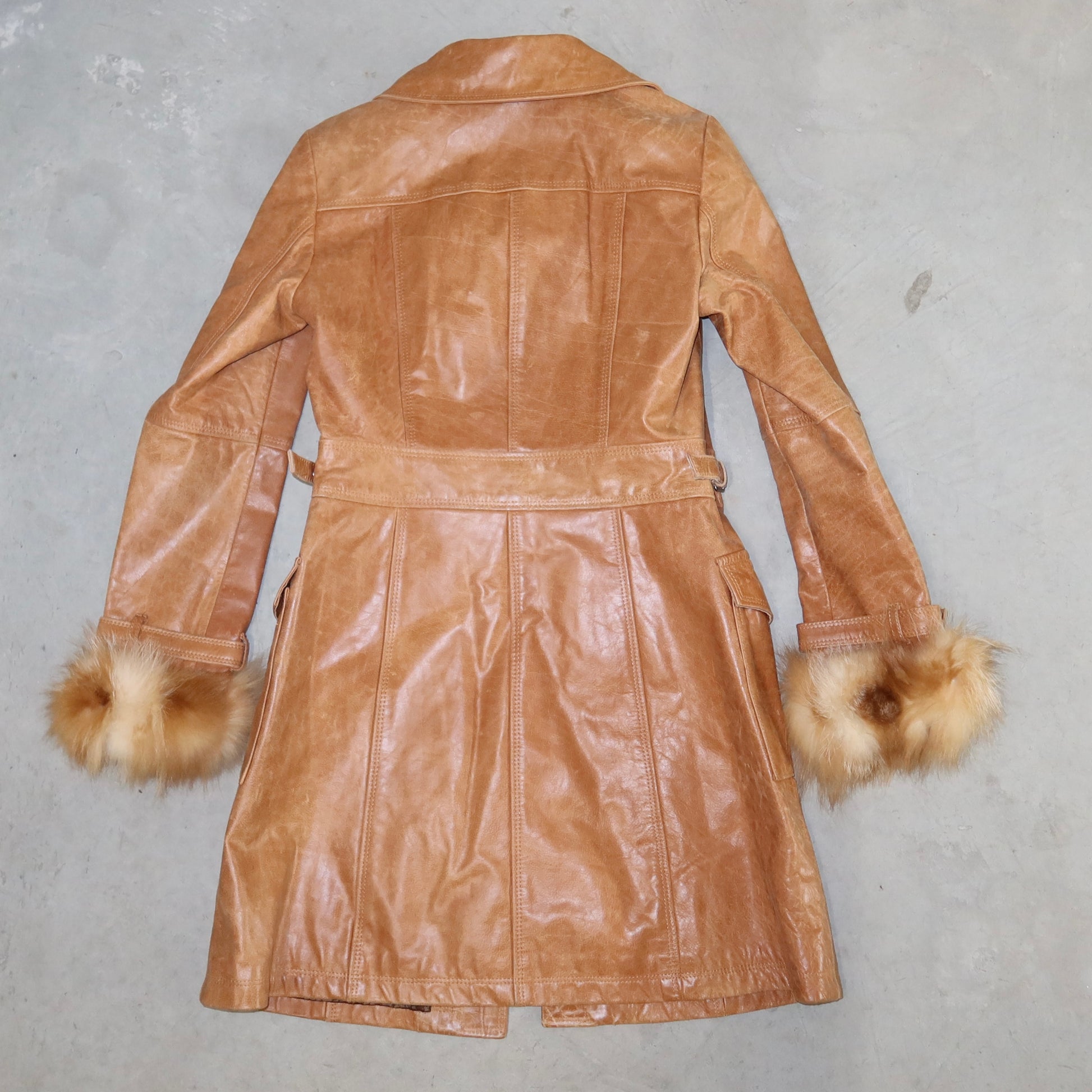 Gorgeous long brown leather coat by Burberry. Fox fur cuffs on the sleeves.