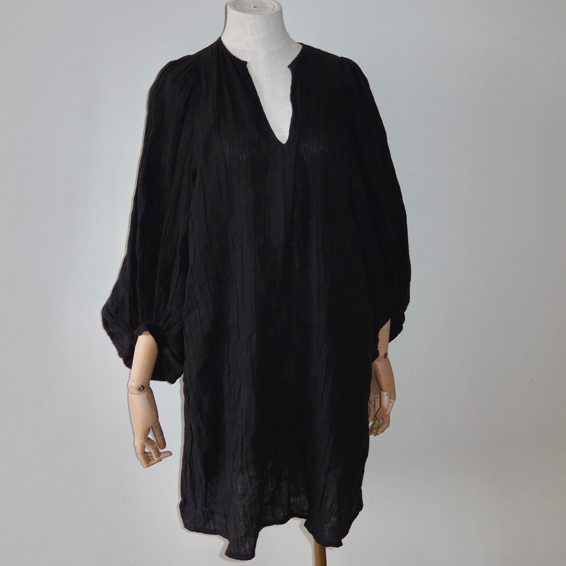 Beautiful black By Malene Birger shift style dress with exaggerated 3/4 length sleeves. Slight puff at the shoulders. Fabric tag removed but feels as though it is linen. Has pockets! *Gucci belt used as styling prop - not included*