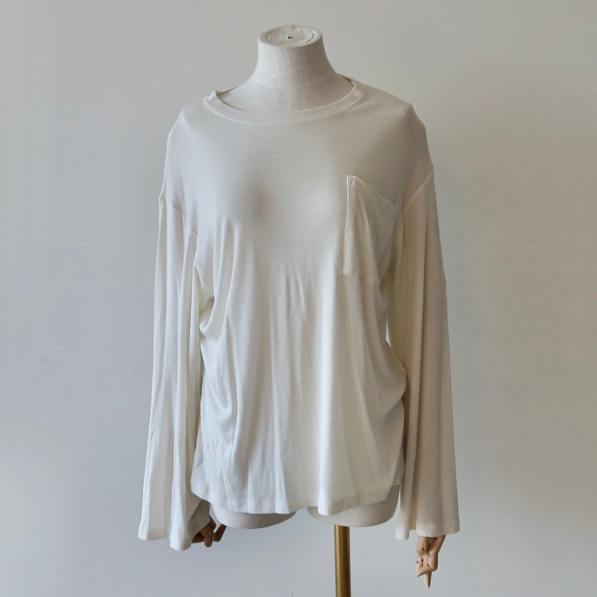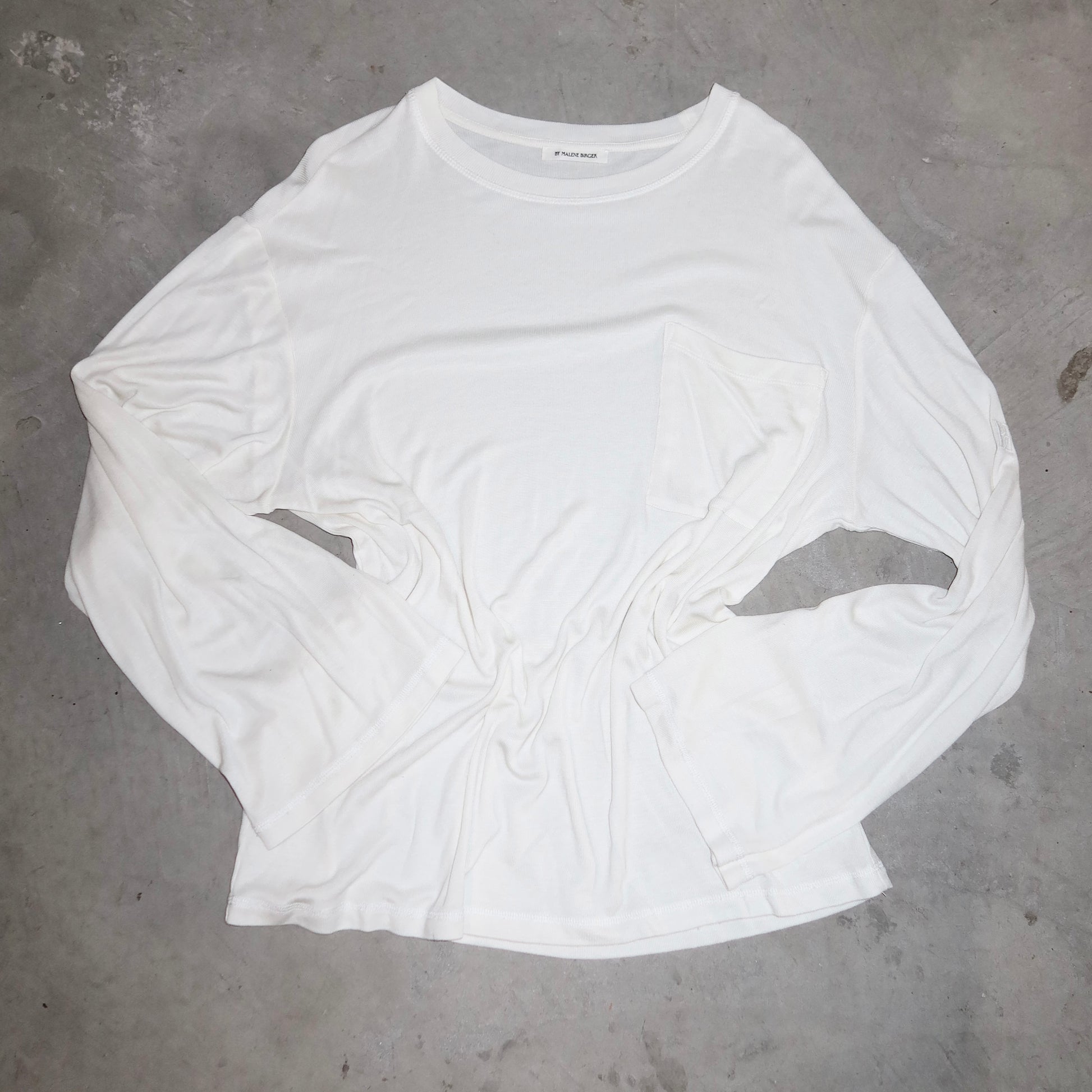 Gorgeous slinky white henley by Danish designer By Malene Birger. Perfect dropped shoulders and baggy fit with an embroidered BMB logo on the shoulder.