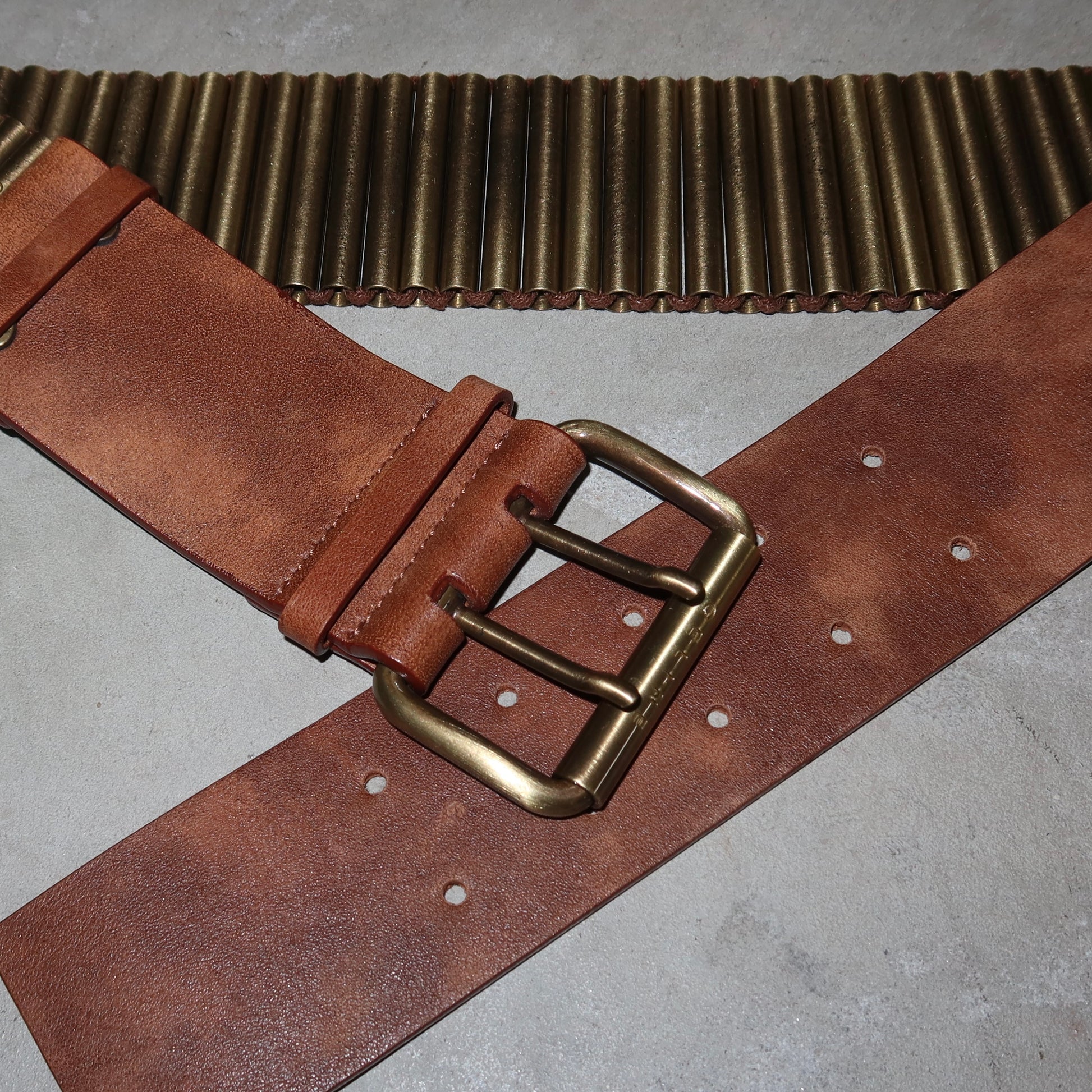 Beautiful Celine brown leather bullet casing belt from Michael Kors' SS2001 collection. These bullet casing pieces are very sought after and feature heavily on the SS2001 runway.