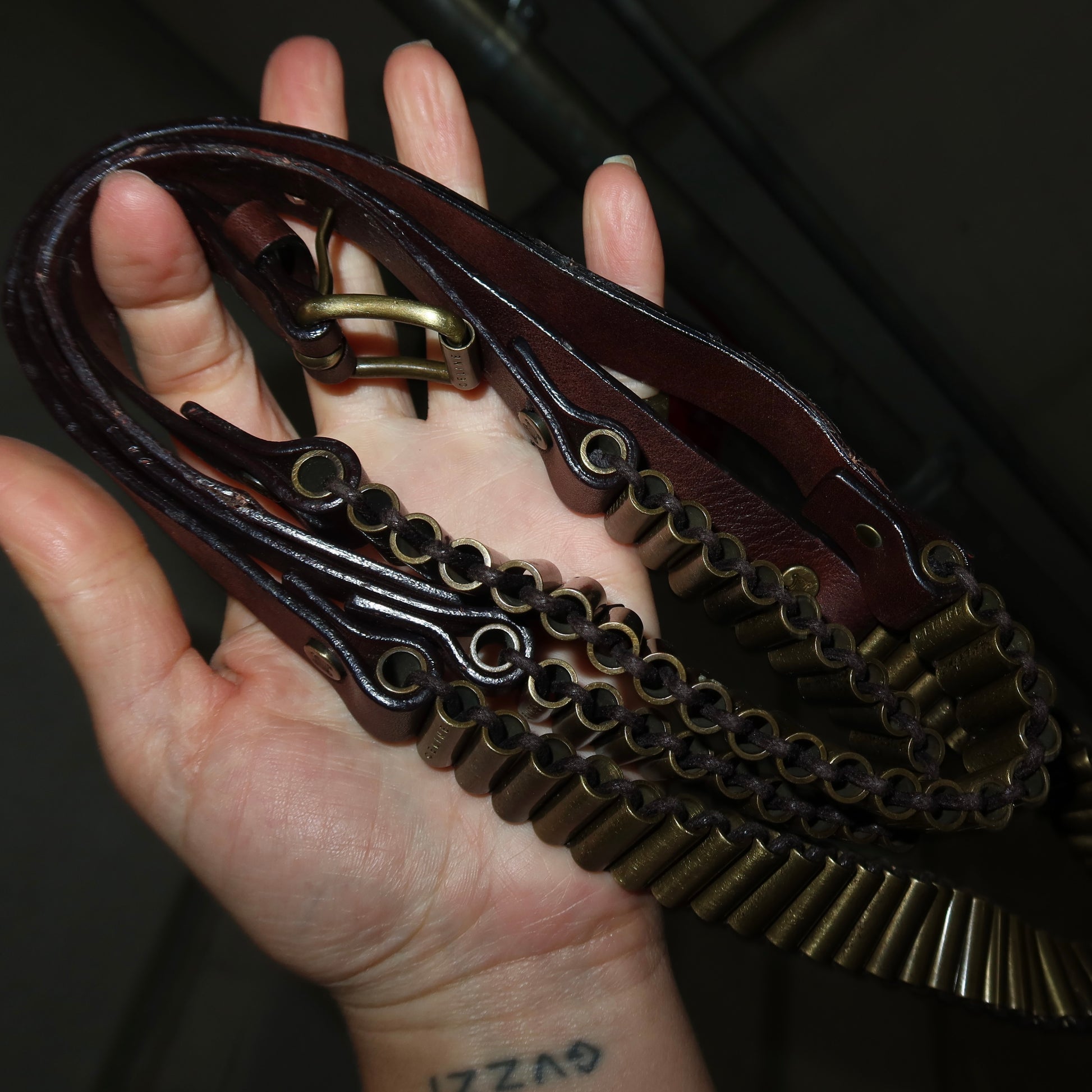 Sought after double wrap bullet casing belt from Michael Kors' SS2001 Celine show in dark brown. Pictured on Gisele Bundchen on the runway.