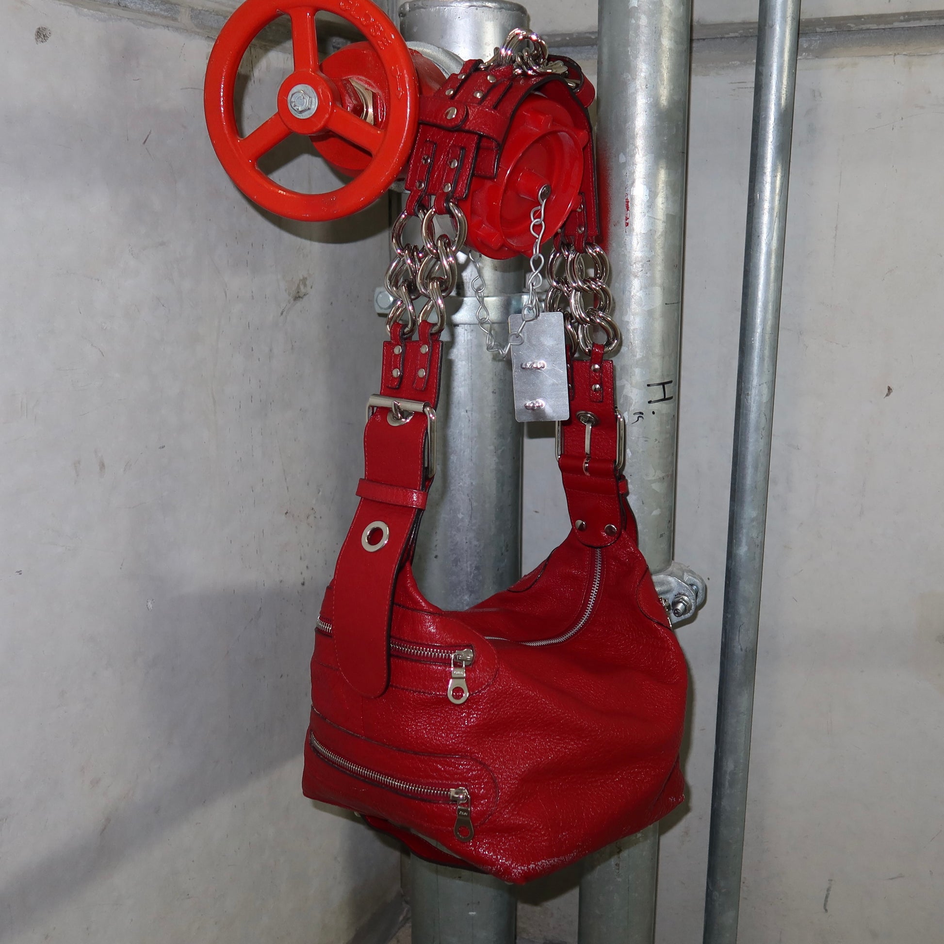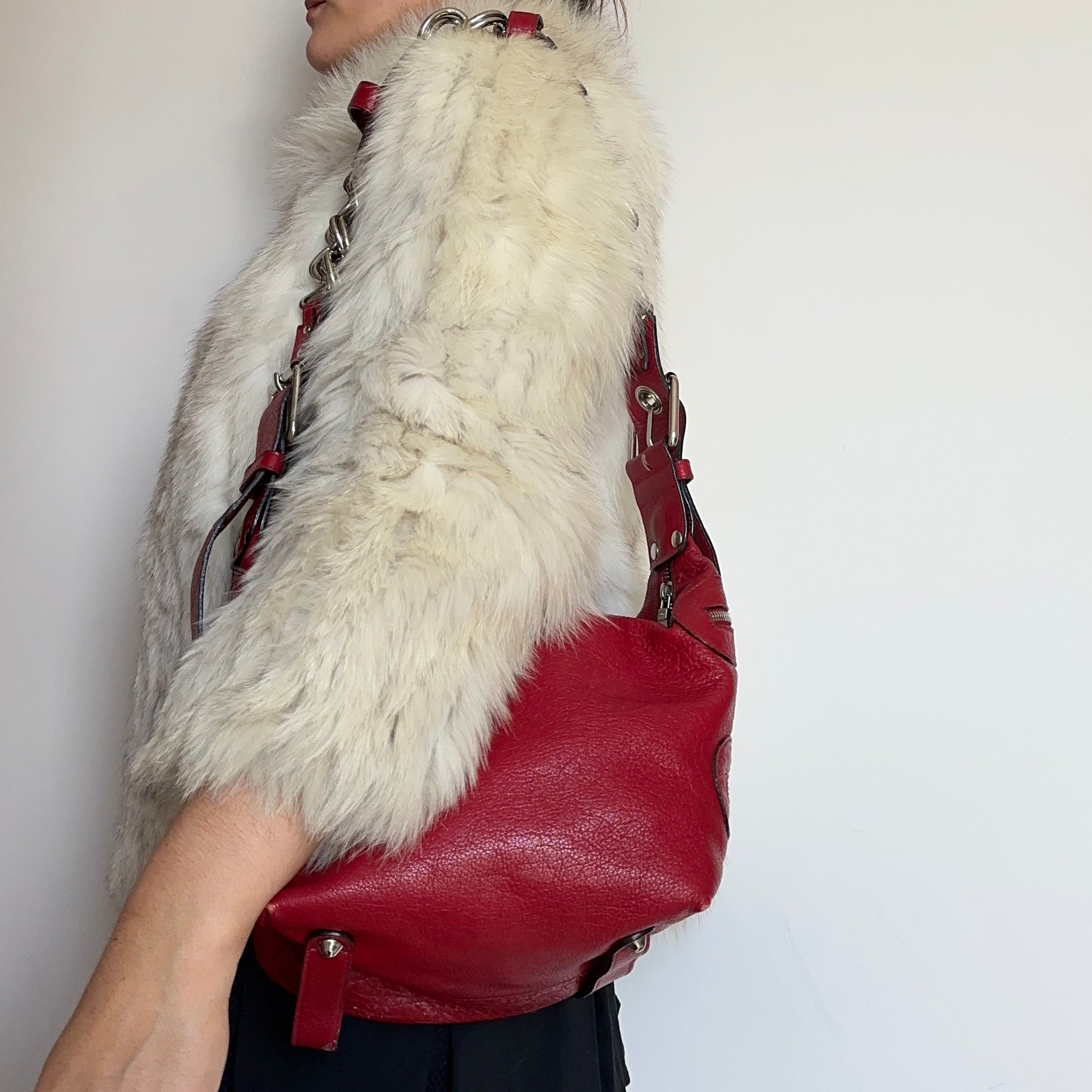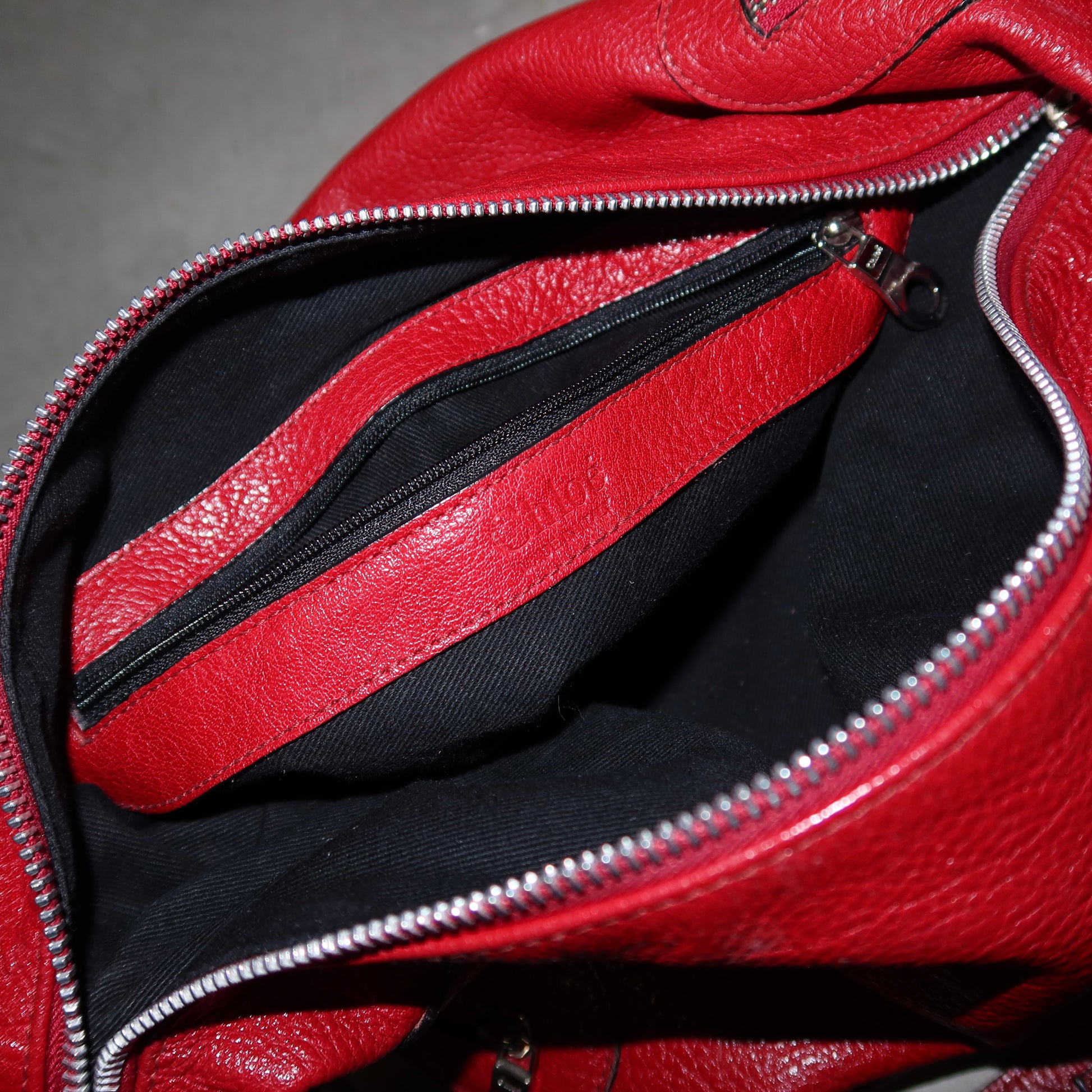 Incredibly rare Chloé AW2003 red leather camera bag, as seen on the runway. This gorgeous piece has heavy chain hardware, lots of pockets, and is guaranteed to fetch all the compliments. Can sit over the shoulder or cross body. This is a very rare and sought after bag.