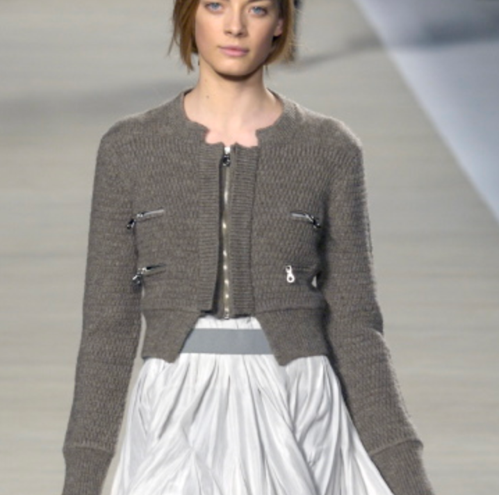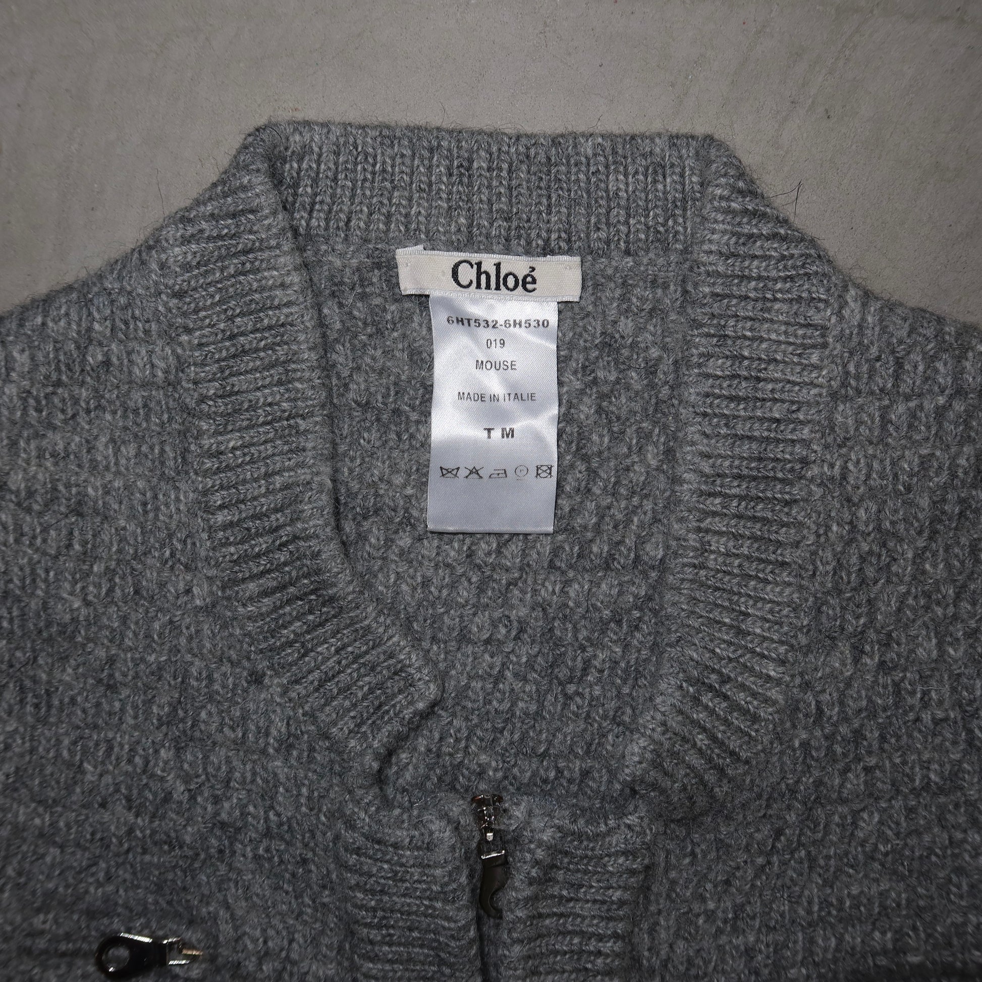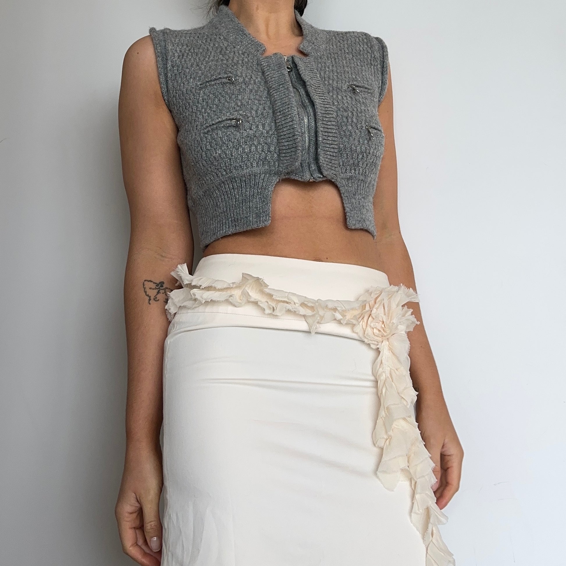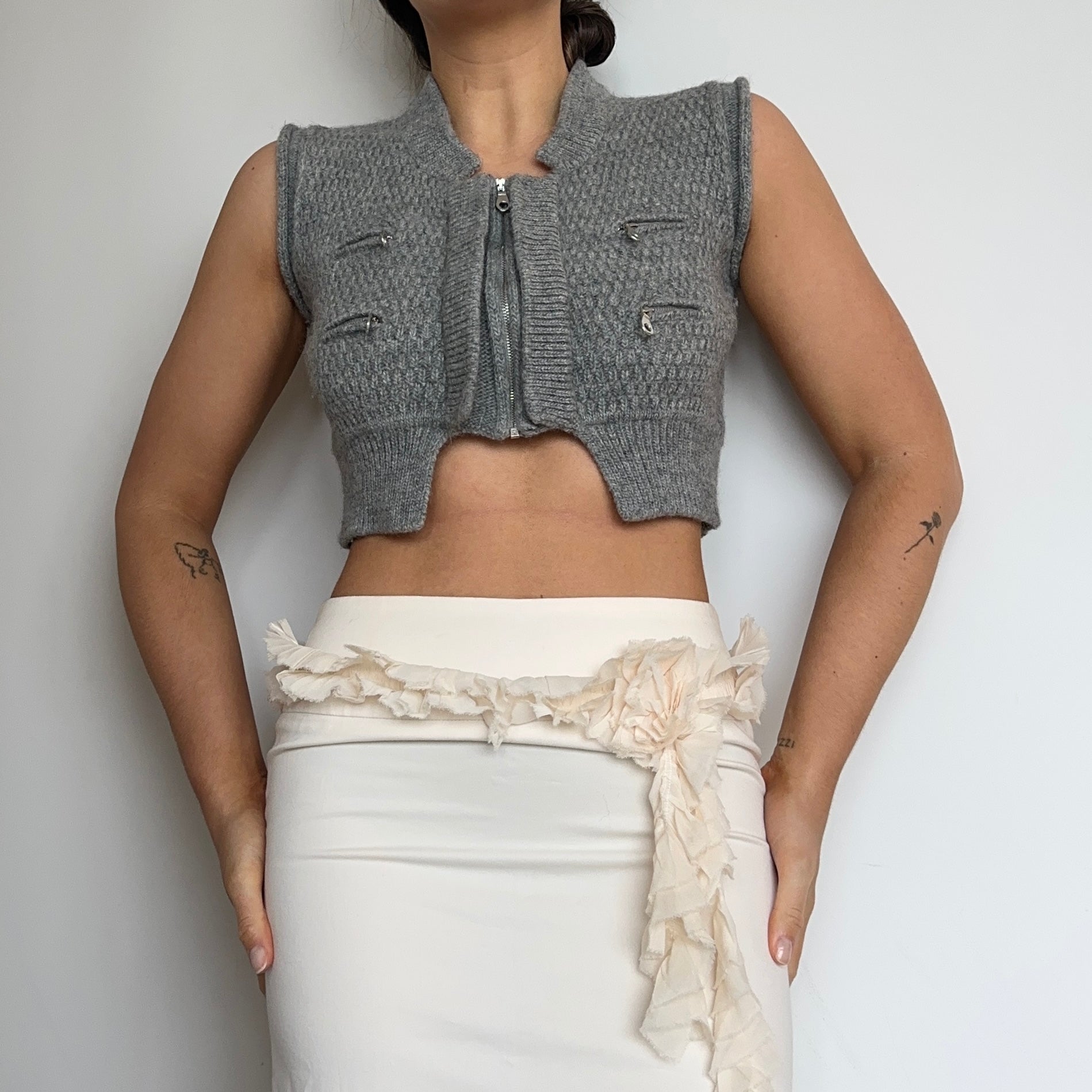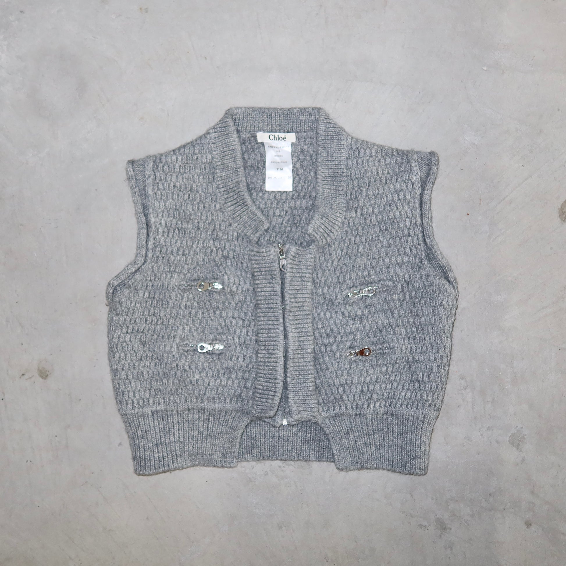 The coolest little cropped light grey knitted gilet by Chloé, from Phoebe Philo's AW2006 collection. A long sleeved version was pictured on the runway.