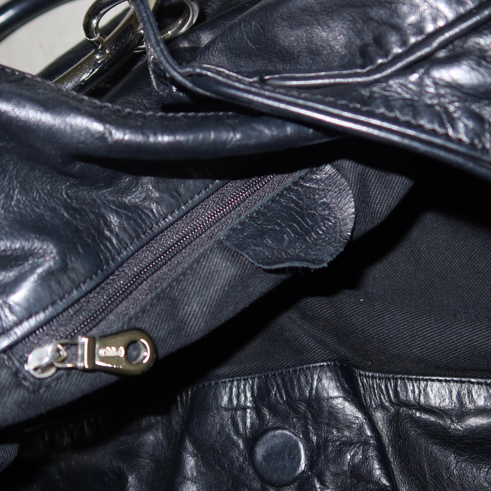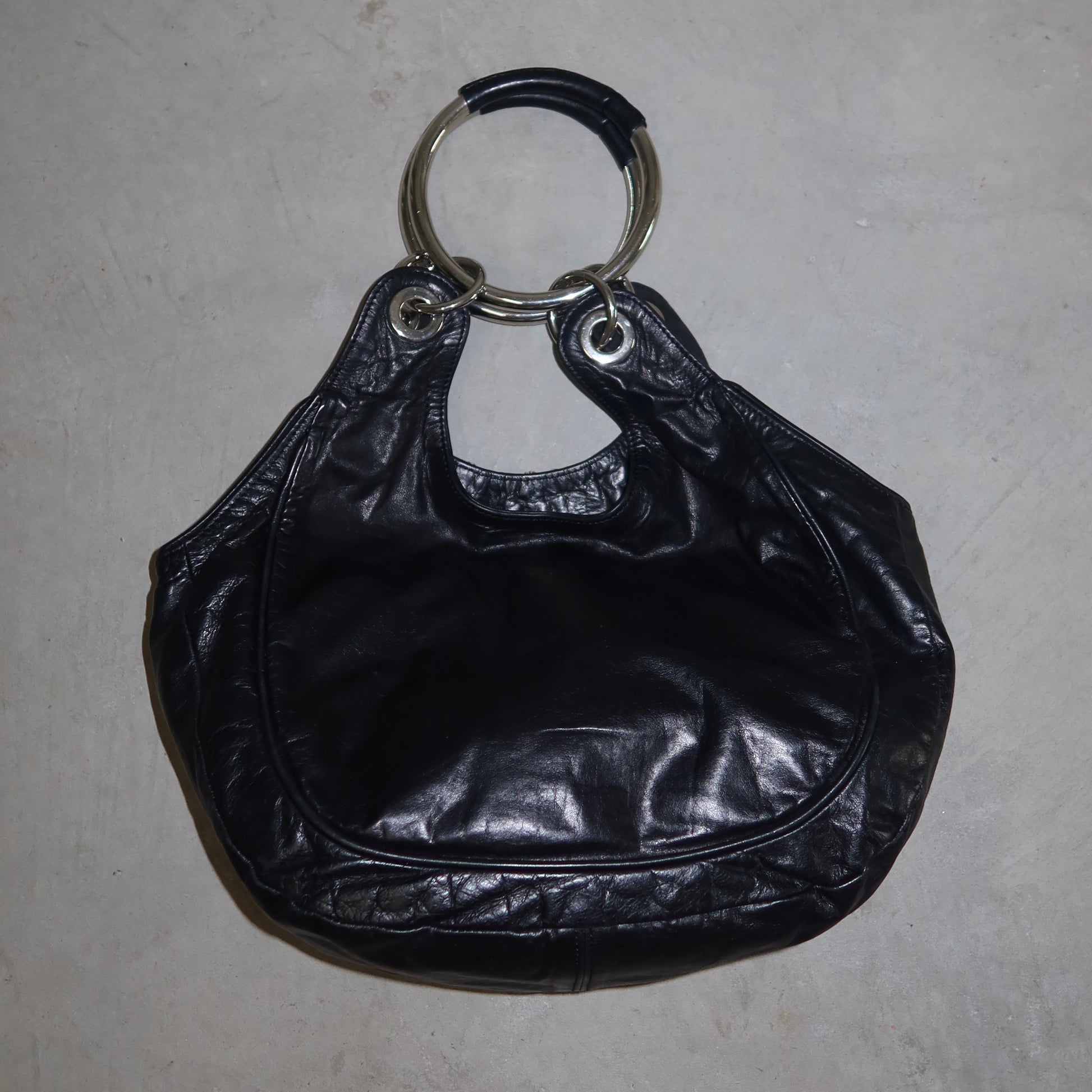 Beautiful rare black leather Chloé bracelet bag with black tapestry detail. From Phoebe Philo's era. Beautiful silver ring handle details. Does not fit over the shoulder unless you have tiny noodle arms...