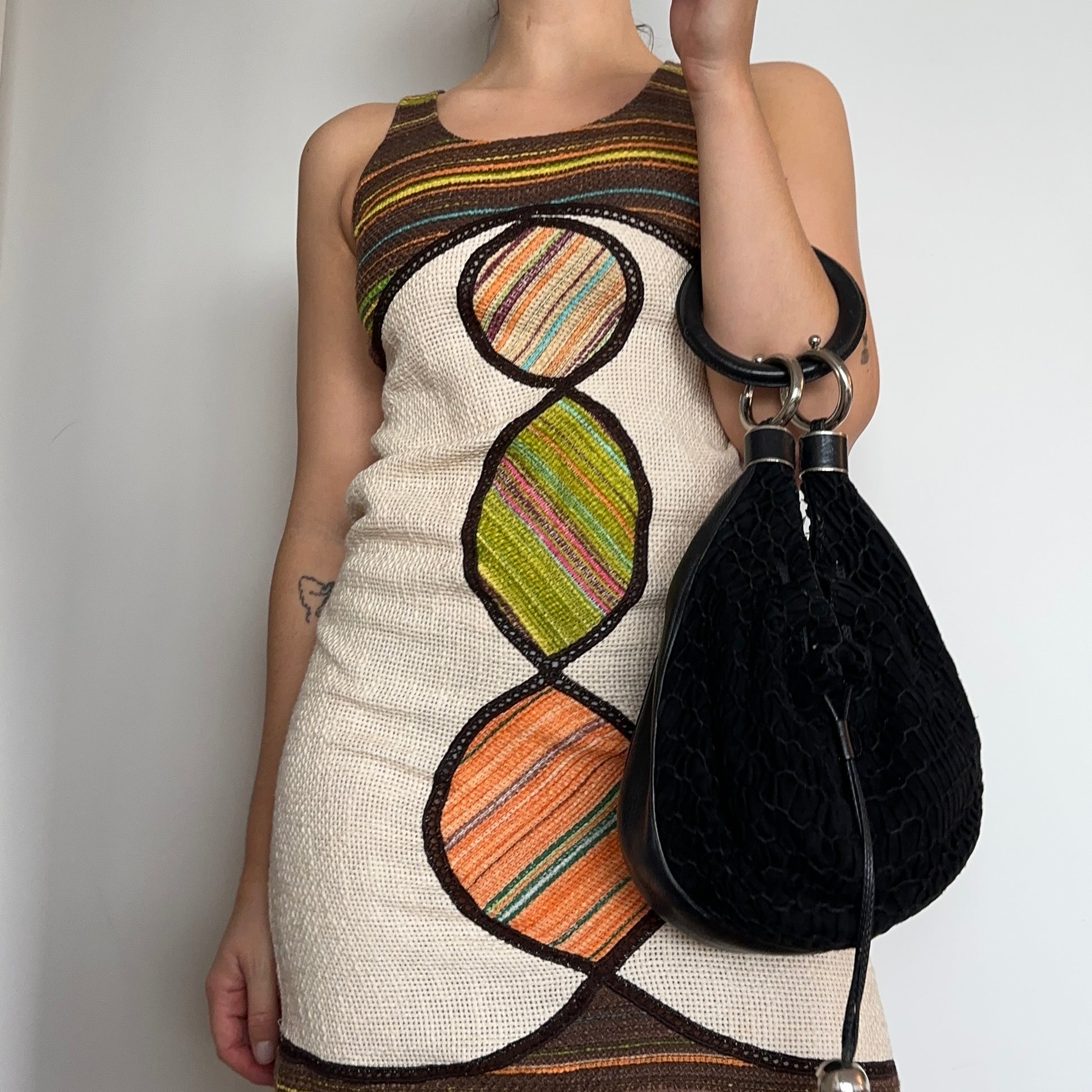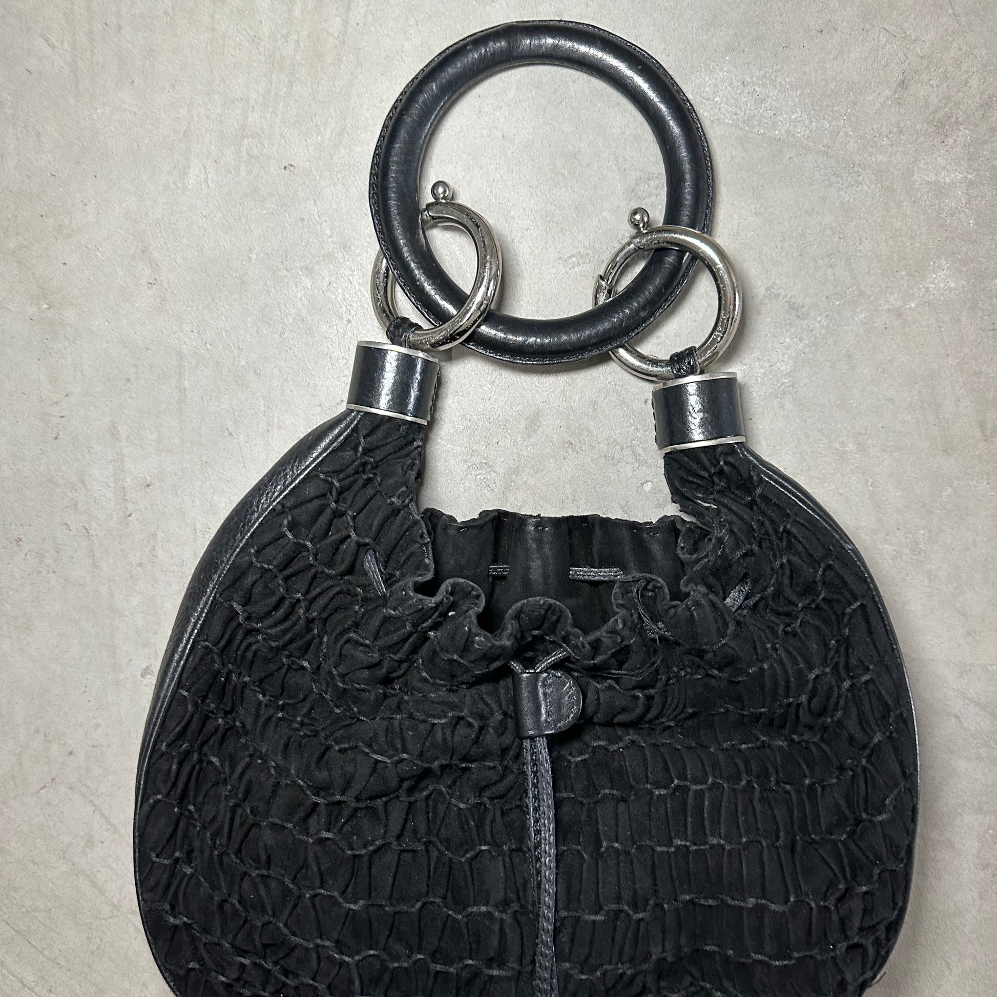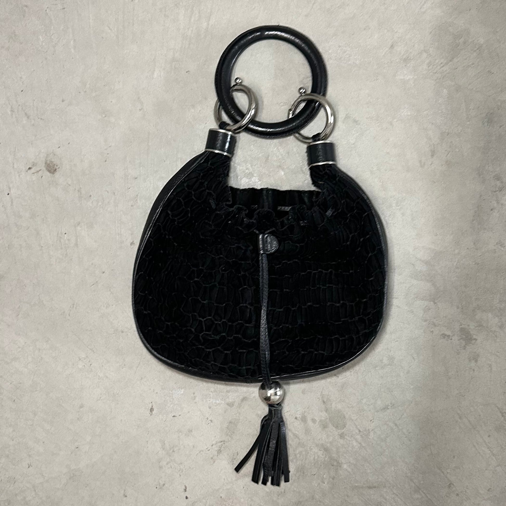Gorgeous black ruched-effect suede Chloé bracelet bag. Leather drawstring detail with heavy metal bead on the end. Leather covered bracelet handle. Rare find.