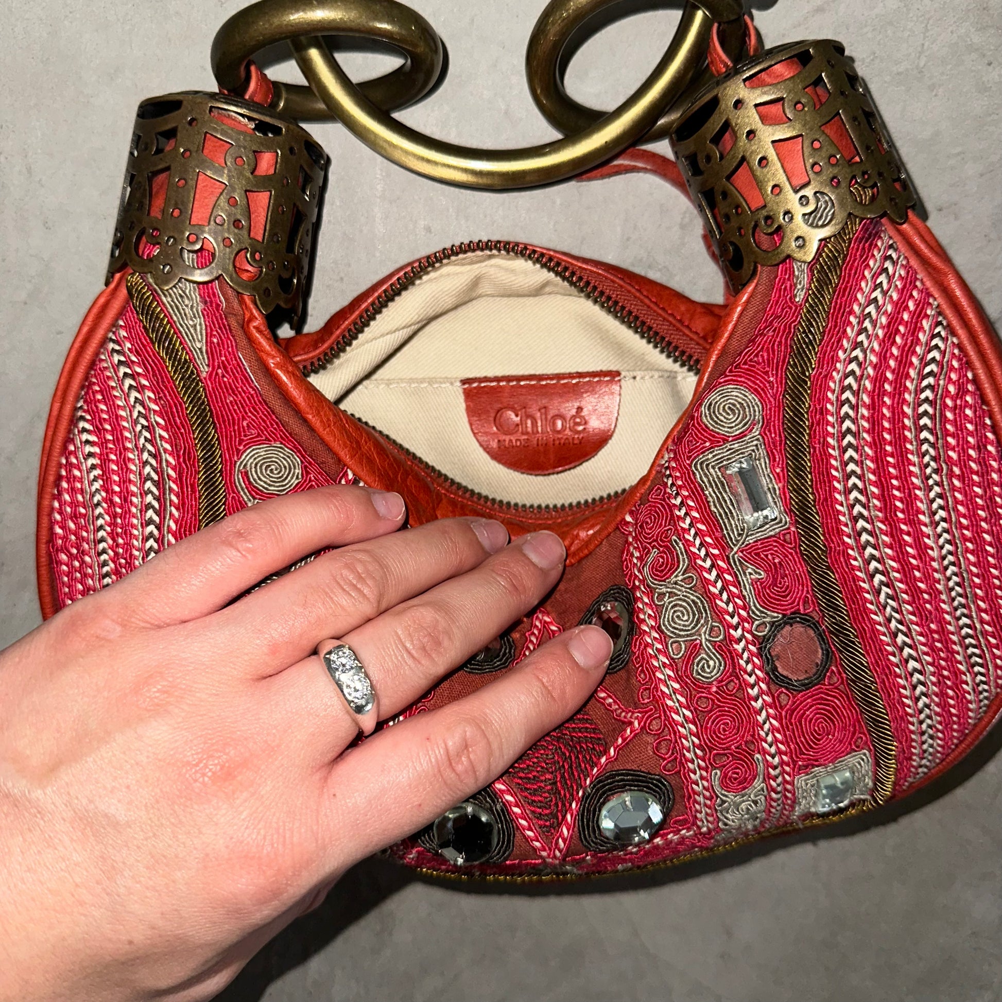 Gorgeous tapestry style embellished Chloe bag from Phoebe Philo's era. This model is notoriously hard to find and WE KEEP GETTING LUCKY! Typically, bracelet bags by Phoeve Philo resell for A$1000+ and there are very few multiples of each colourway. This particular model has the option of a plain leather handle or bracelet style handle.