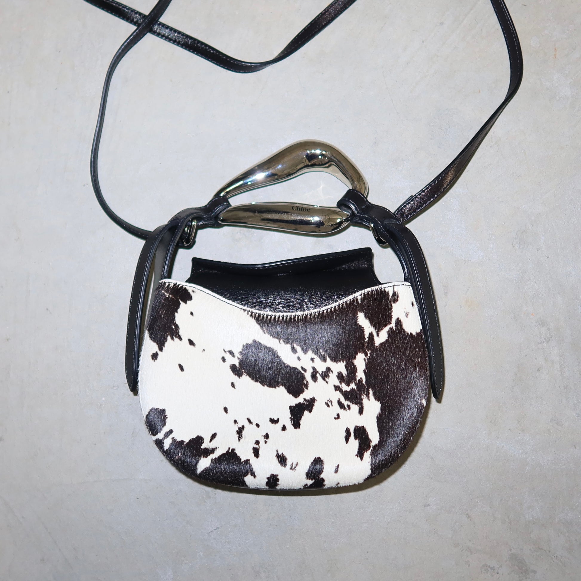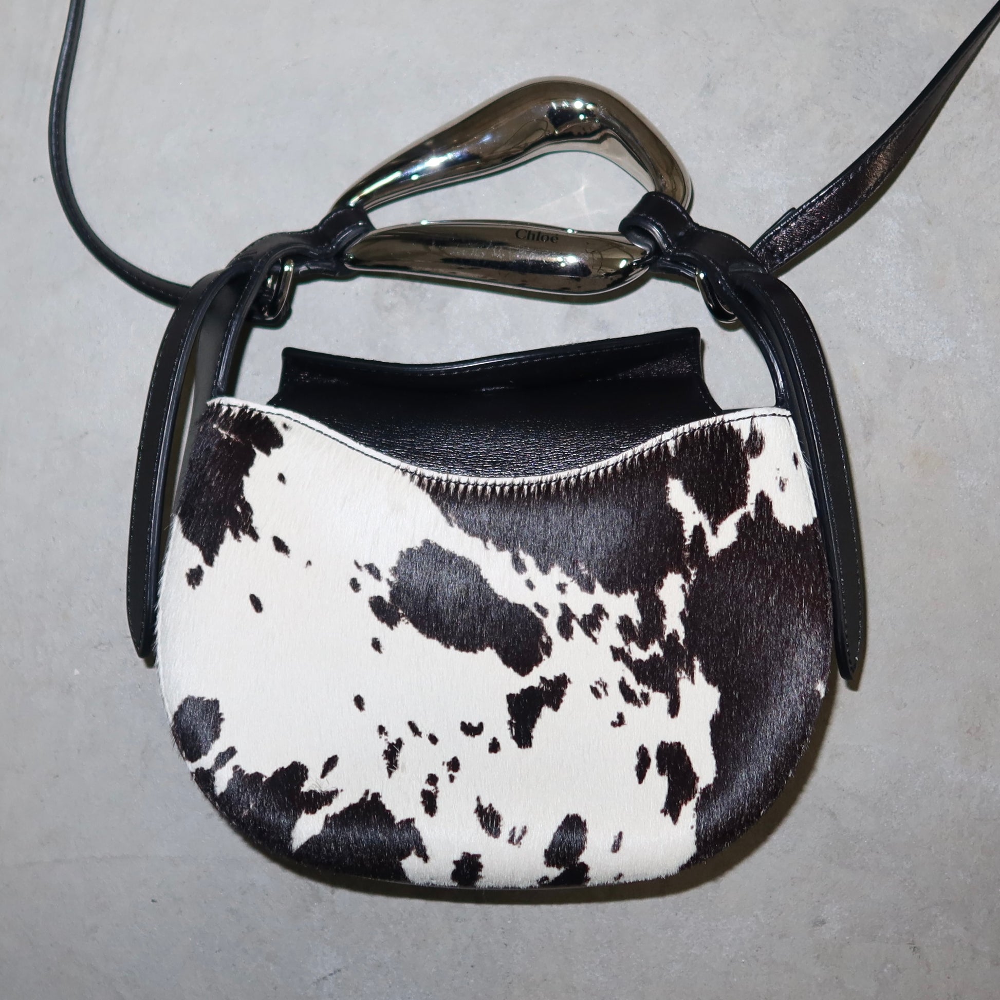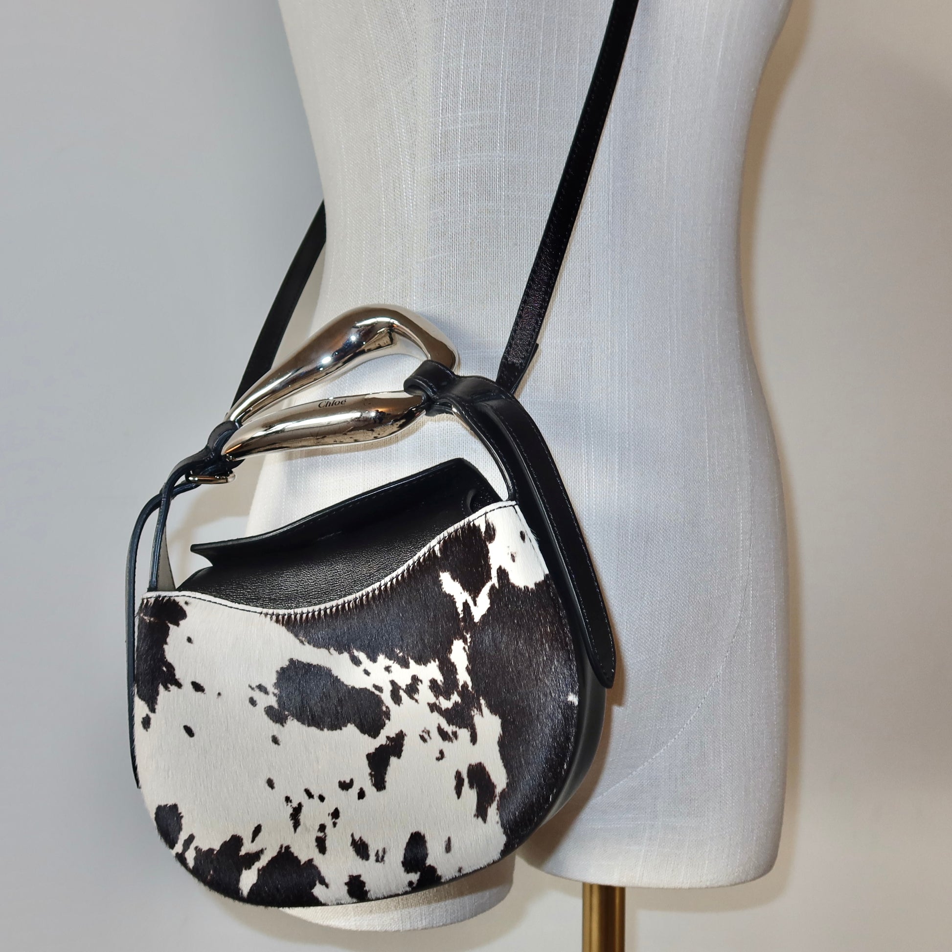 Gorgeous Chloé small Kiss bag from 2021. Black and white cowhide with abstract silver ring handle and longer strap to wear across the body.
