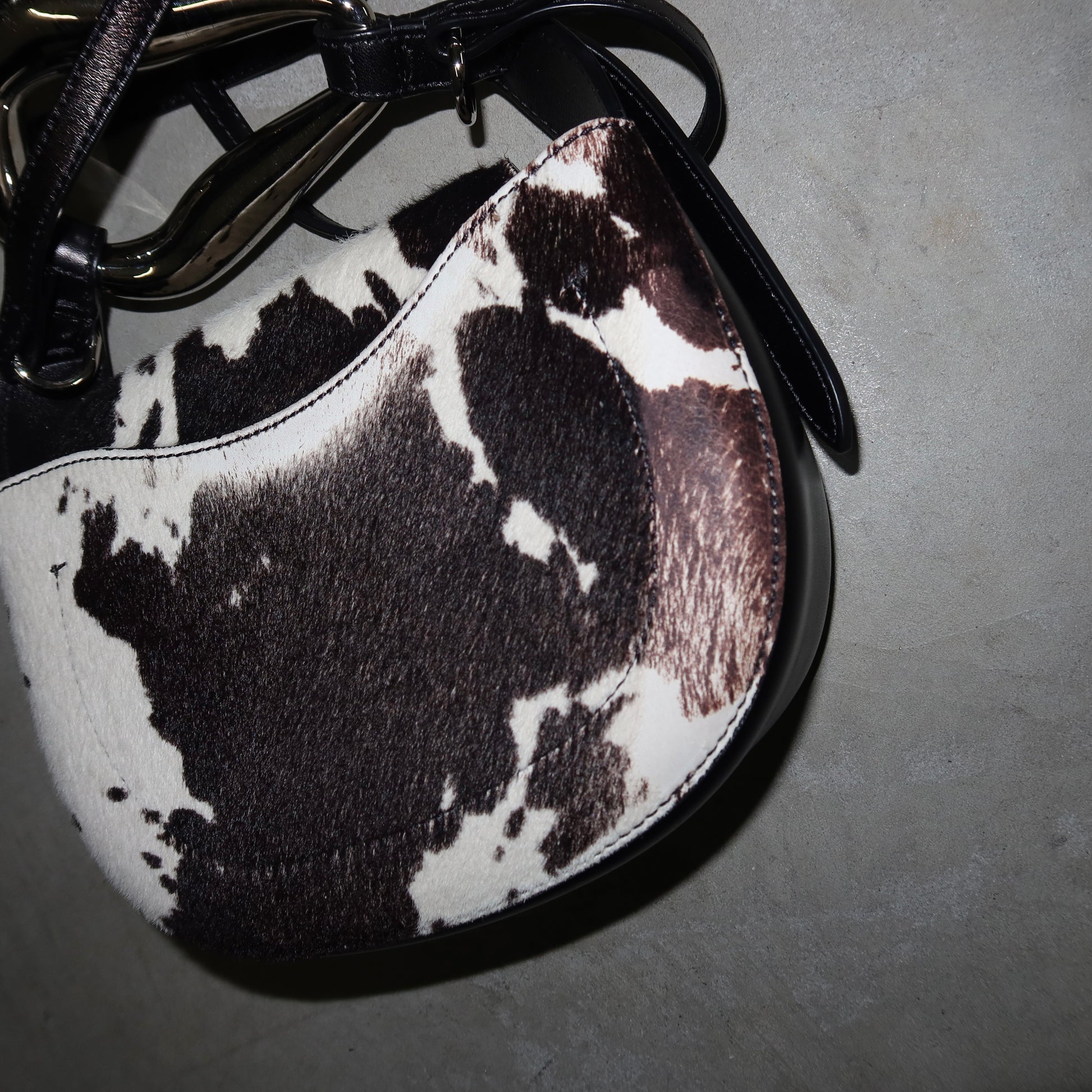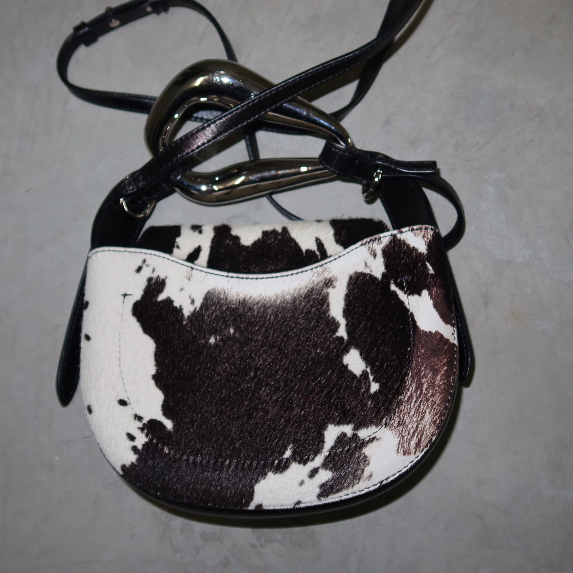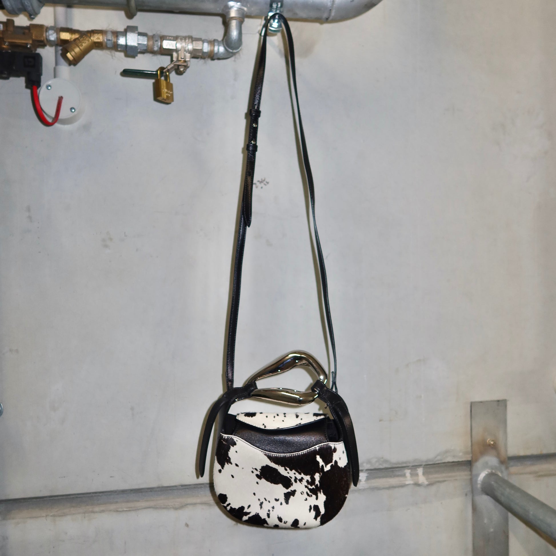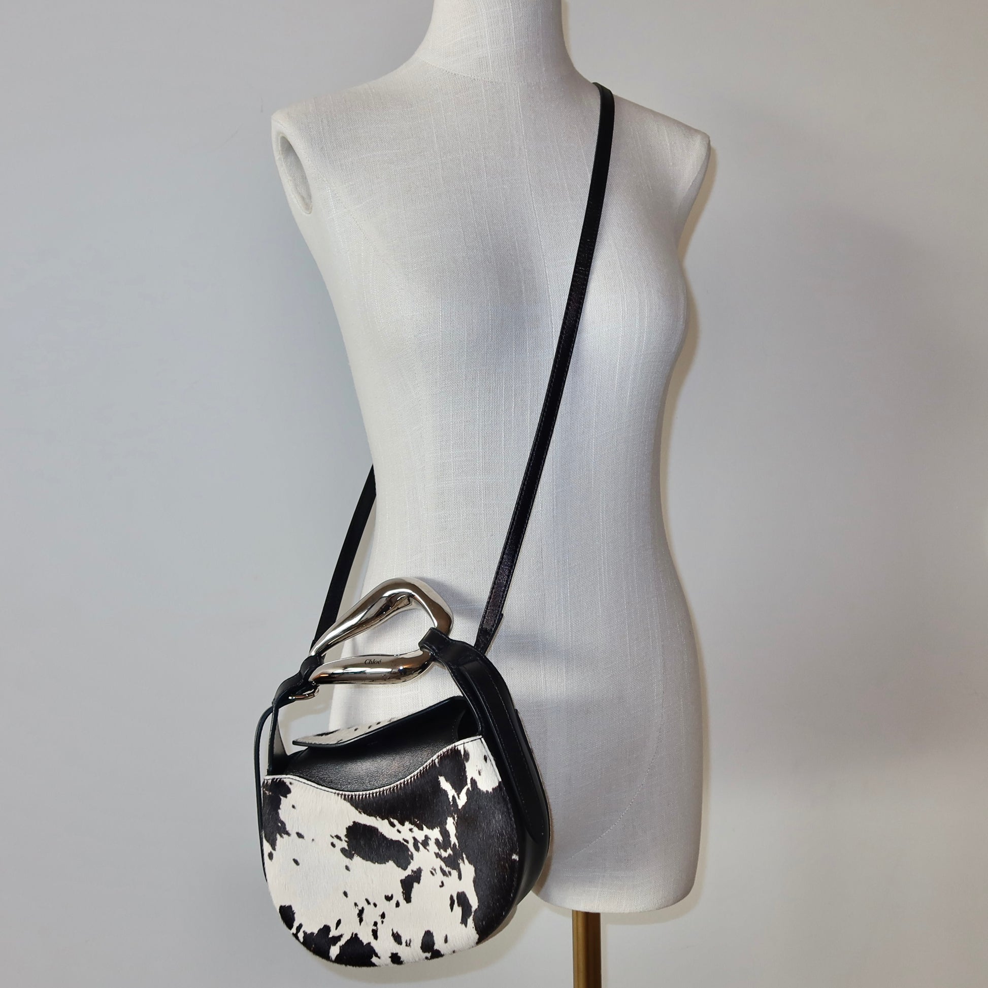 Gorgeous Chloé small Kiss bag from 2021. Black and white cowhide with abstract silver ring handle and longer strap to wear across the body.