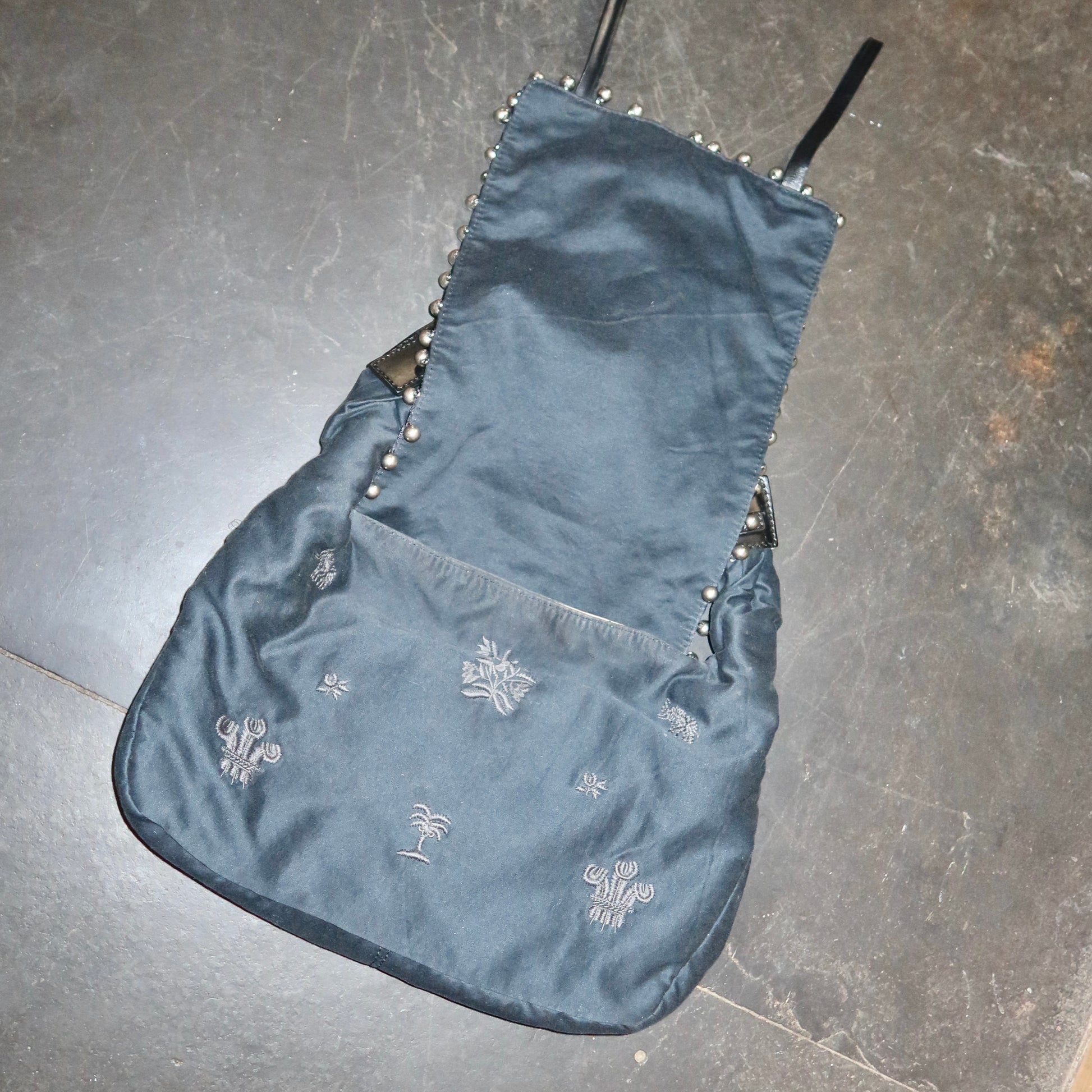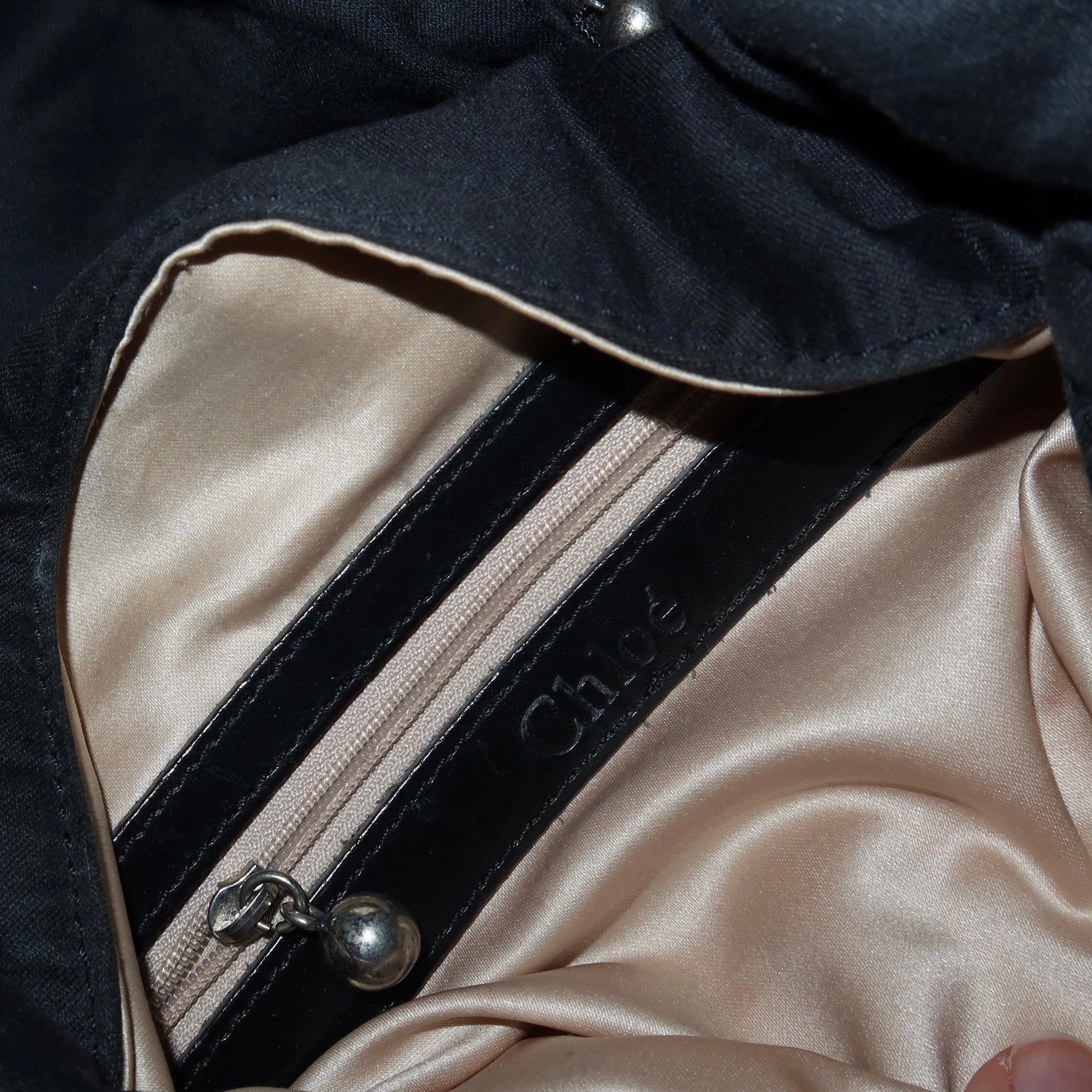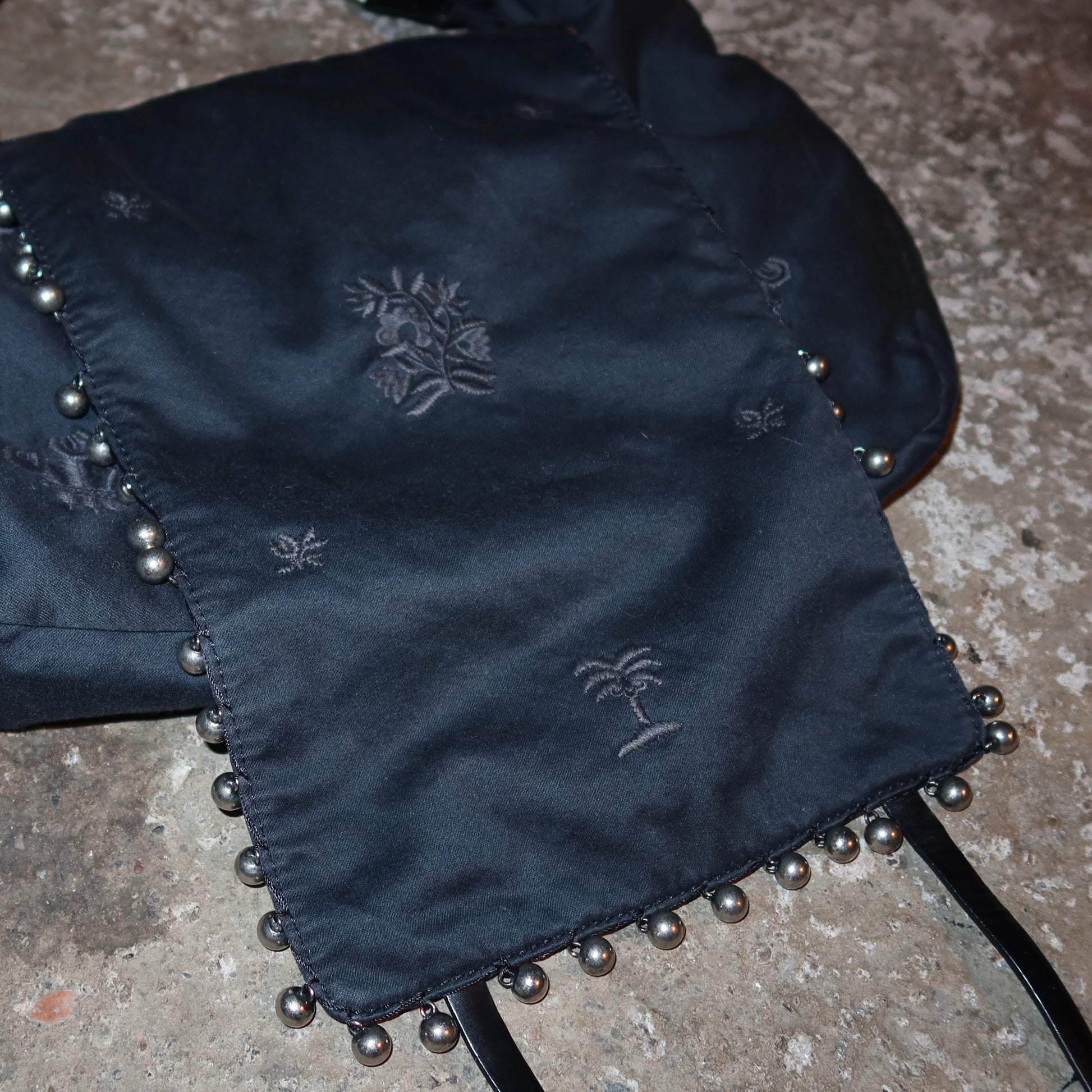 Chloé black cotton bracelet bag with embroidery. Gorgeous weighty beads line the hem of the front flap. Hidden magnet closure on interior.