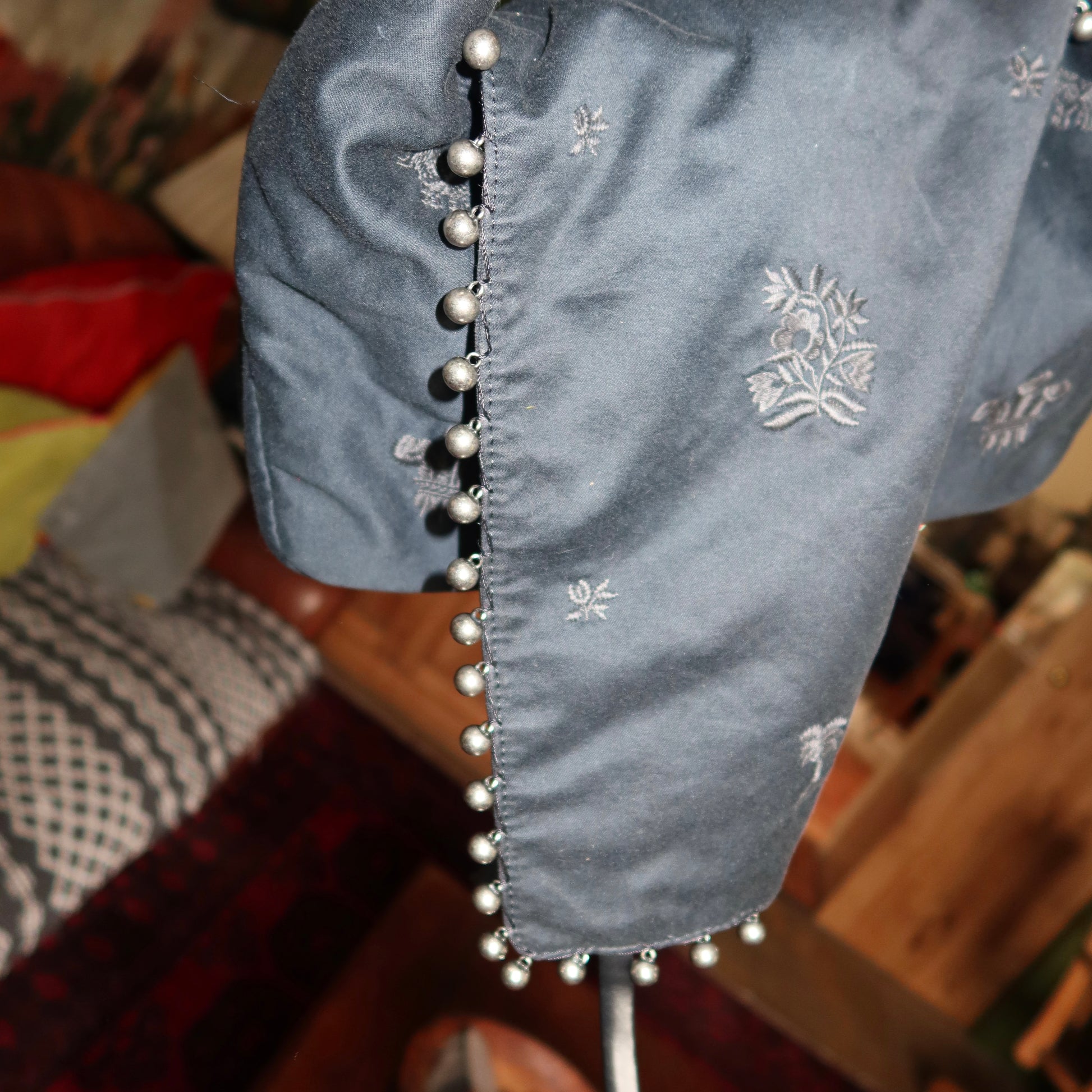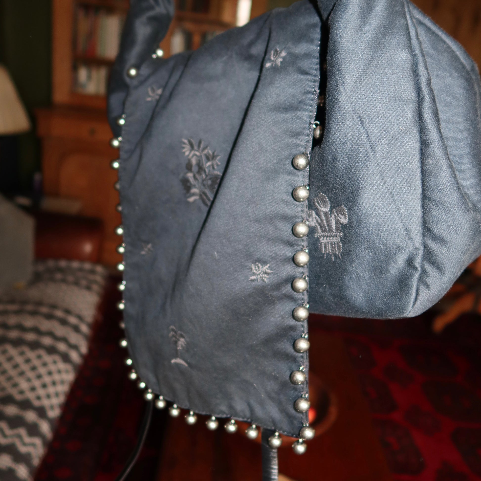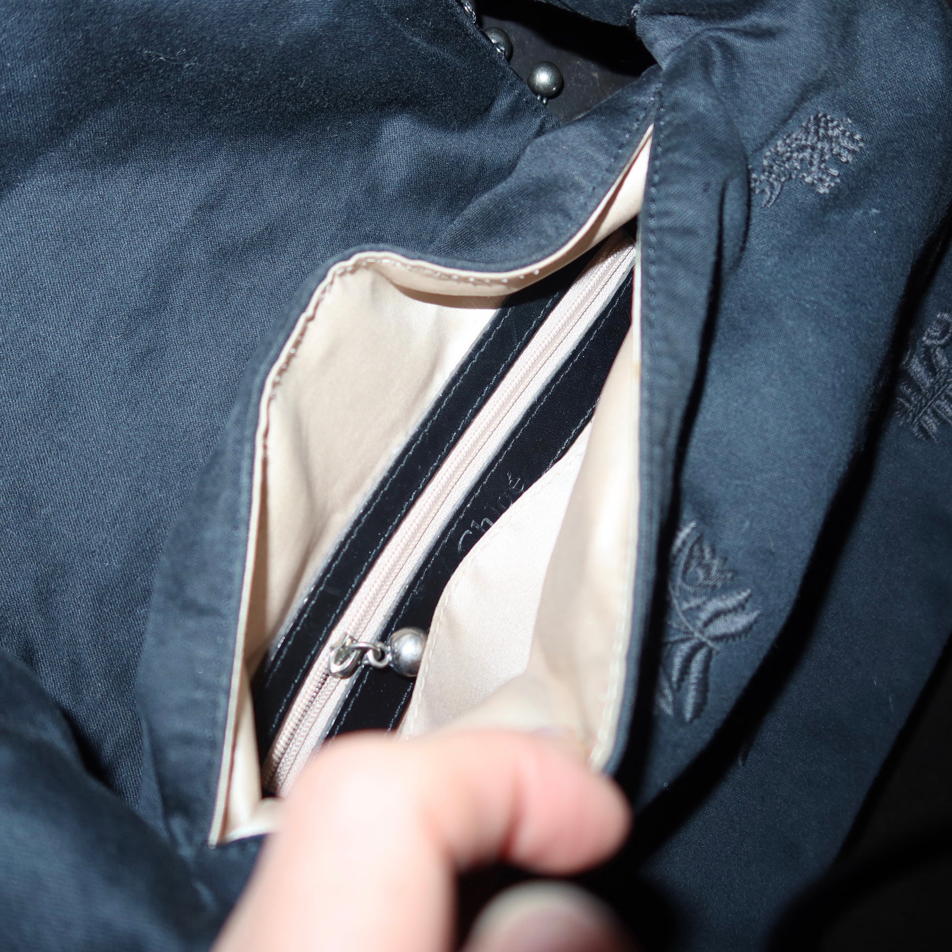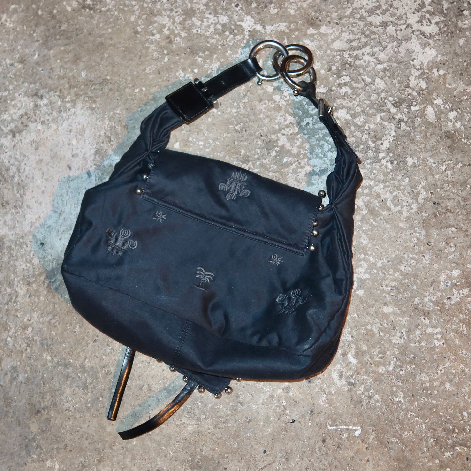 Chloé black cotton bracelet bag with embroidery. Gorgeous weighty beads line the hem of the front flap. Hidden magnet closure on interior.