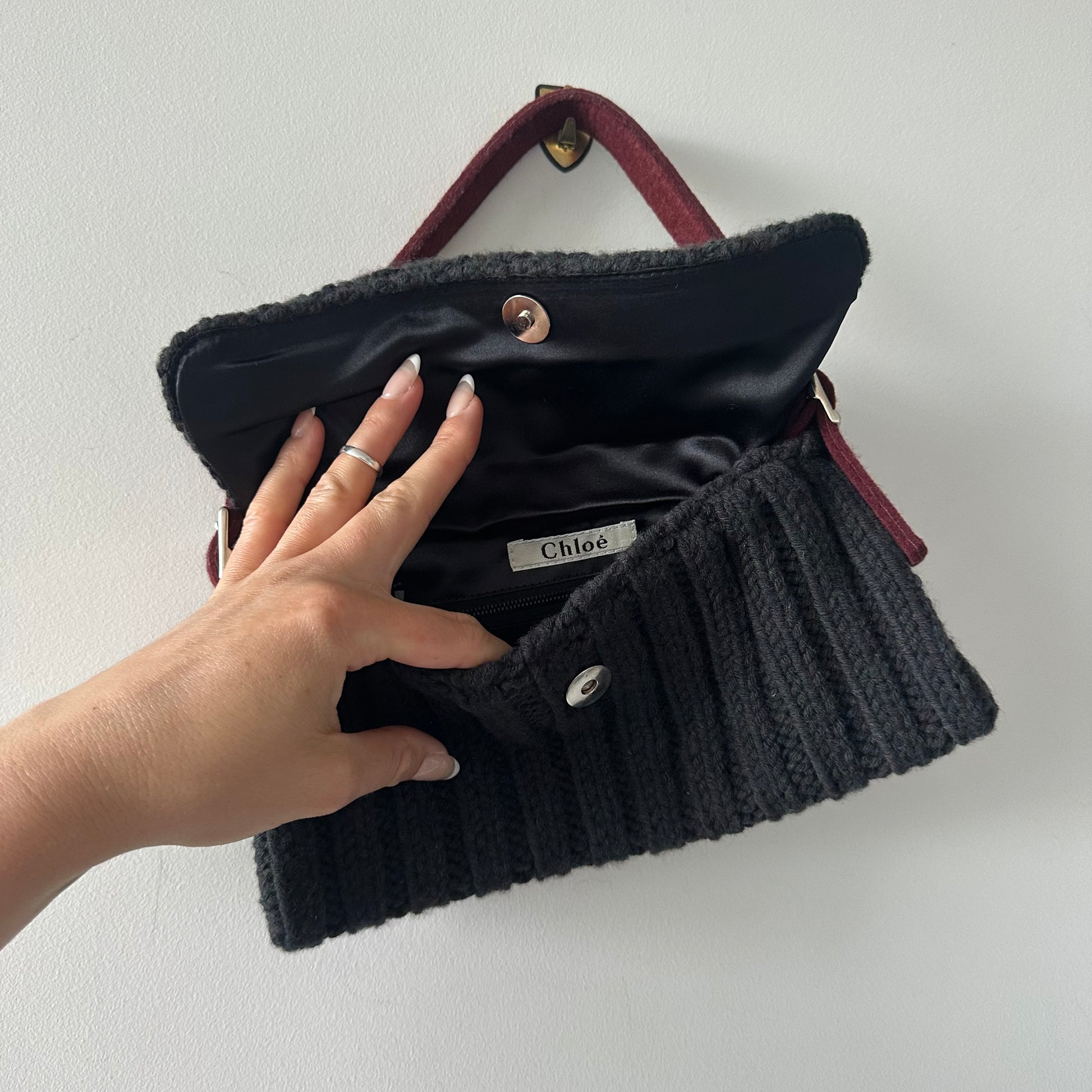 The cutest navy knitted Chloe bag from Stella McCartney's reign with the brand. These iconic little numbers are super hard to find! Varsity style patch with the letter C.