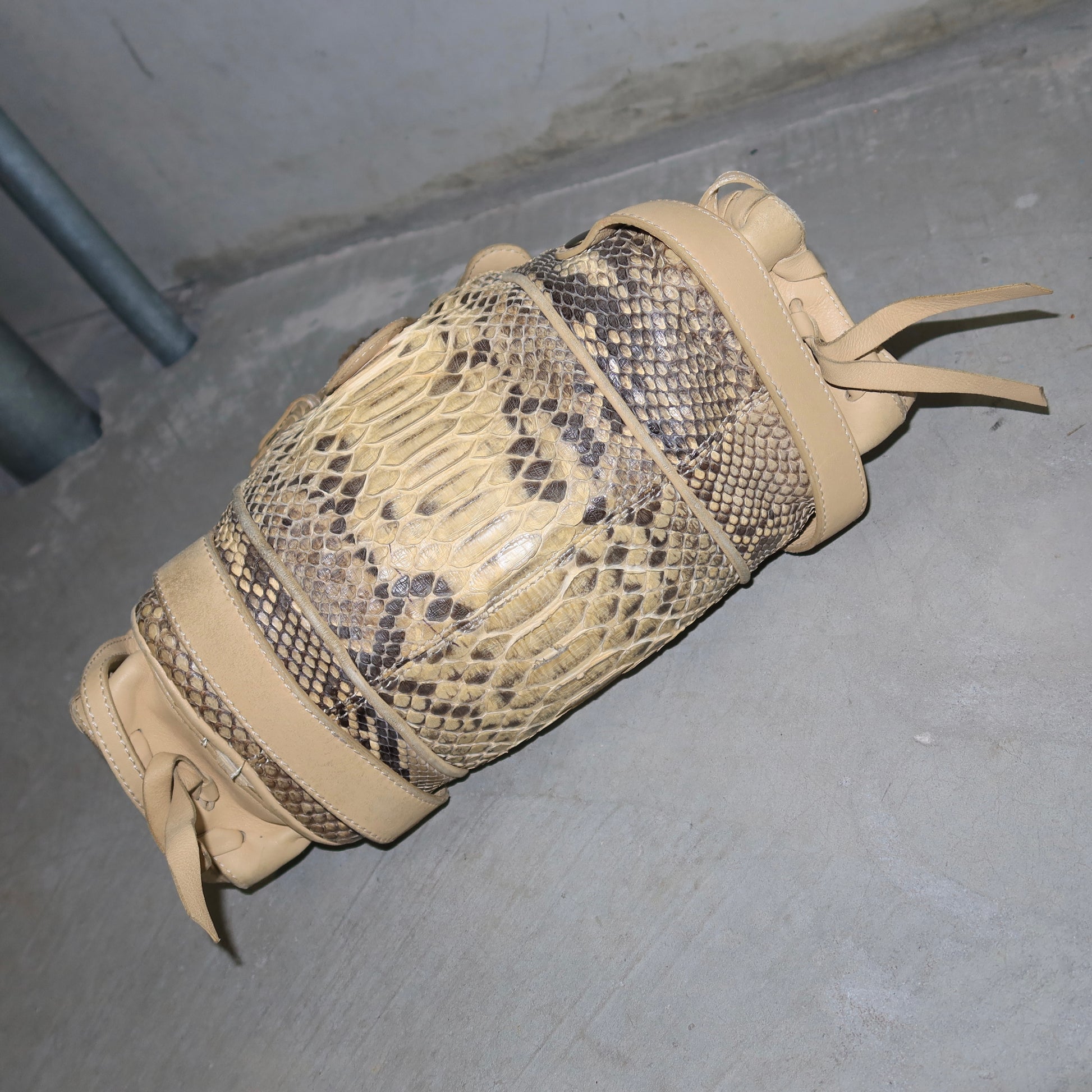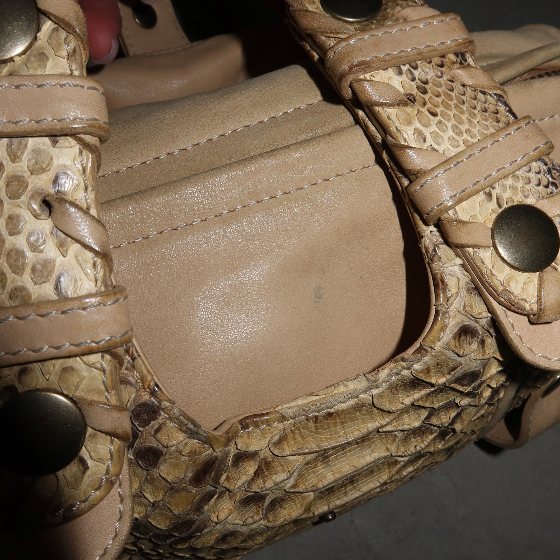 Good vintage condition. She has been well loved so you can see darkening on the handles from wear but it appears worse under flash. Some marks on the beige interior but nothing major. The python exterior is in great condition.