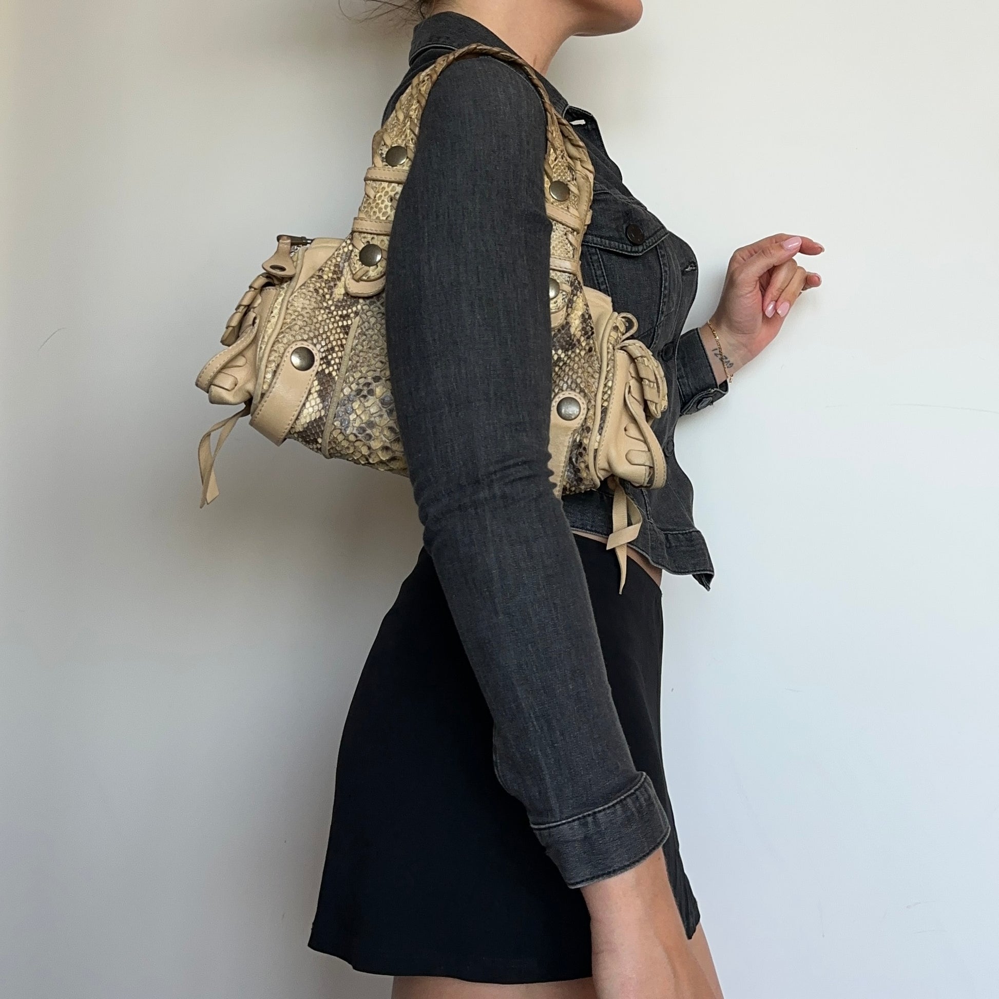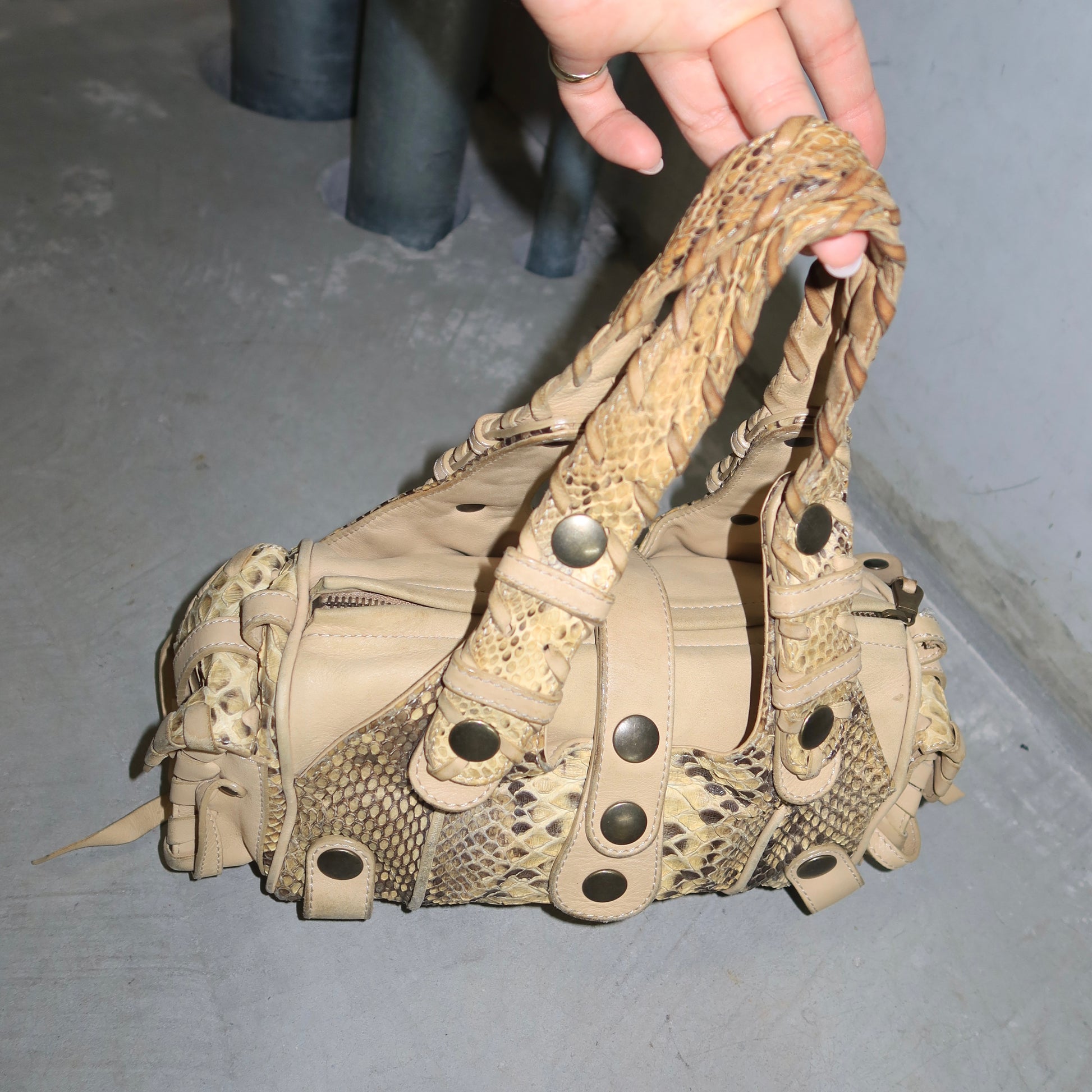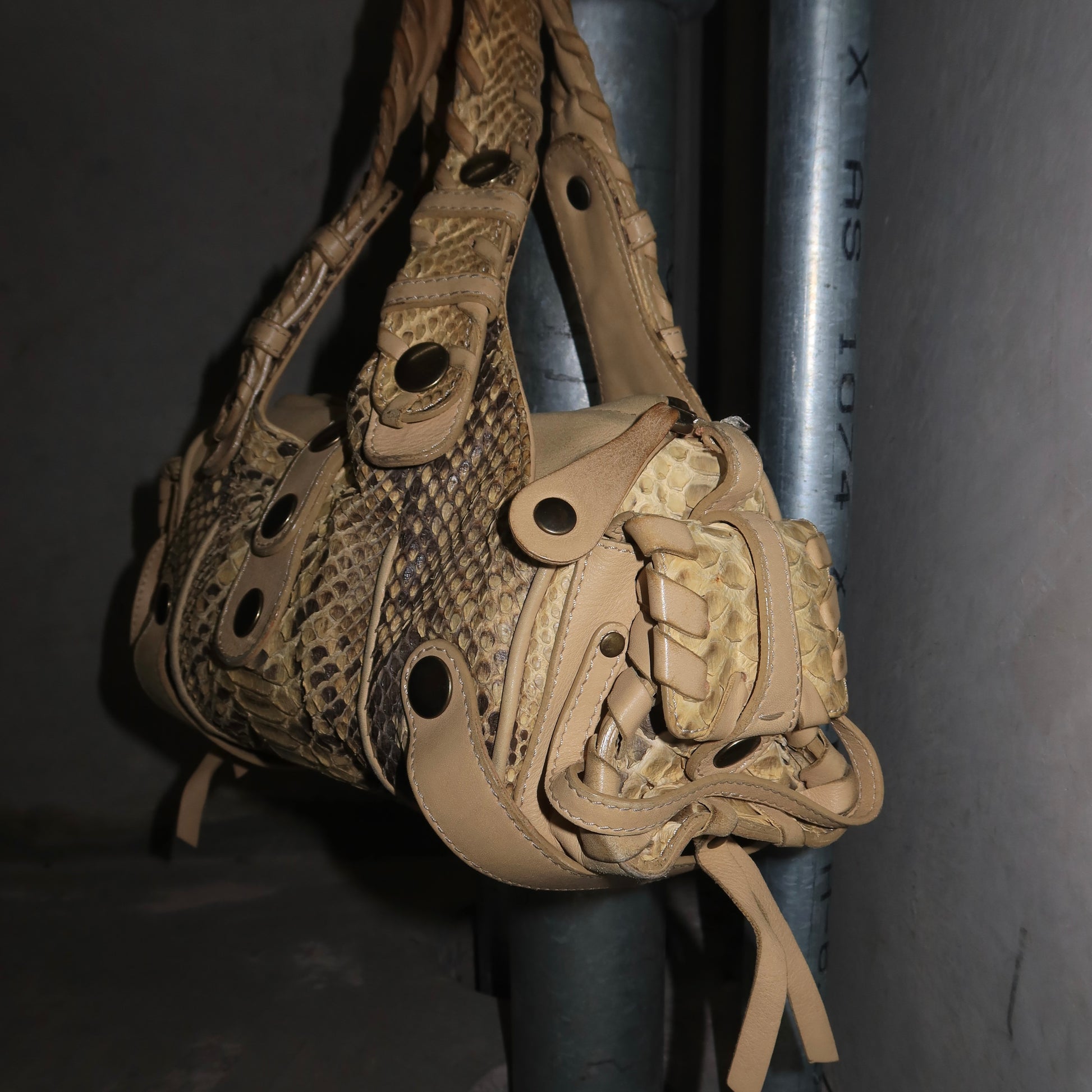 Insanely gorgeous mini Chloé Silverado in real python. Can fit on the shoulder but is very snug!! Would recommend best for the nook of the elbow or as a handbag.
