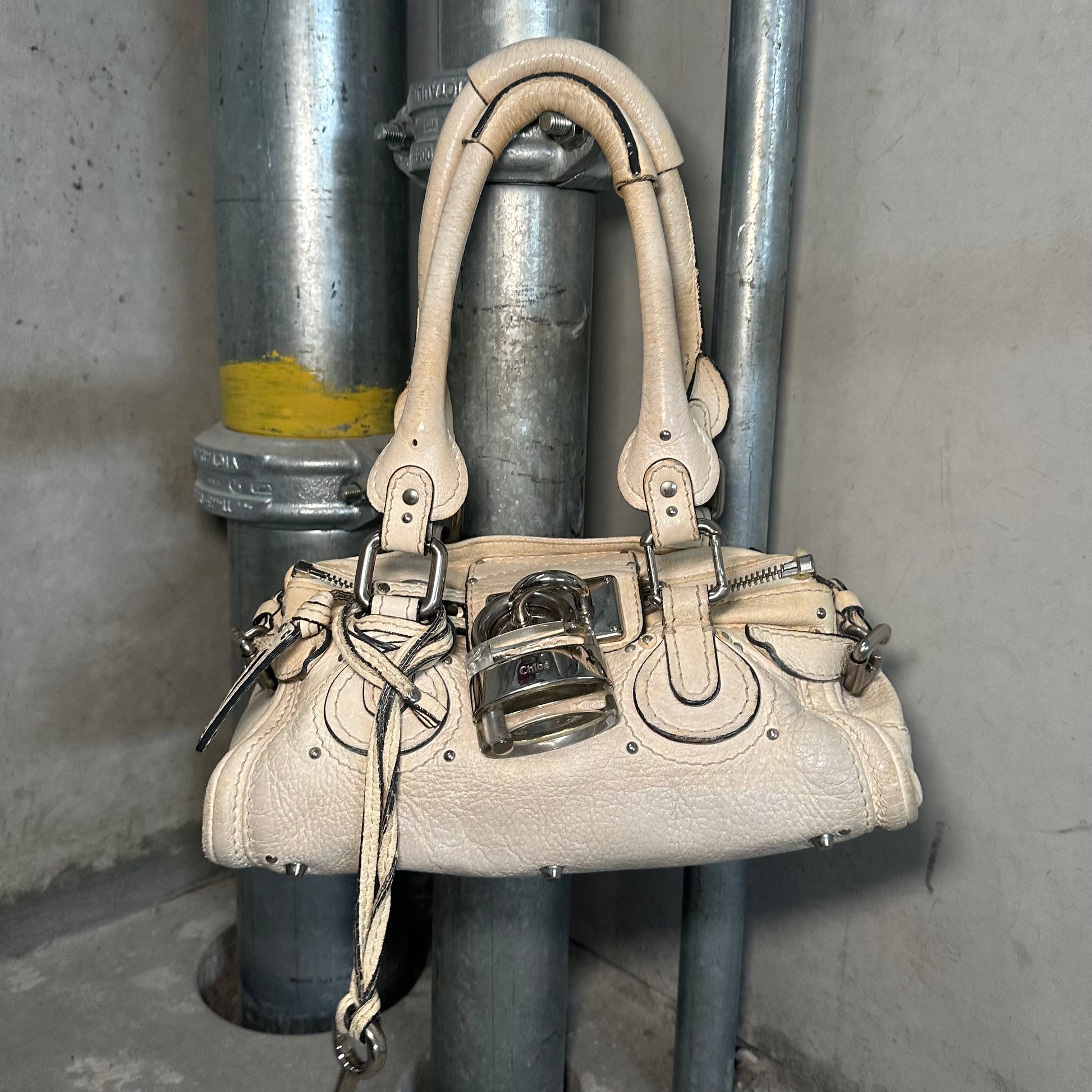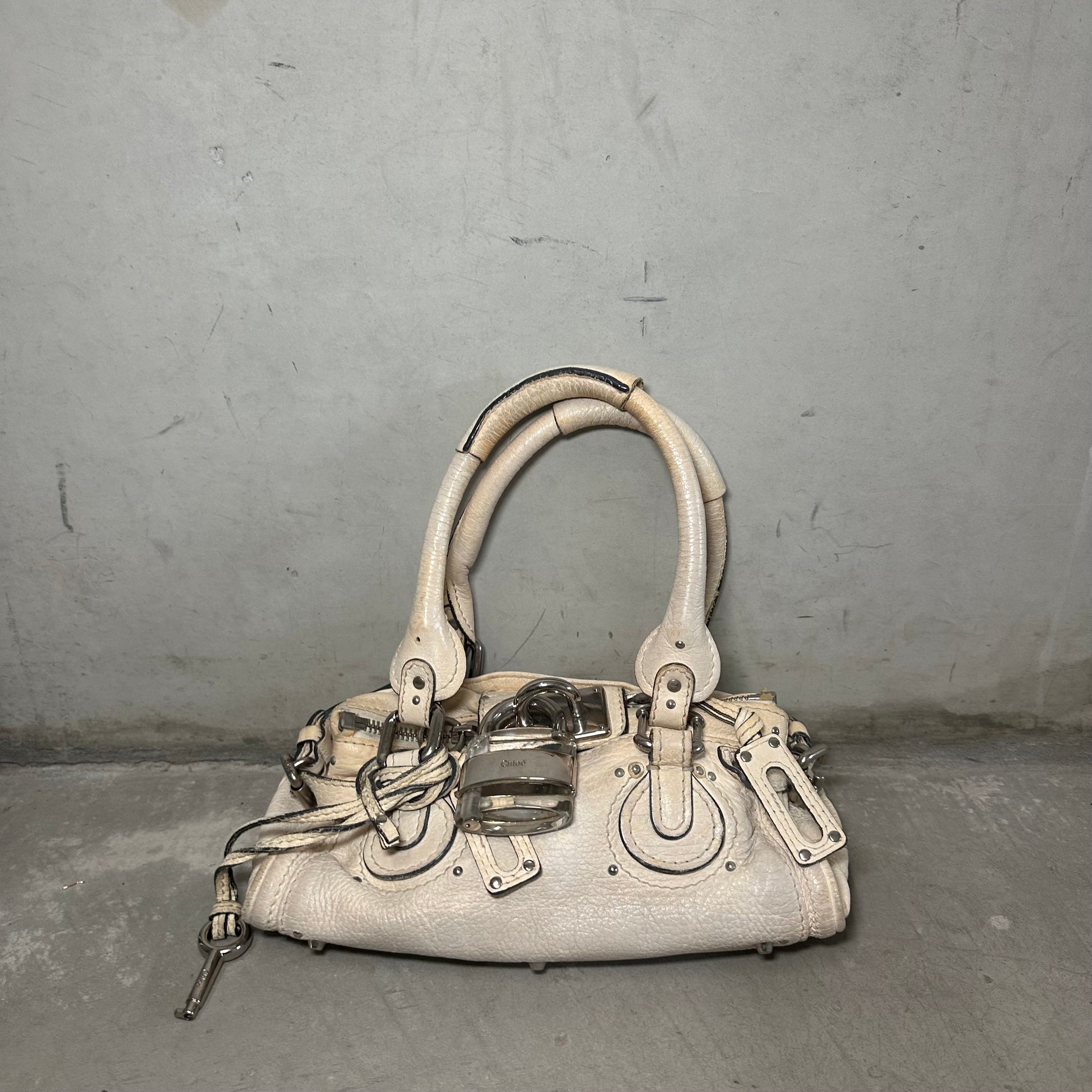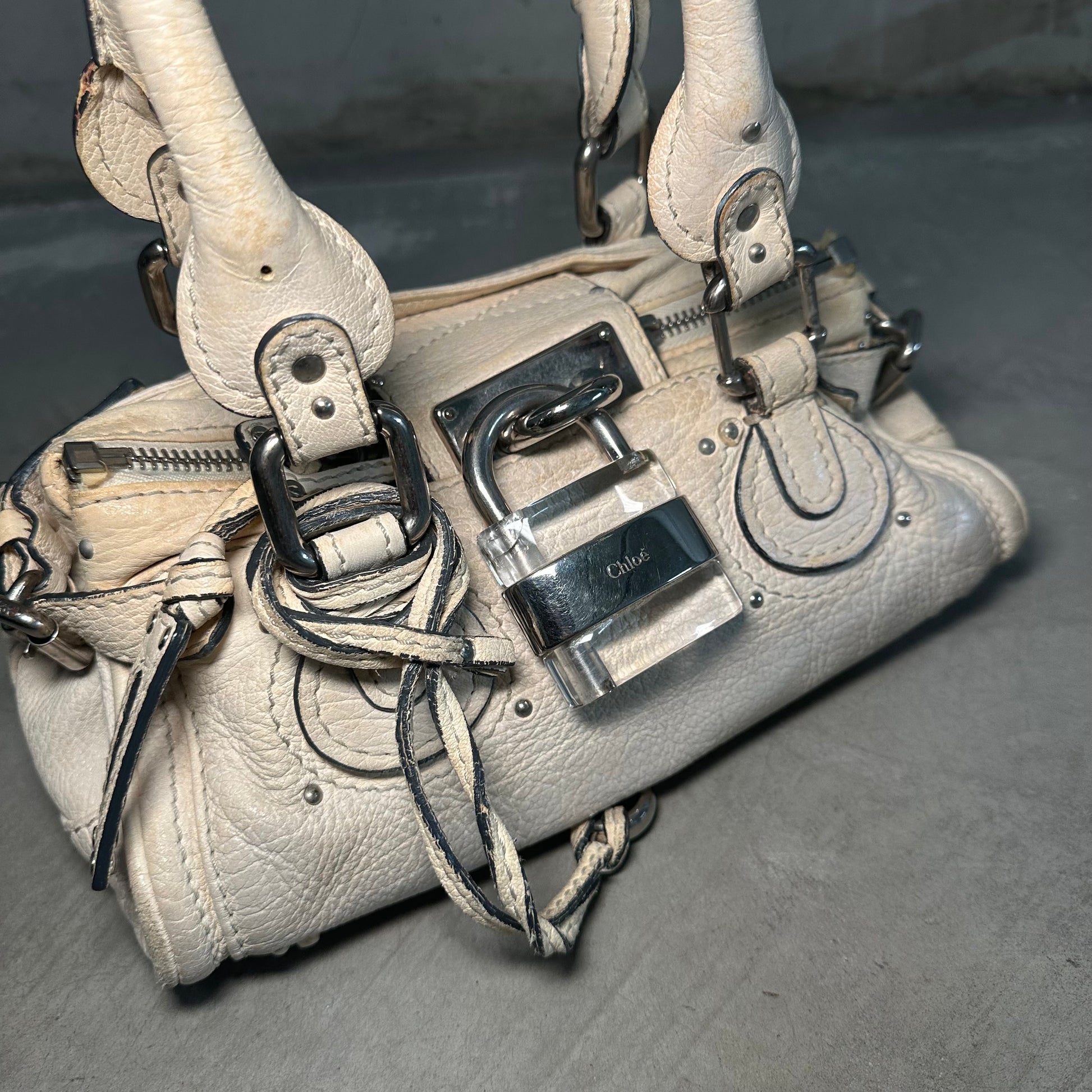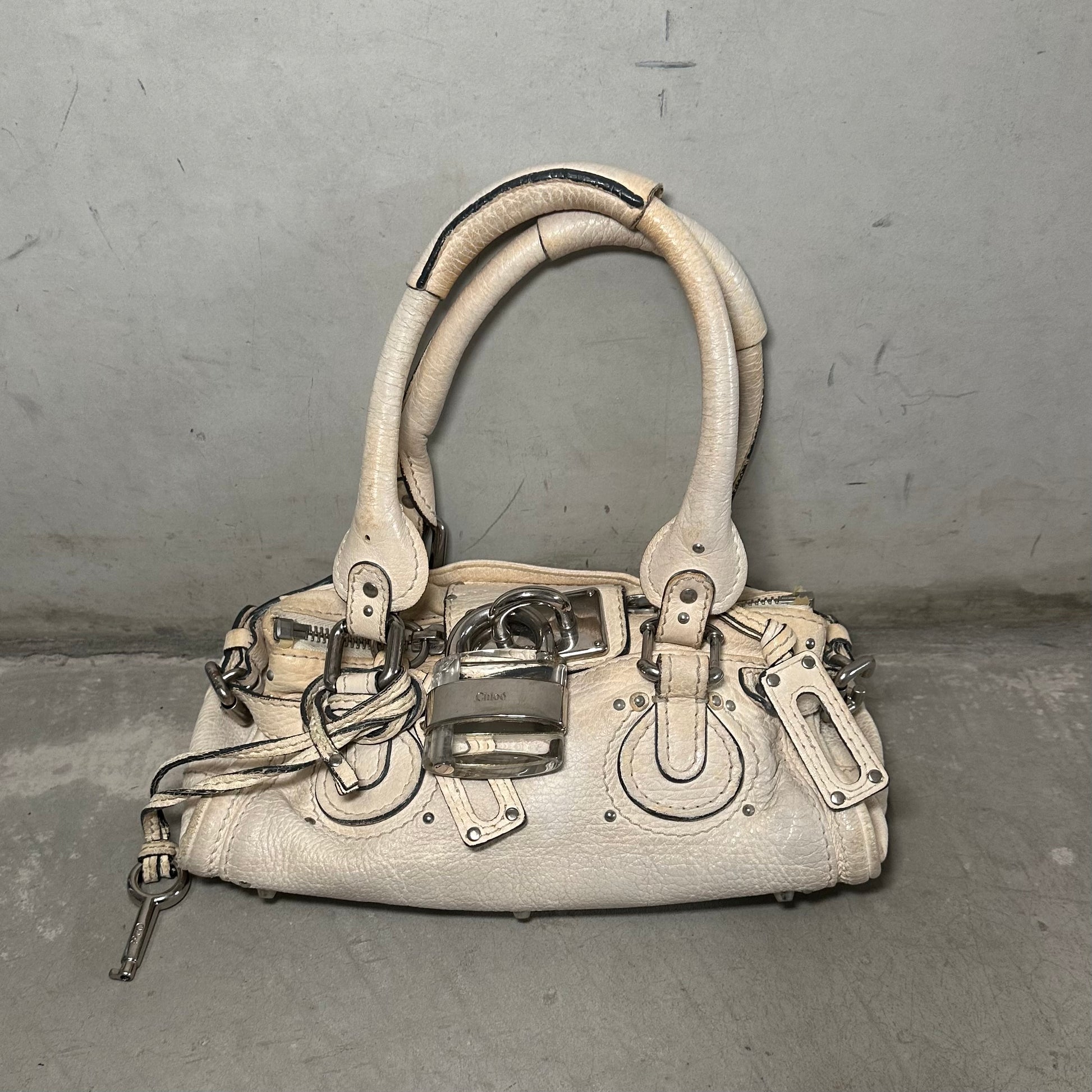 The cutest white mini Paddington by Chloe with a unique see-through lock.