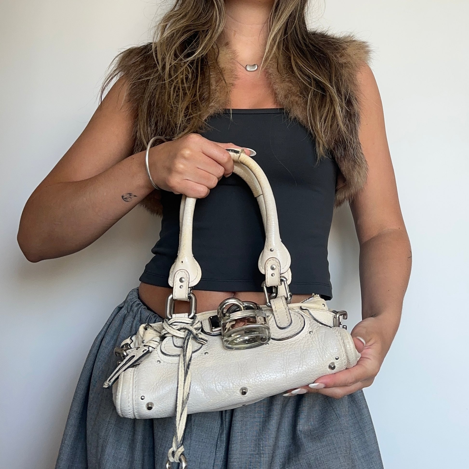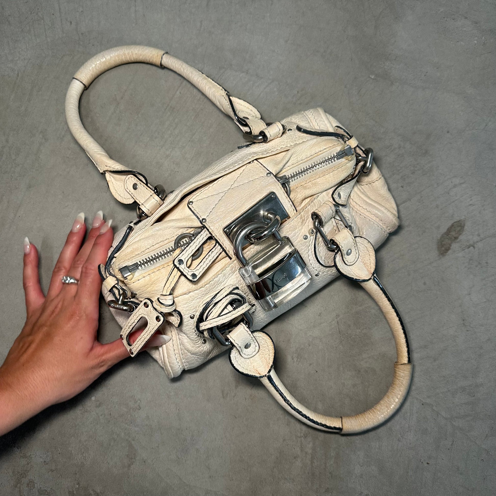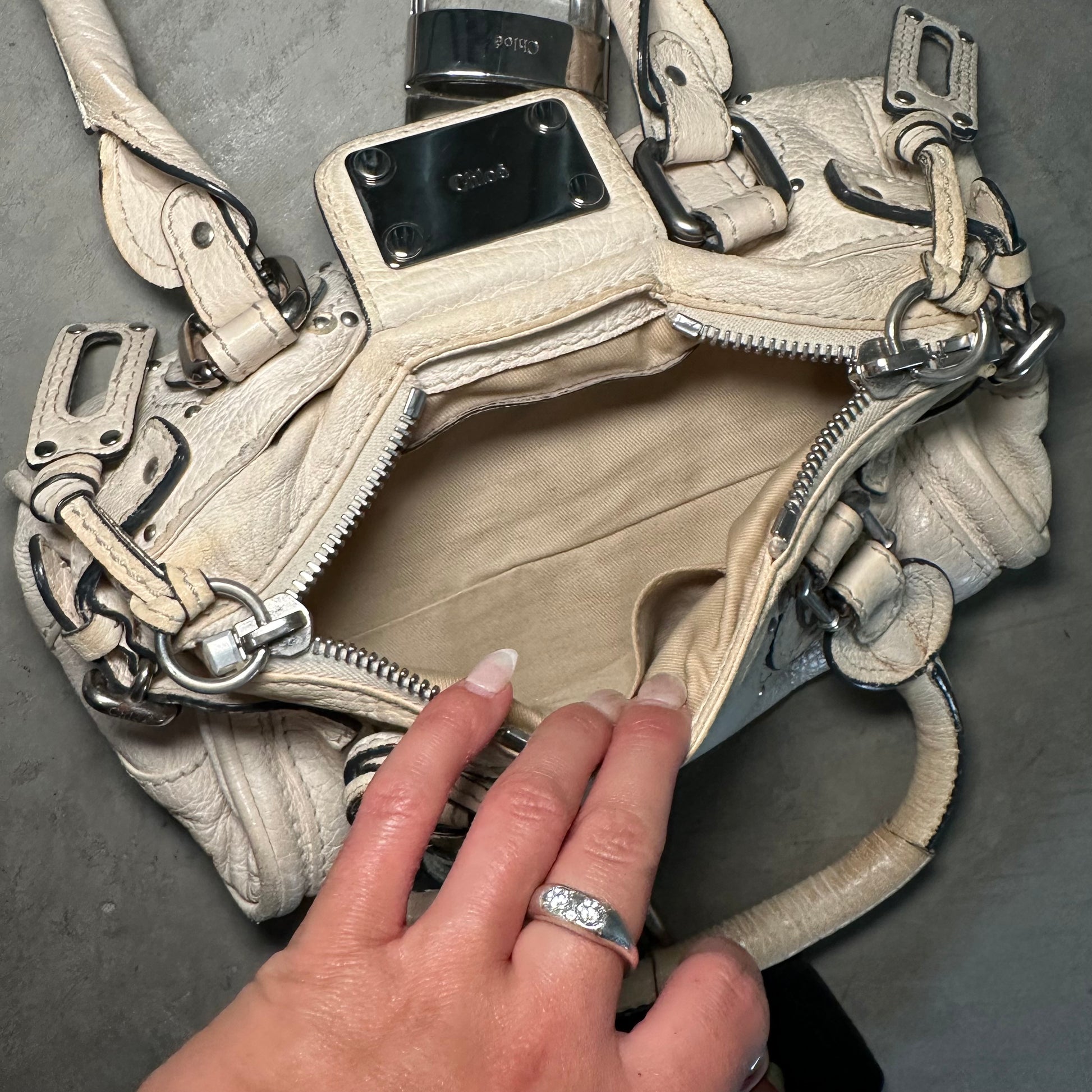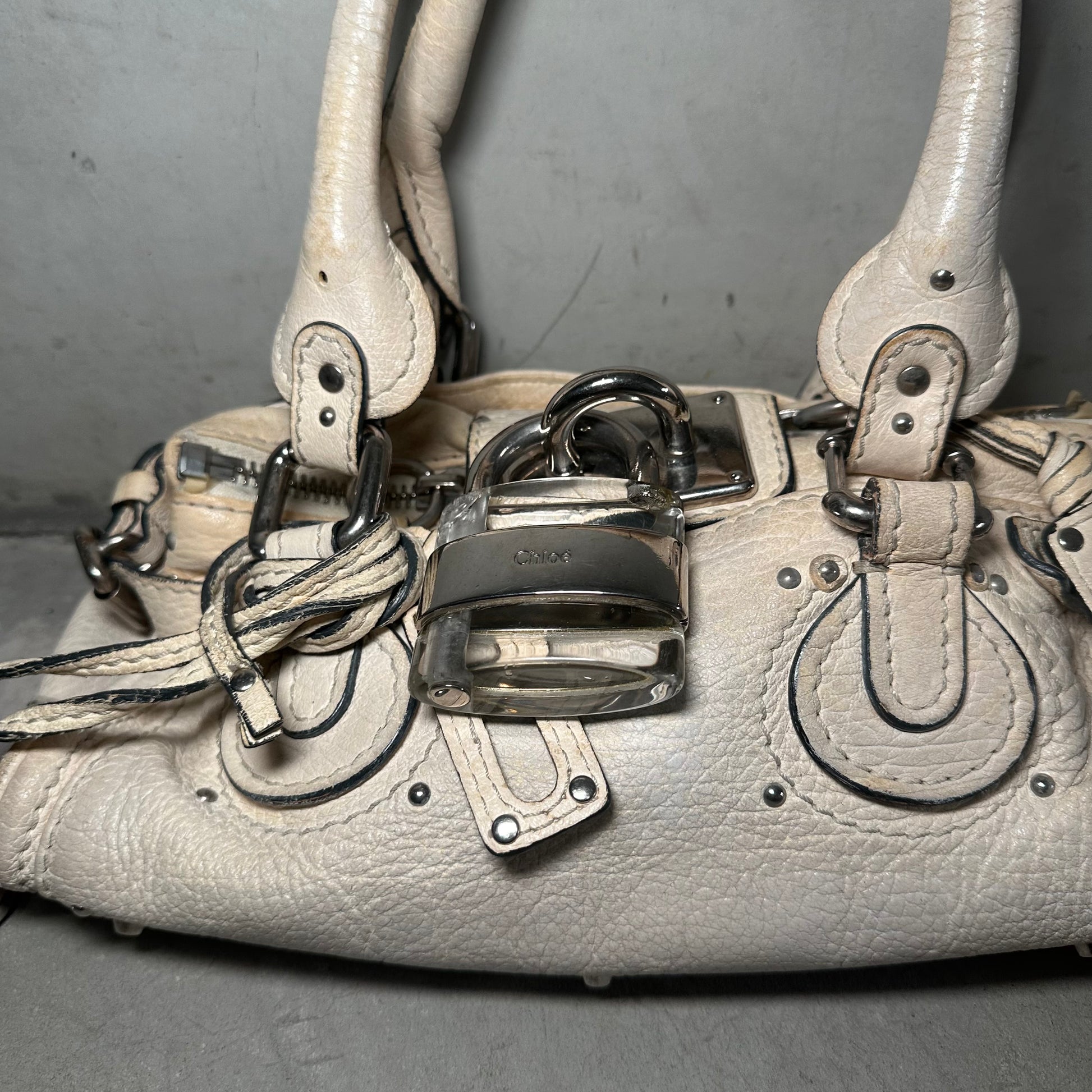 The cutest white mini Paddington by Chloe with a unique see-through lock.