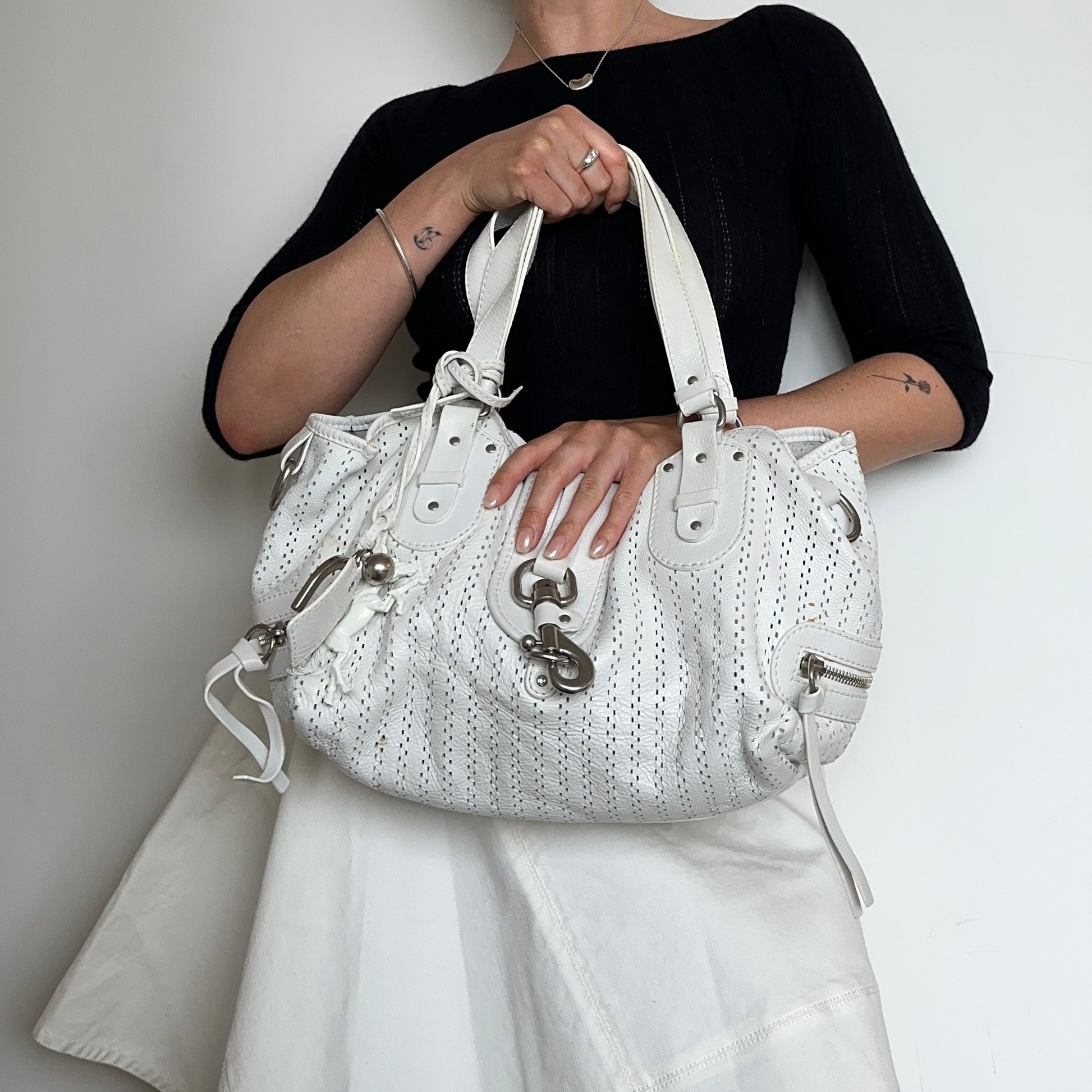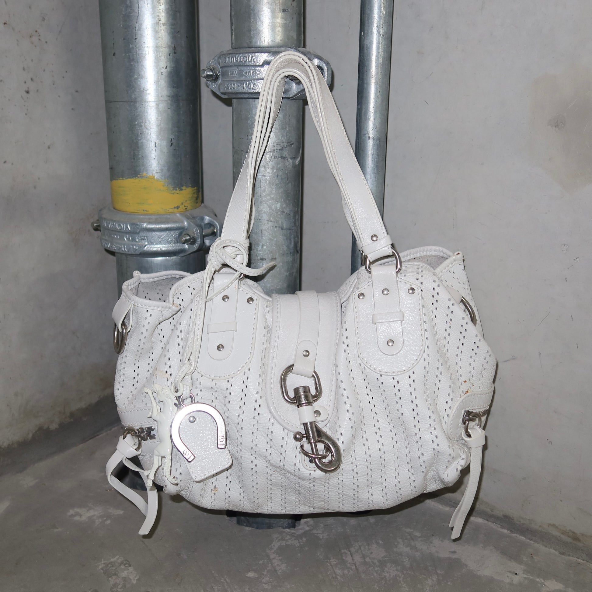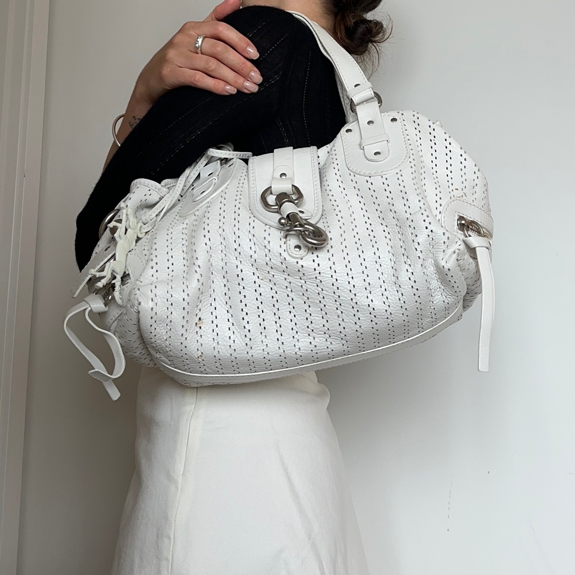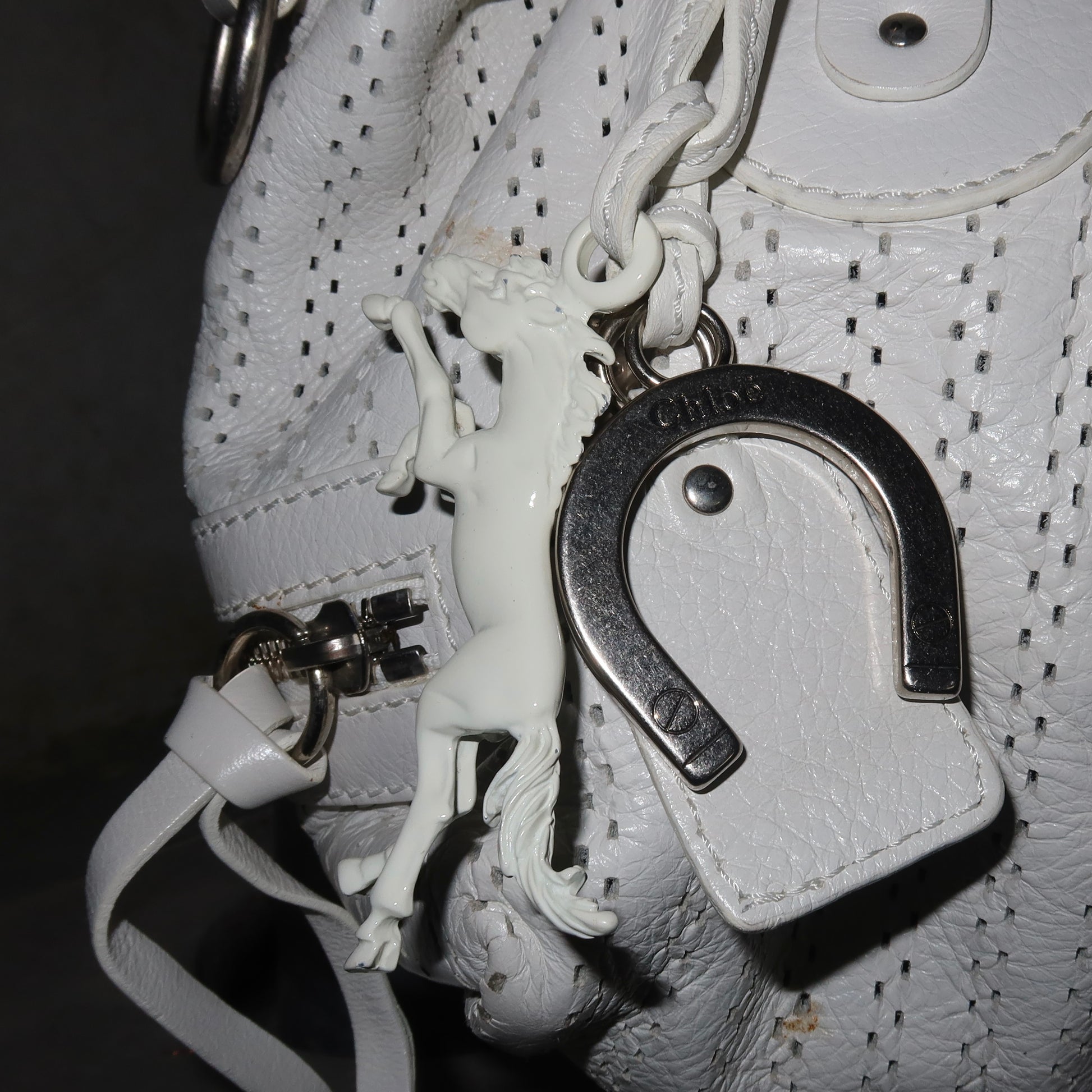 Gorgeous white leather Kerala bag by Chloé. A rare white perforated colourway with white coated horse and horseshoe charms. Comes with authentication card.