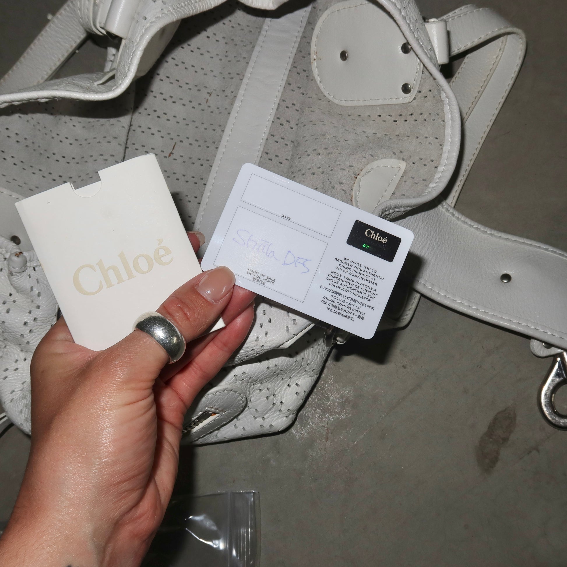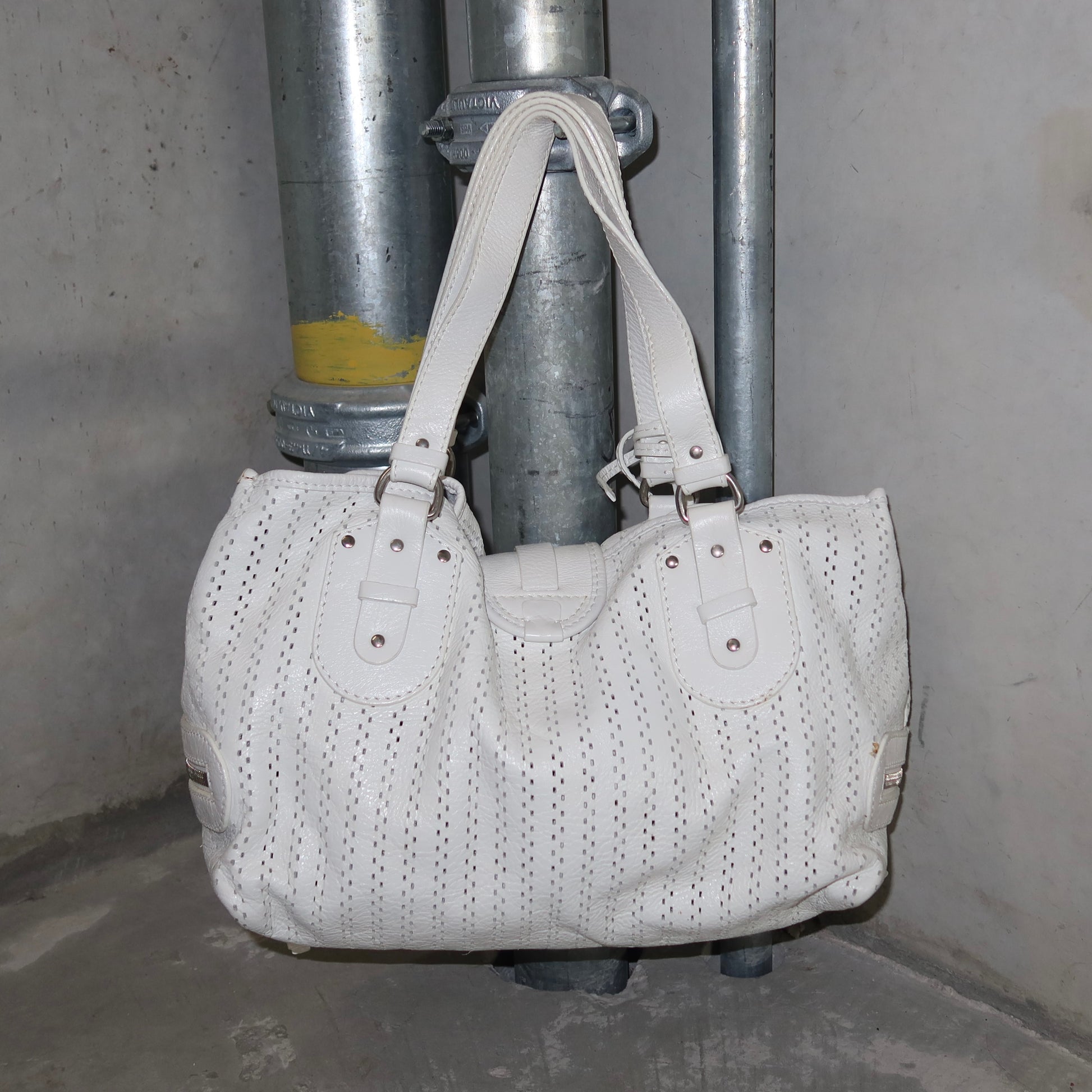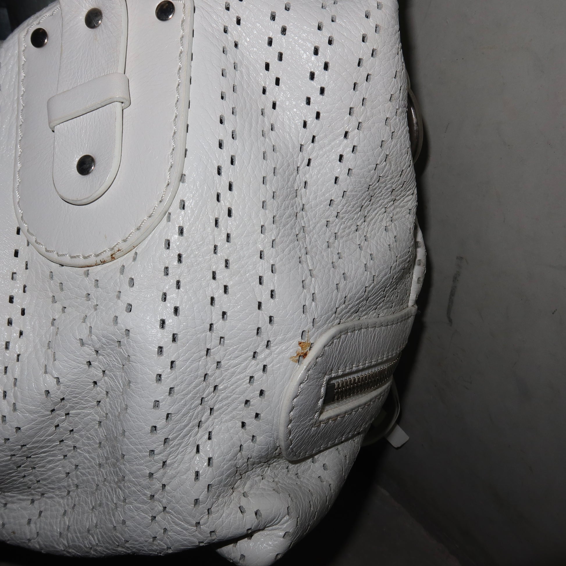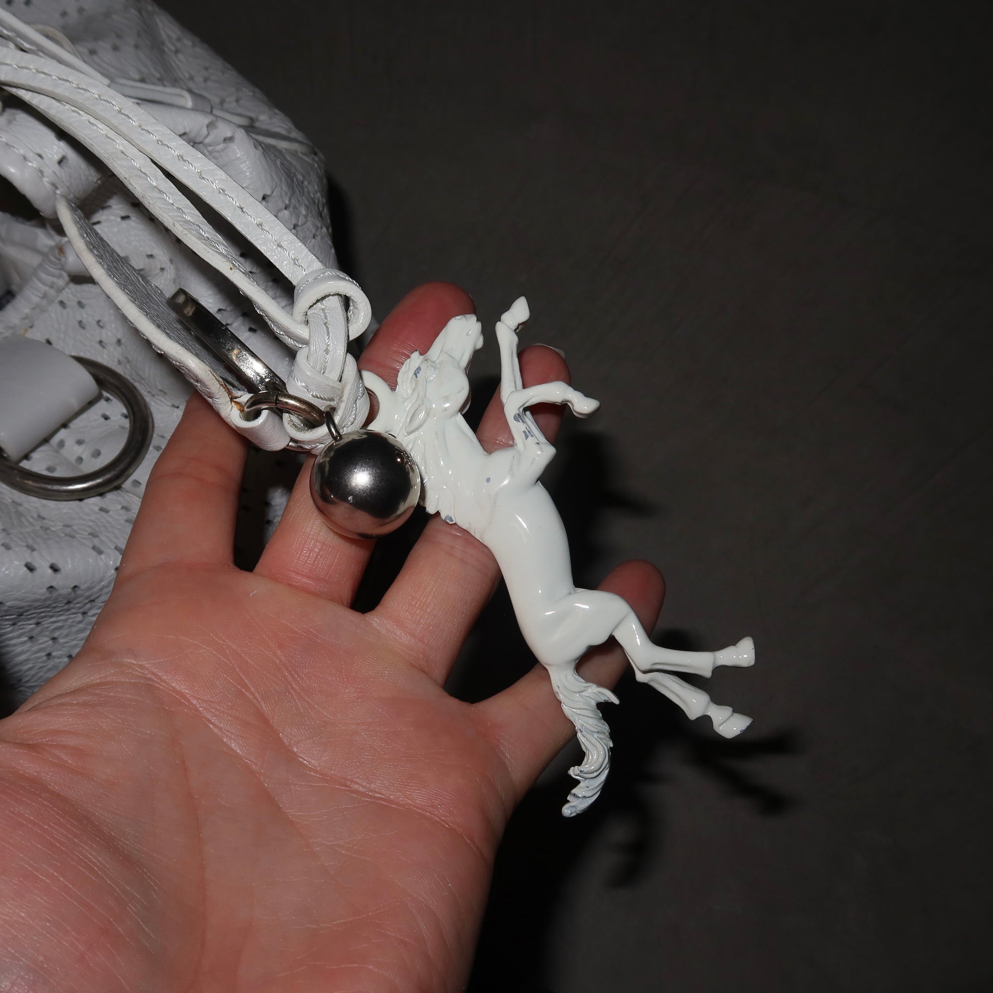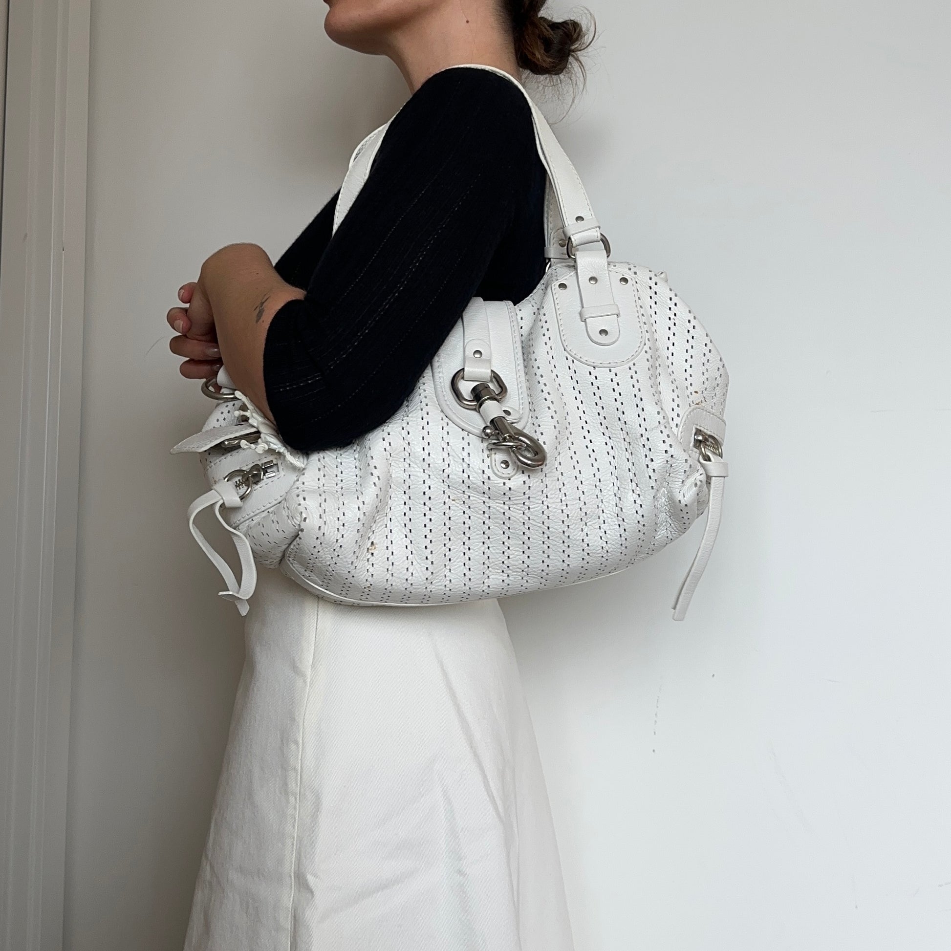 Gorgeous white leather Kerala bag by Chloé. A rare white perforated colourway with white coated horse and horseshoe charms. Comes with authentication card.
