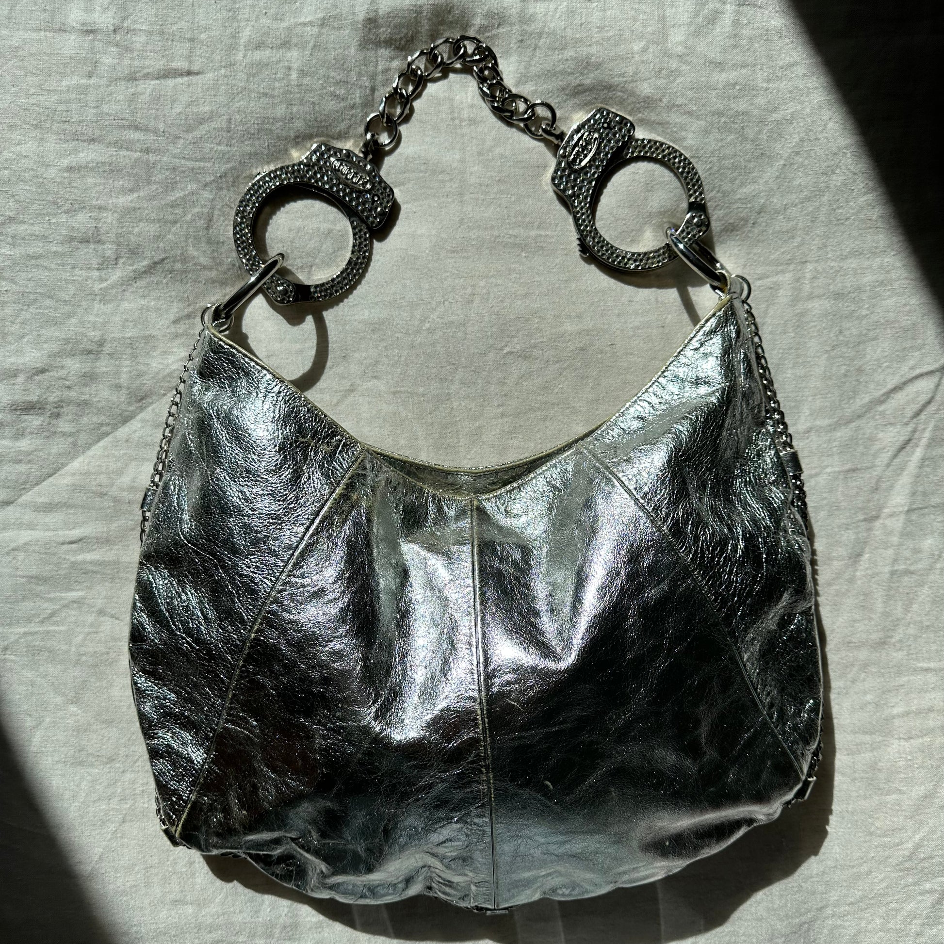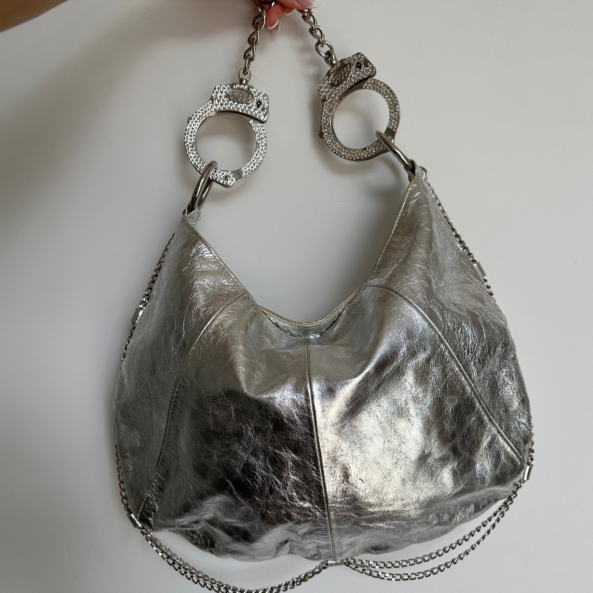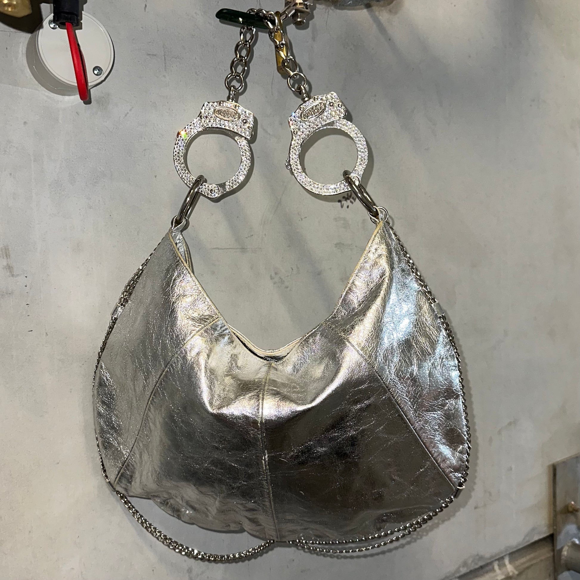 Another iconic and very rare Cuffz by Linz shoulder bag in a gorgeous silver. Cute chains decorate the rim of the bag and the cuffs are encrusted with rhinestones. Comes with a key to unlock handcuffs!