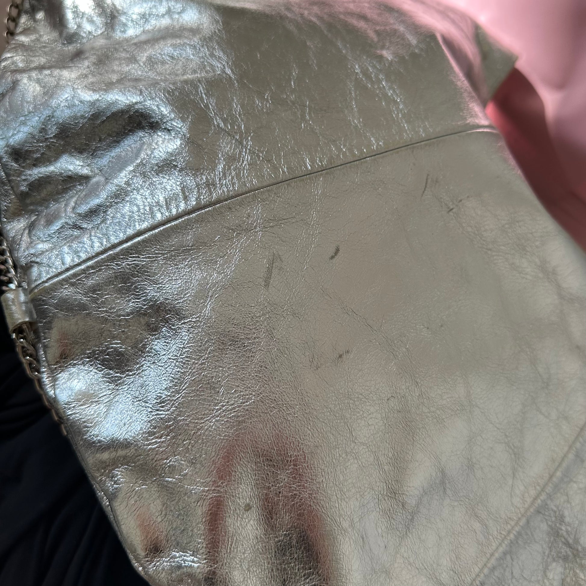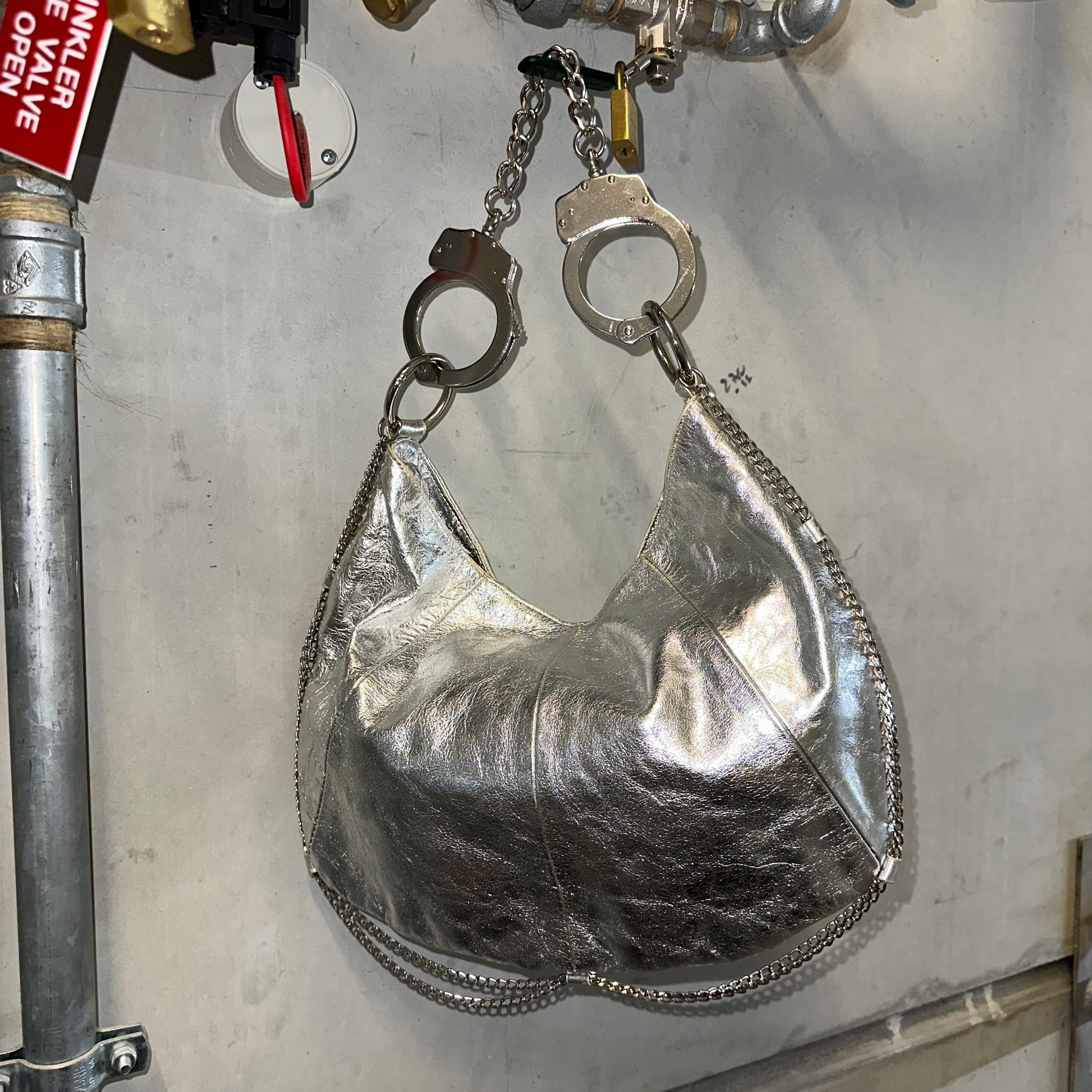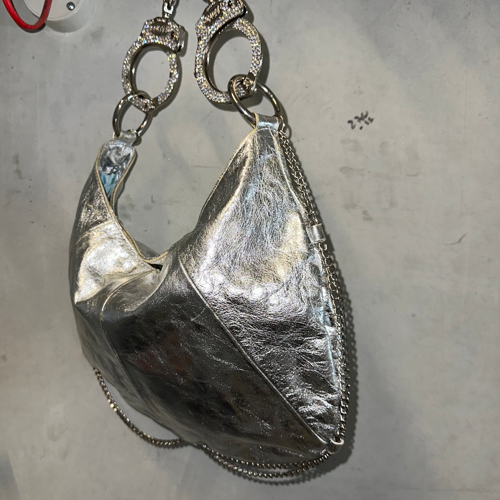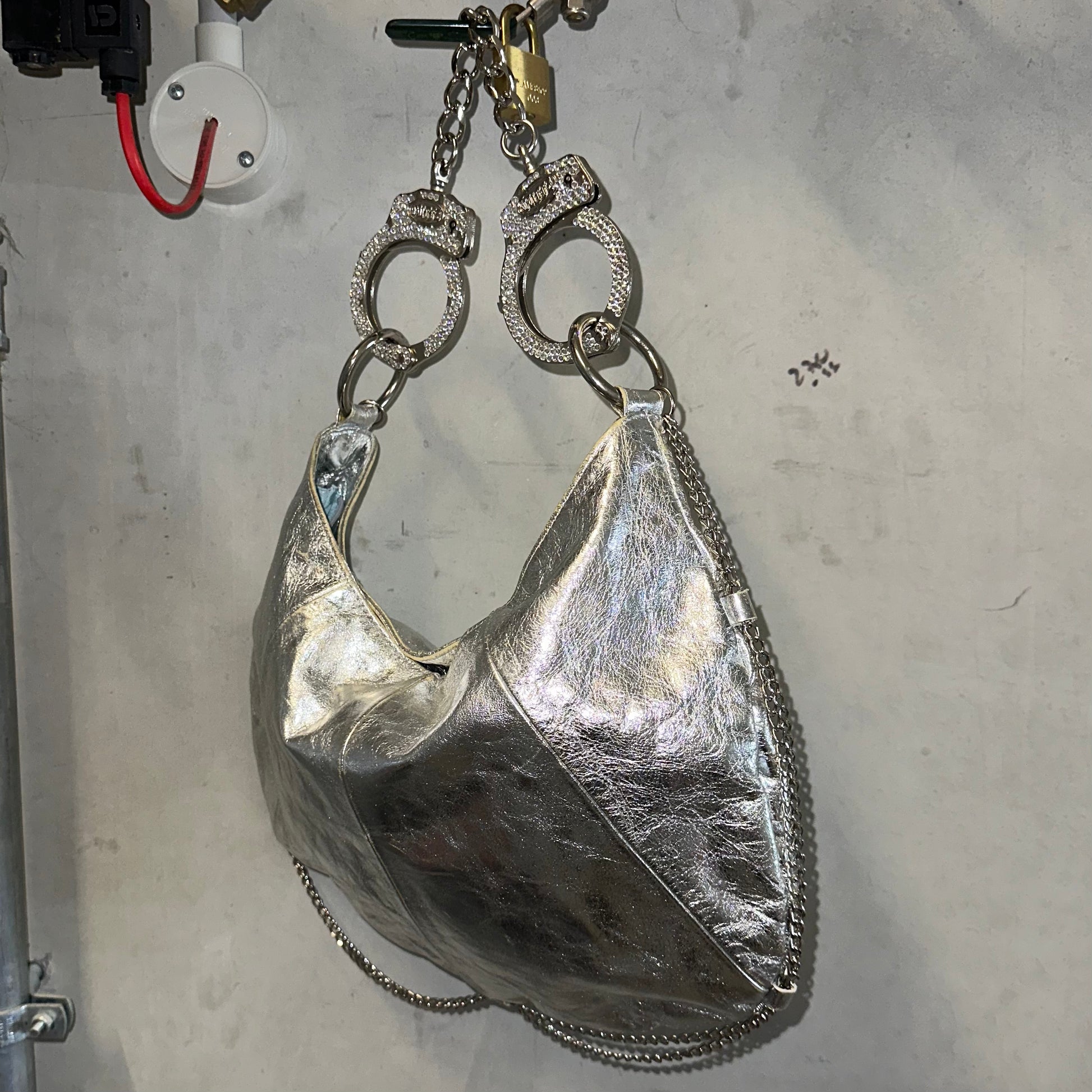 Another iconic and very rare Cuffz by Linz shoulder bag in a gorgeous silver. Cute chains decorate the rim of the bag and the cuffs are encrusted with rhinestones. Comes with a key to unlock handcuffs!