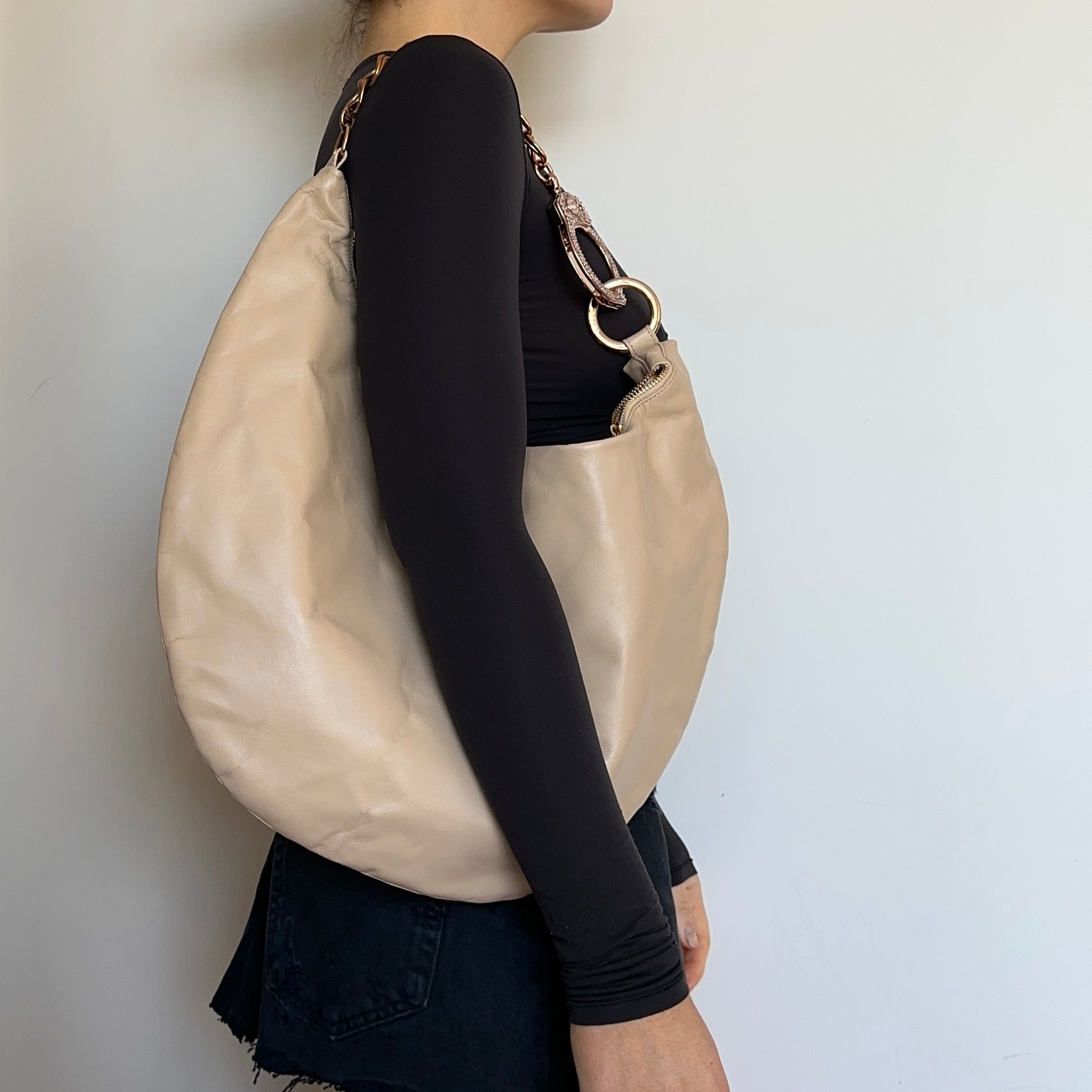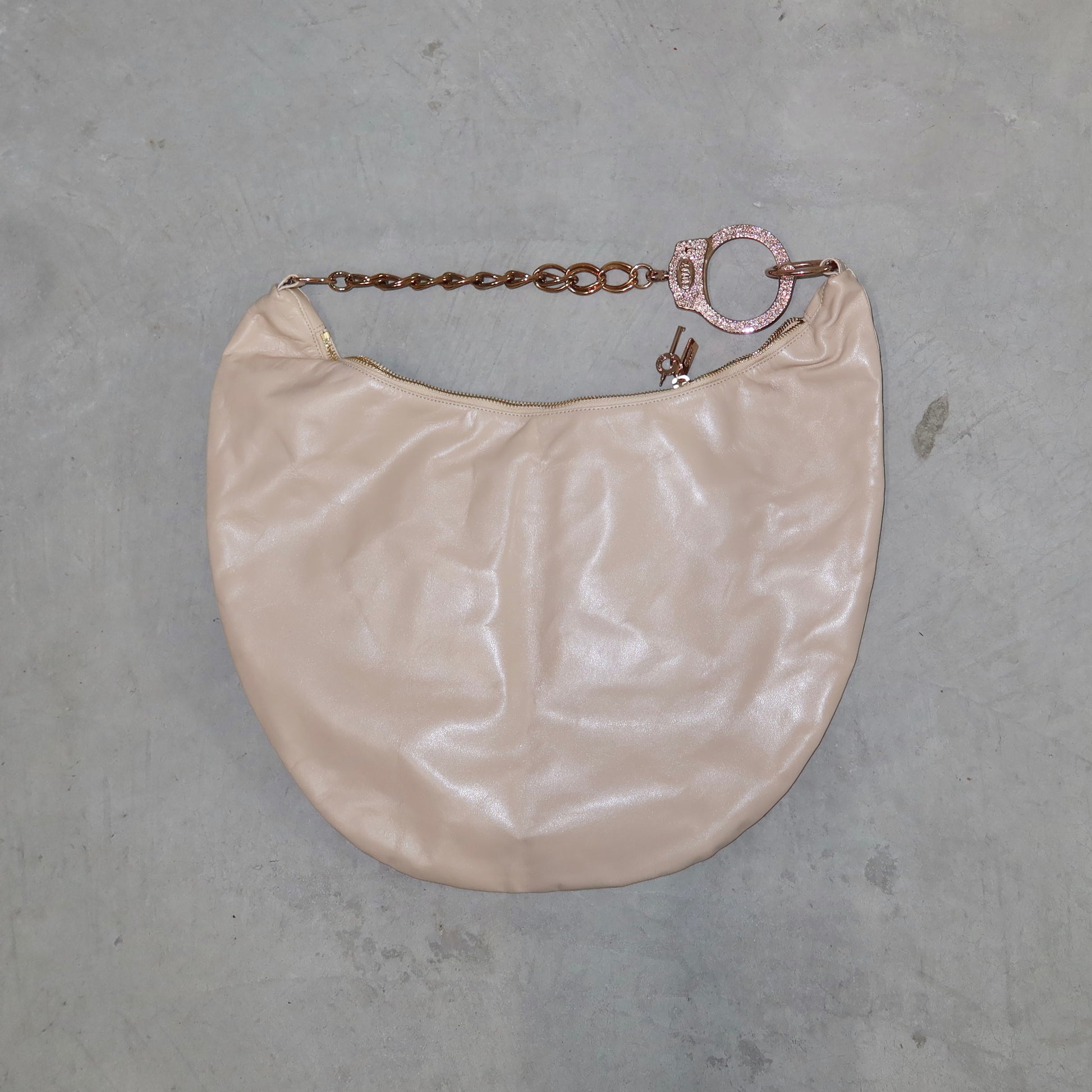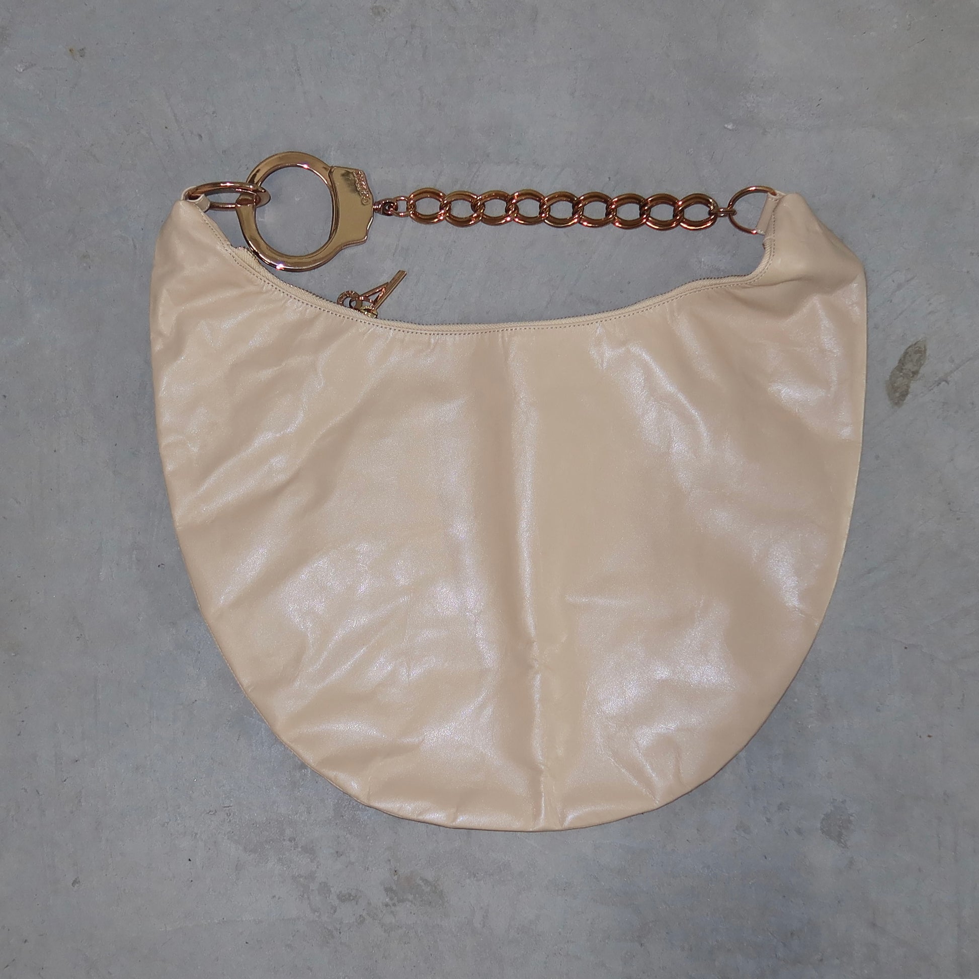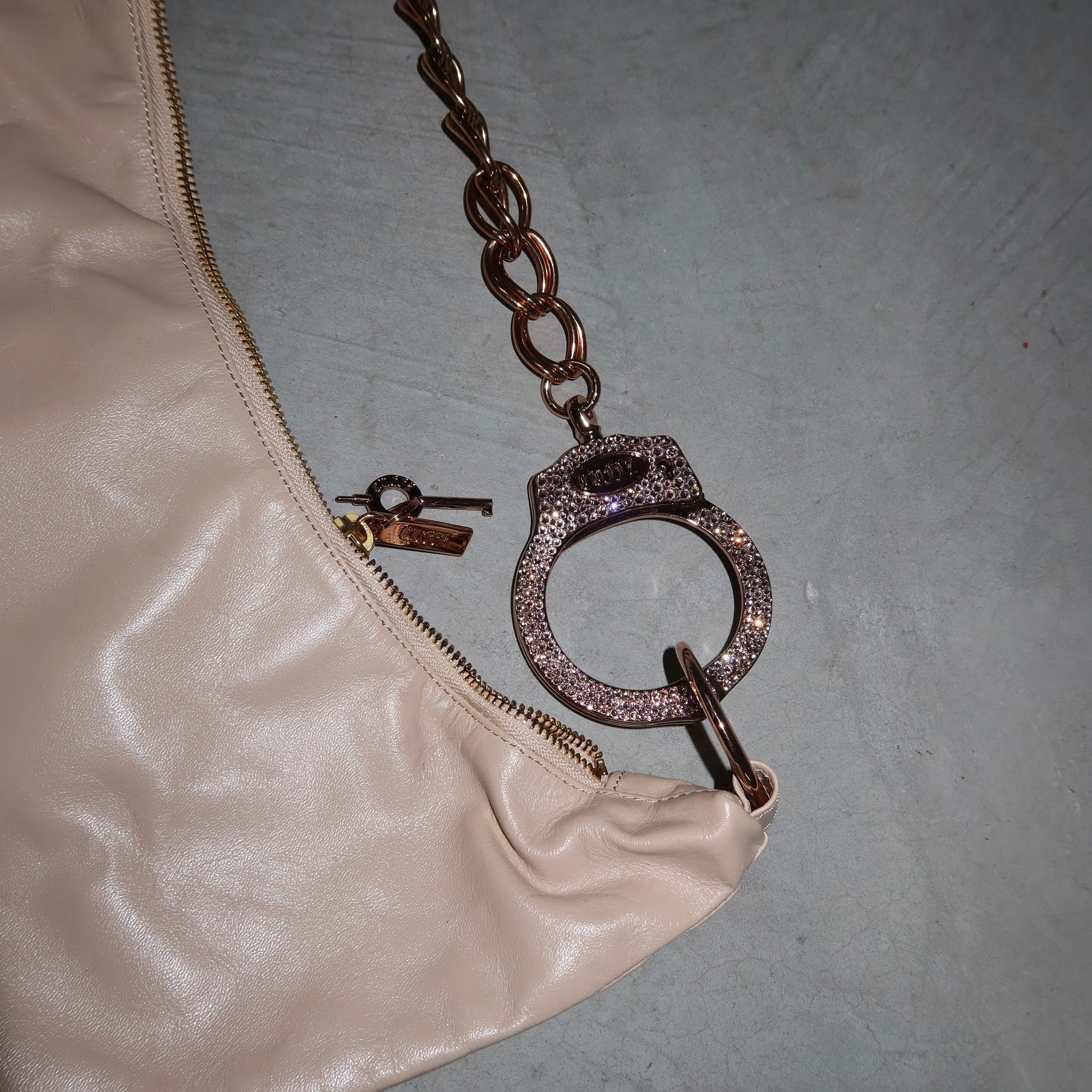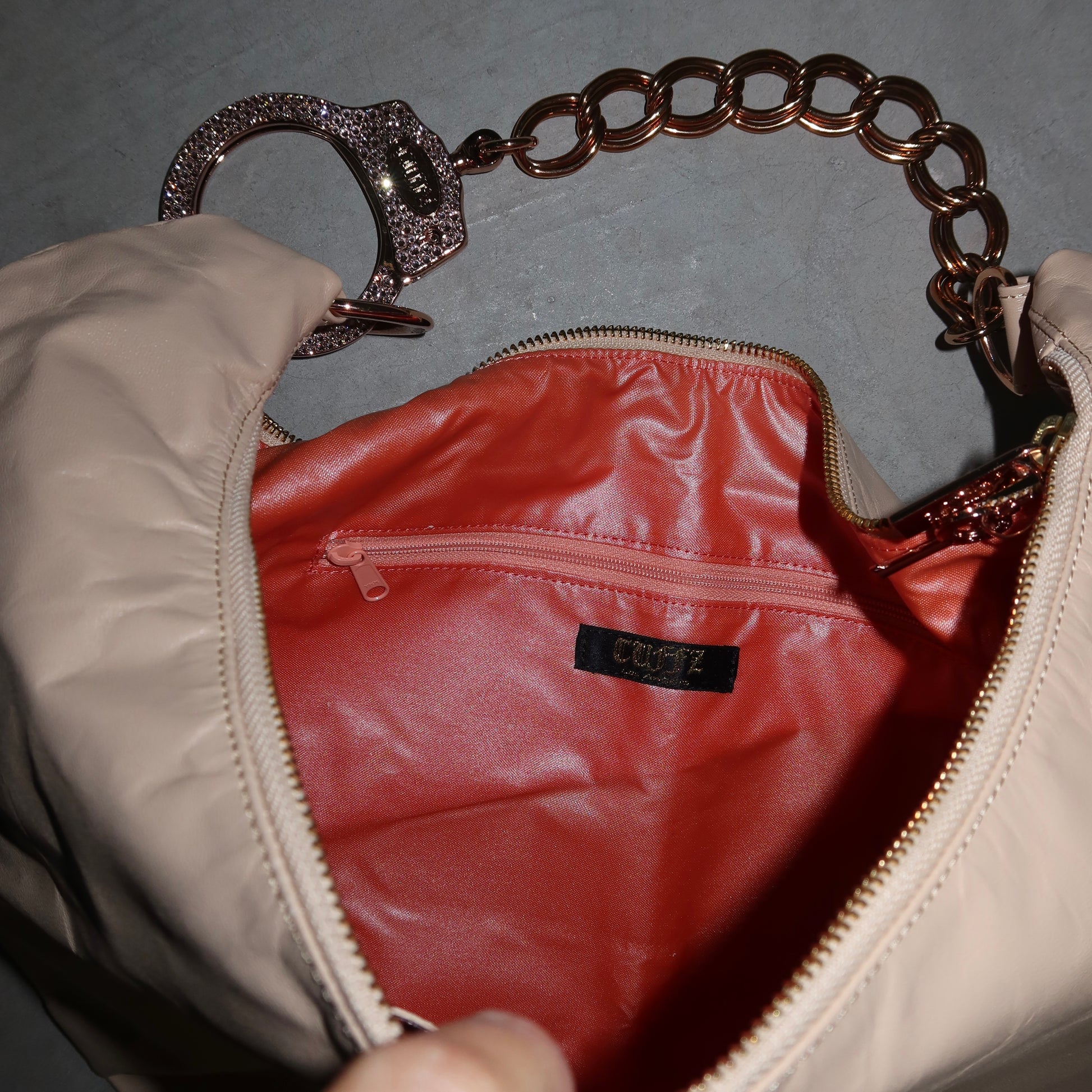 Large beige leather Cuffz 'Barfly' bag with rose gold hardware and Swarovski encrusted working handcuff detail. Vibrant peach lining.