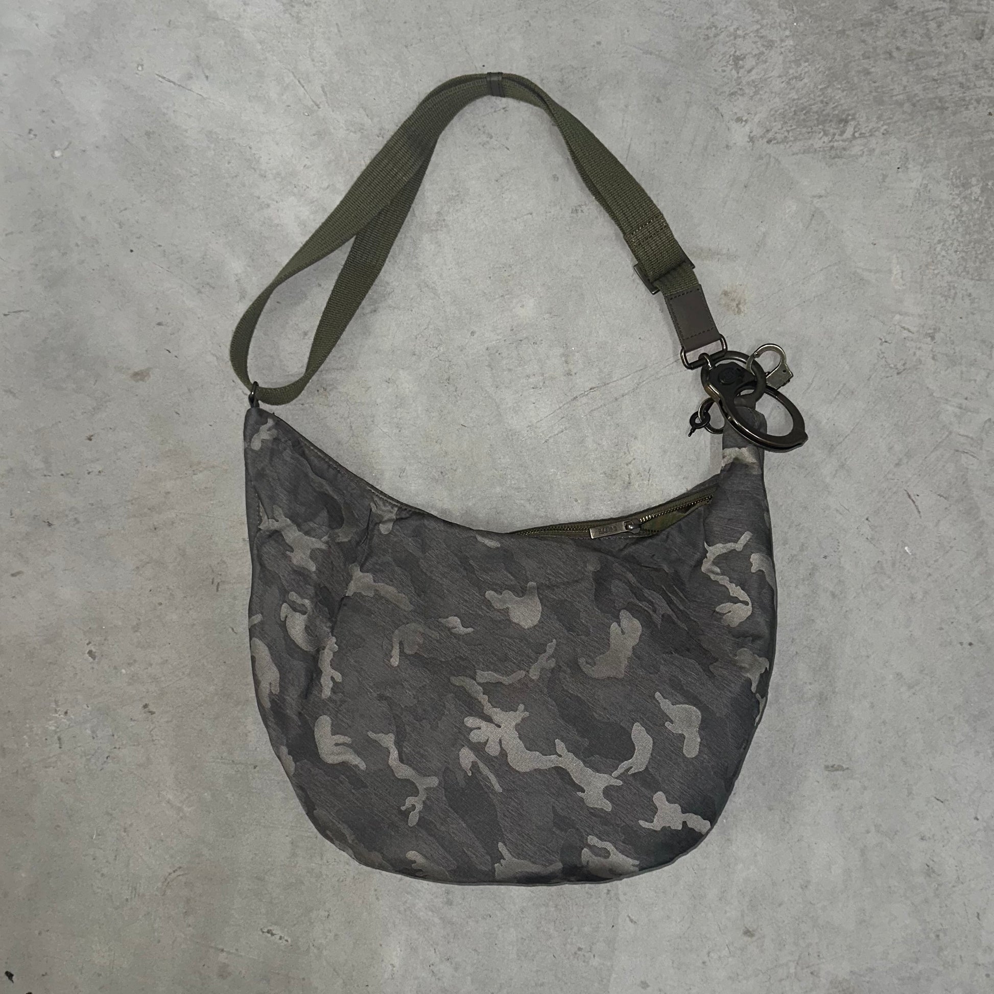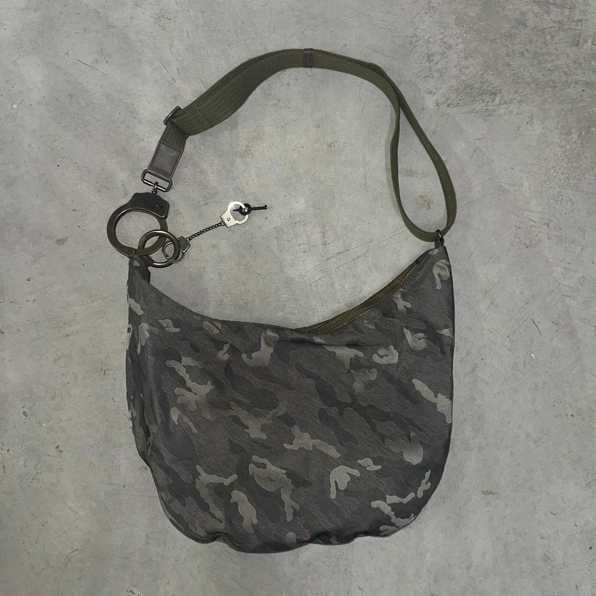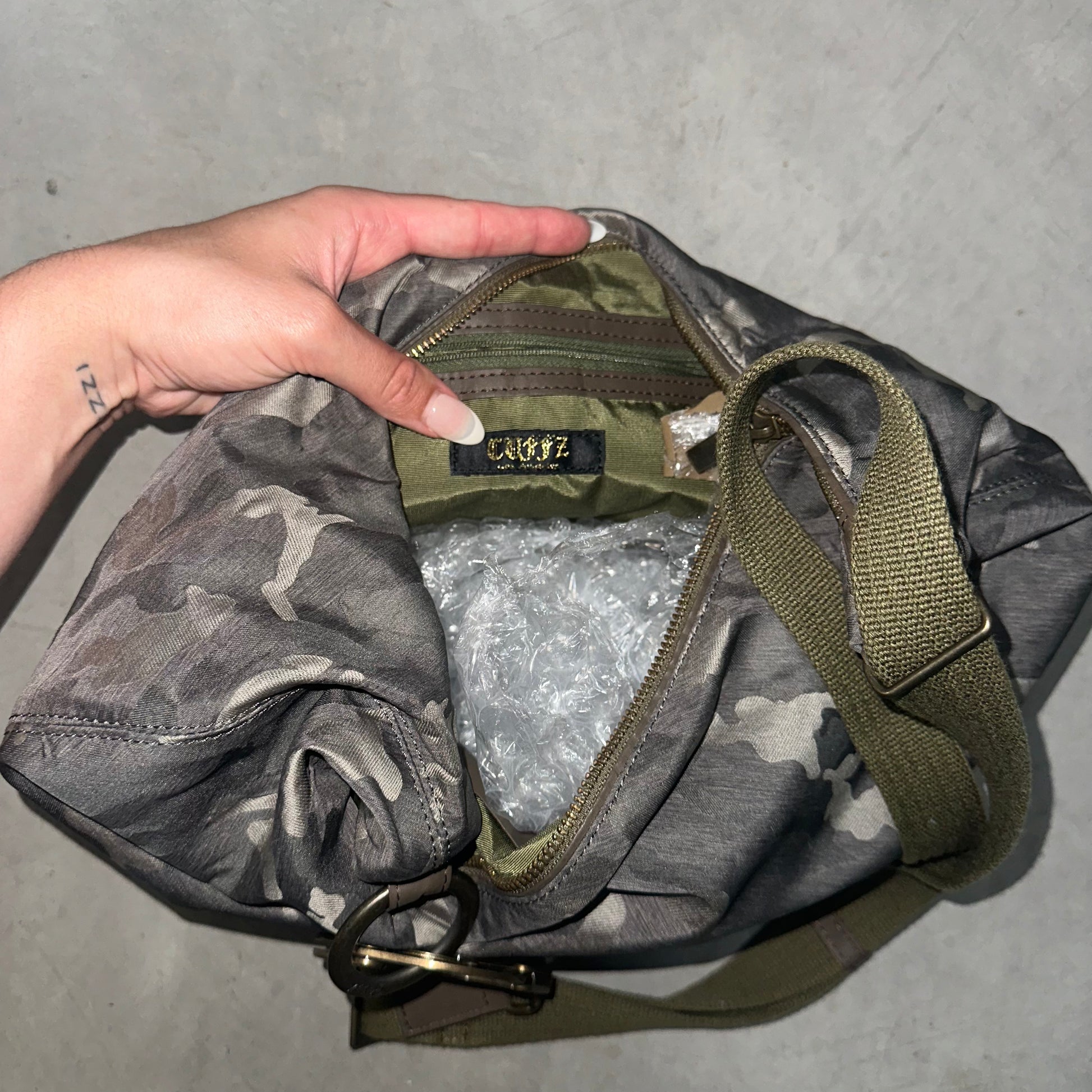 The most amazing large Cuffz crossbody bag in camo print with matte bronze hardware.