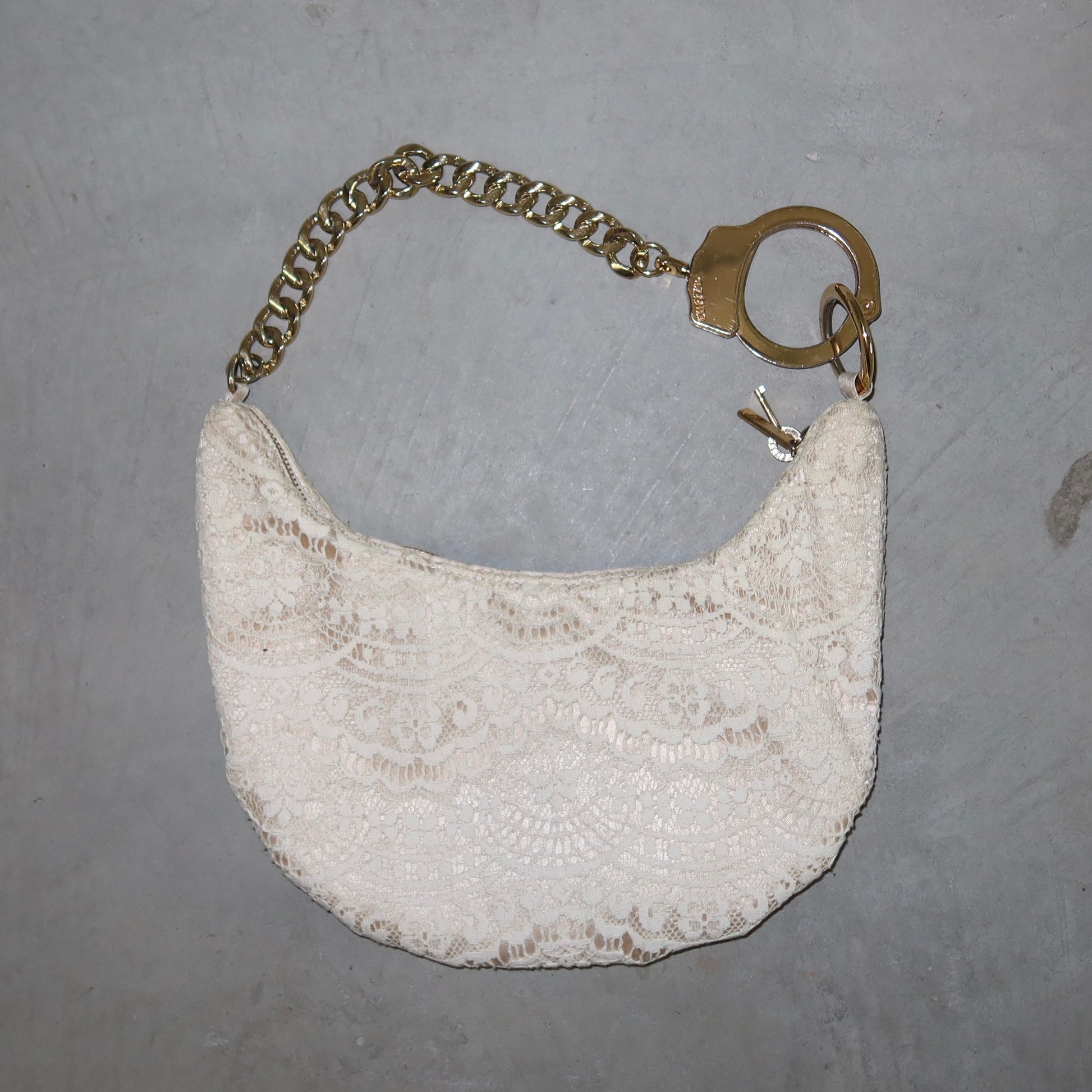 Beautiful lace Cuffz bag with gold hardware and Swarovski encrusted handcuff detail. Bright pink interior.