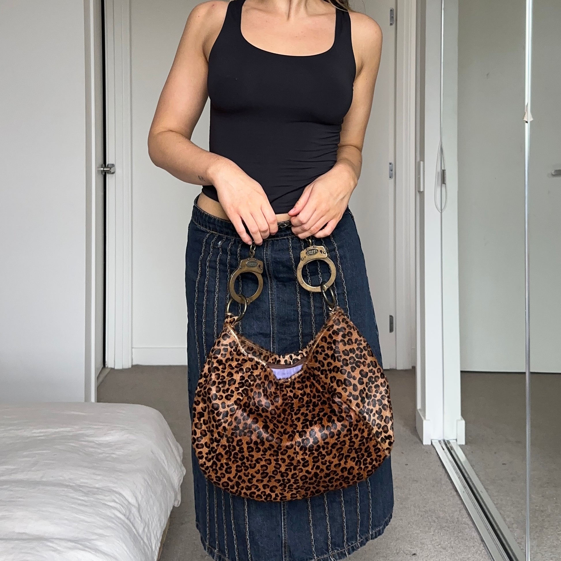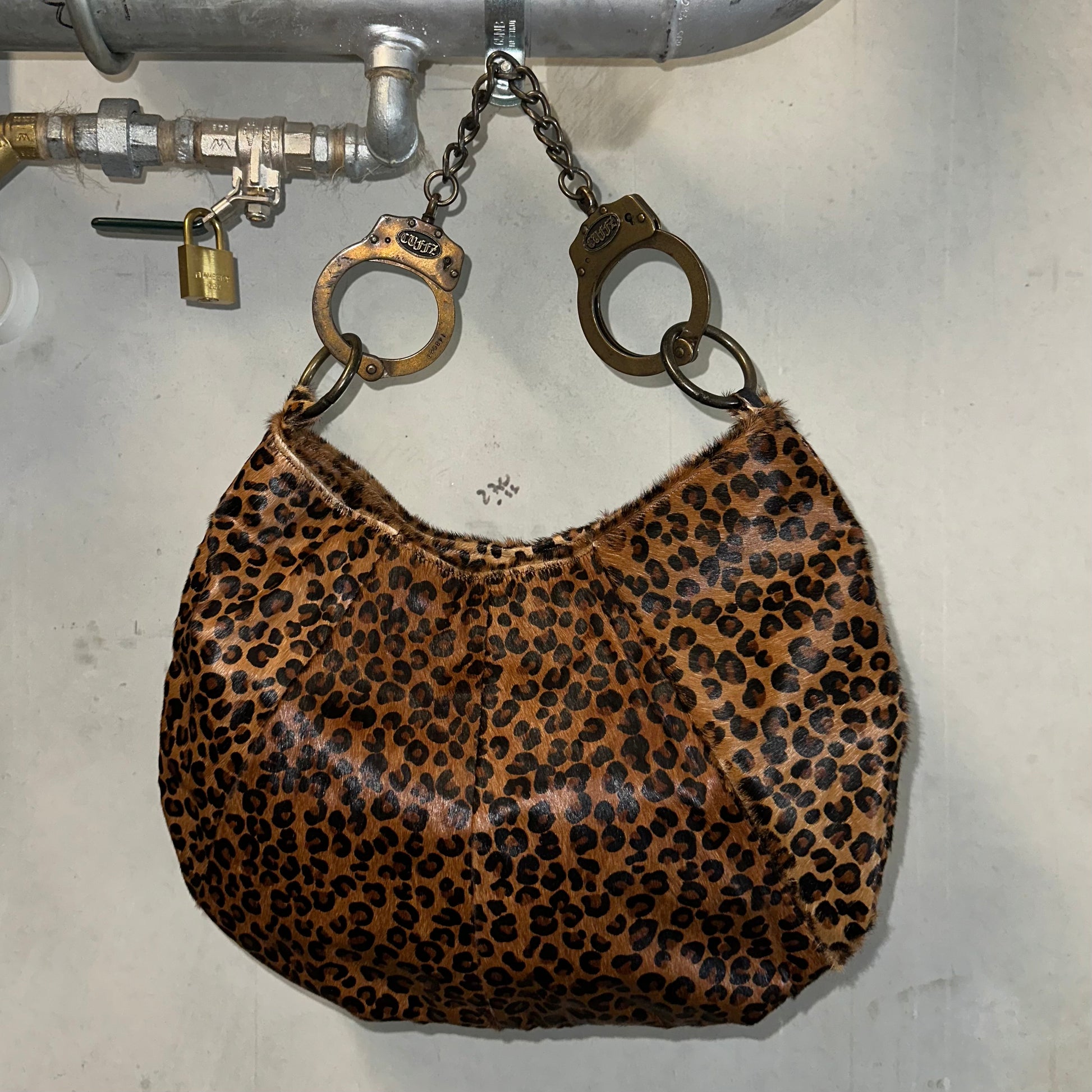 Dying over this rare Cuffz by Linz double cuff "Oh! Bondage" bag in a leopard print pony hair fabric.