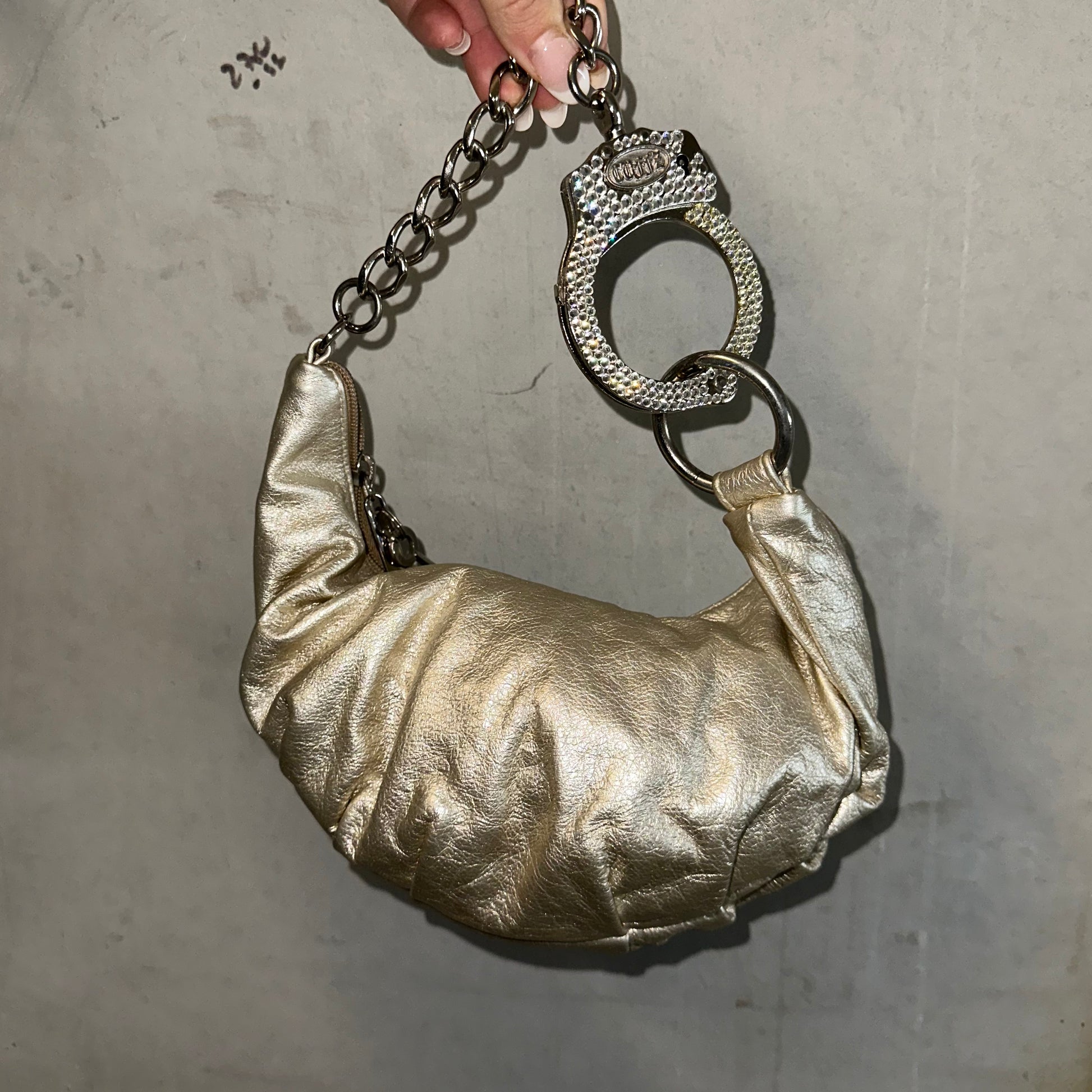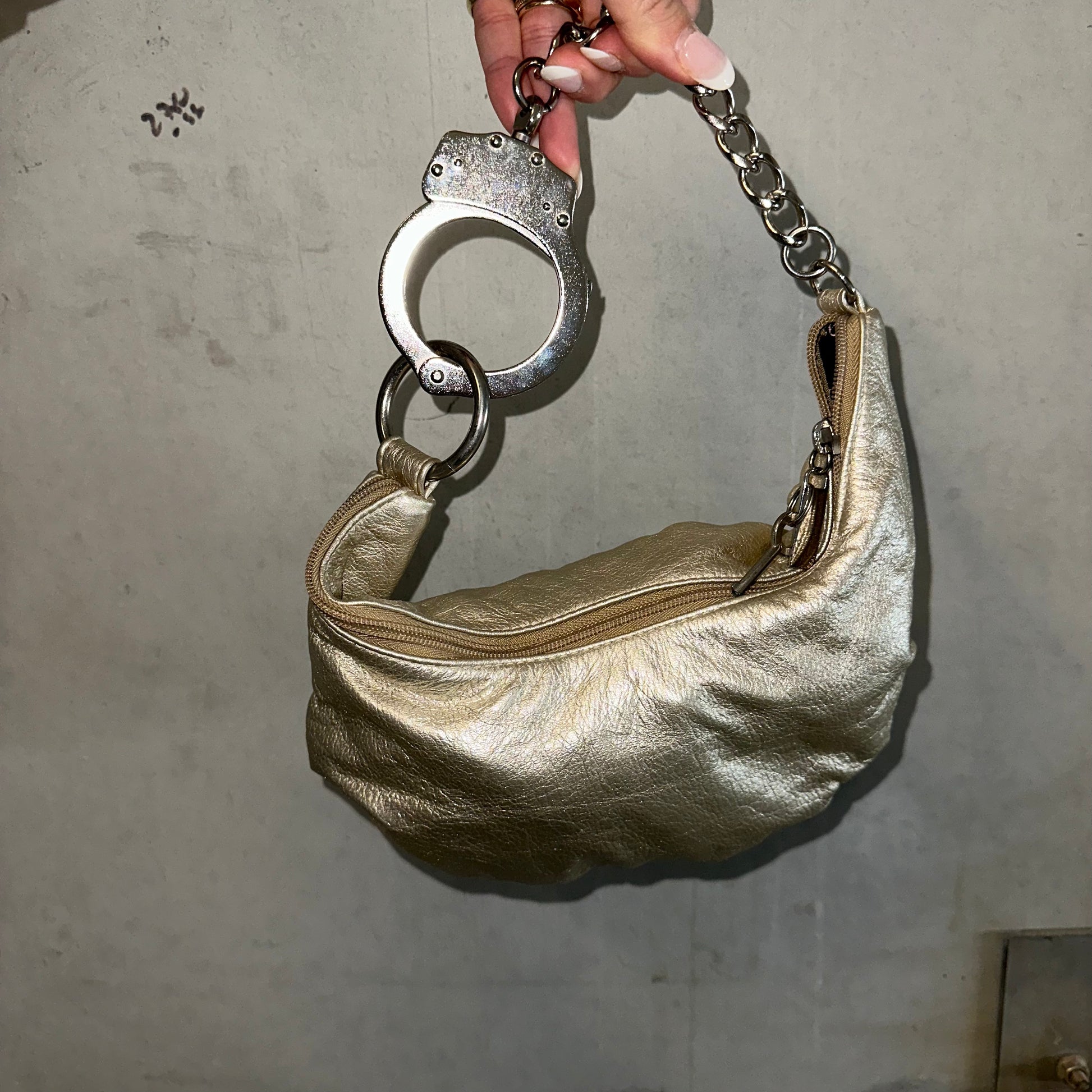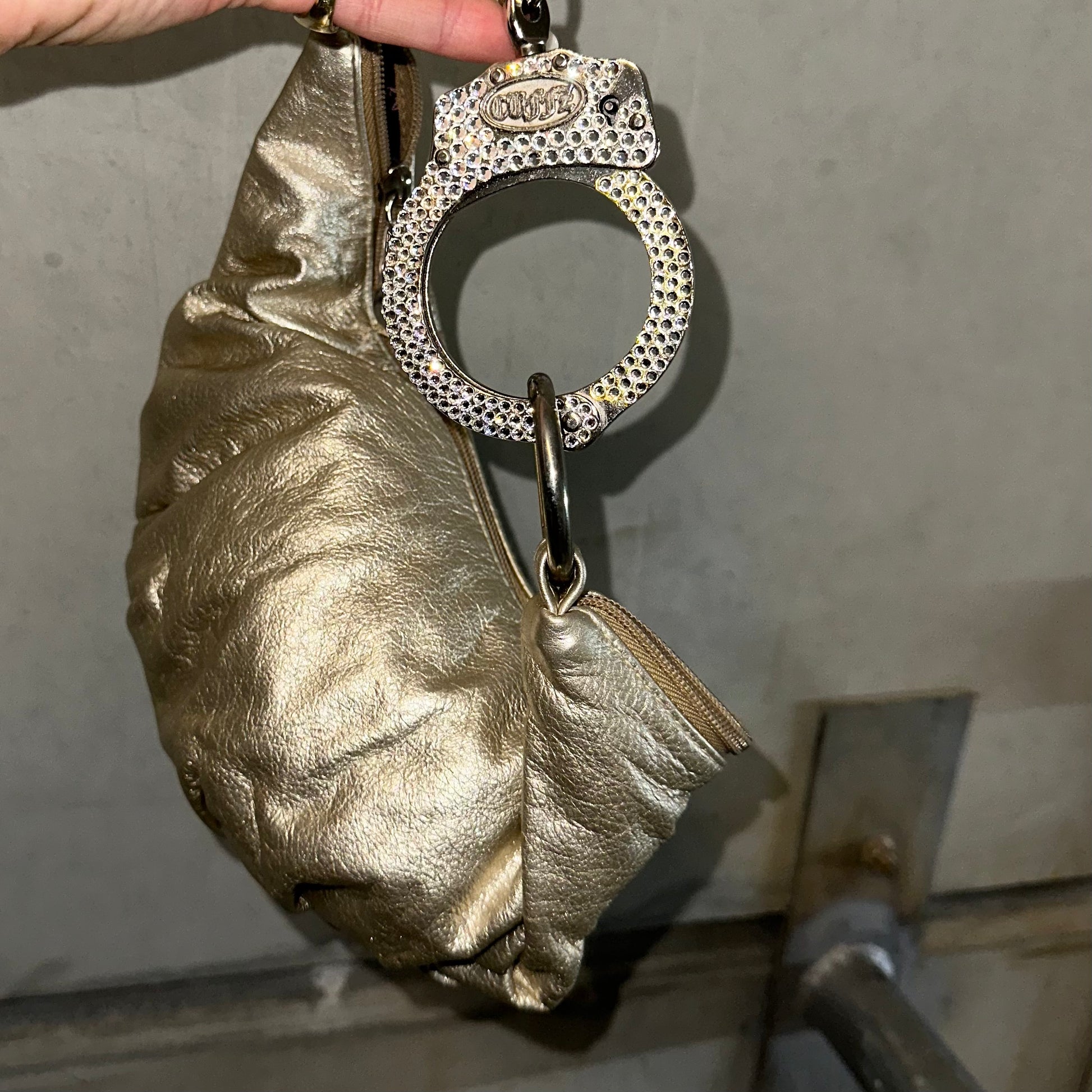 Amazing pale gold mini Cuffz bag with a Swarovski embellished handcuff detail.