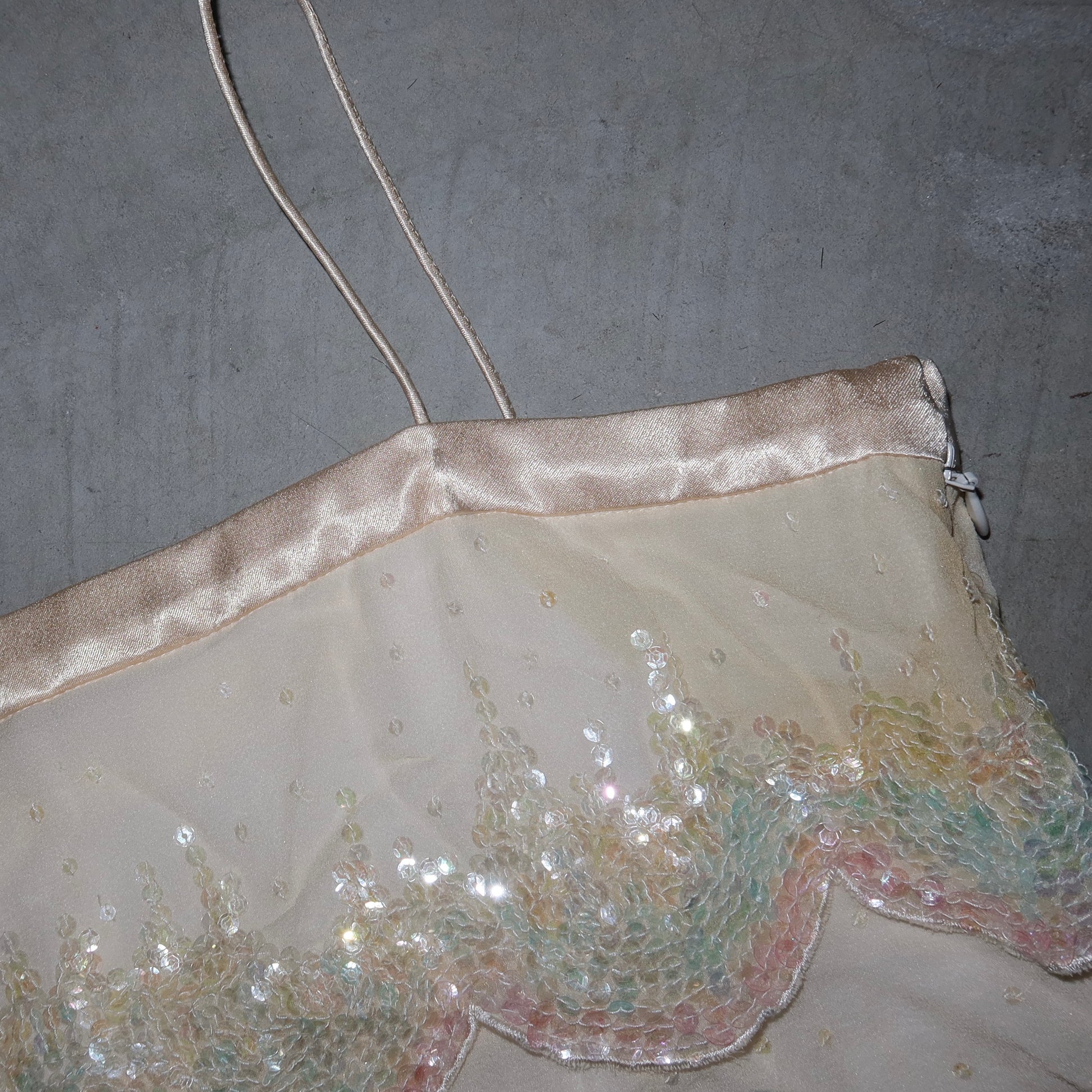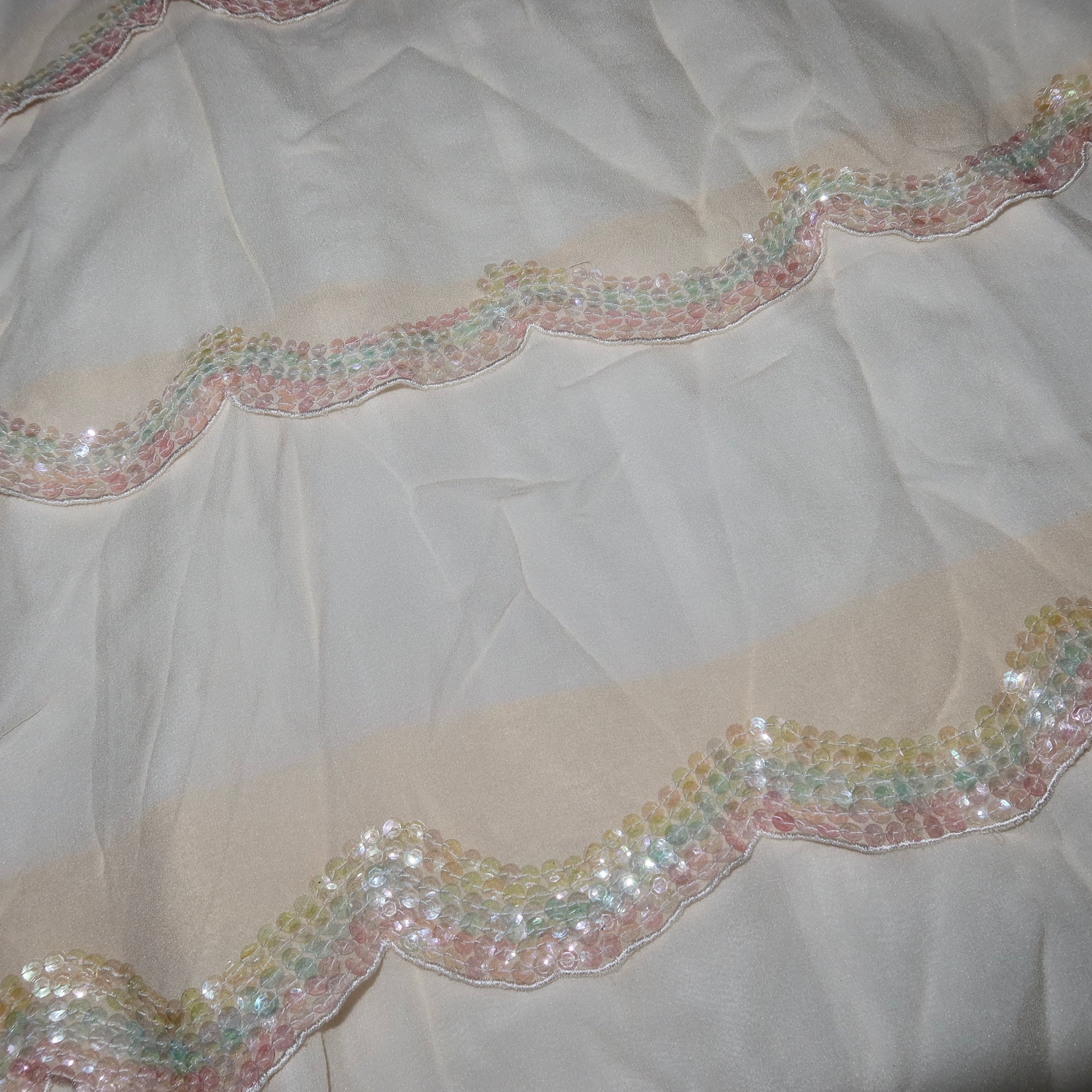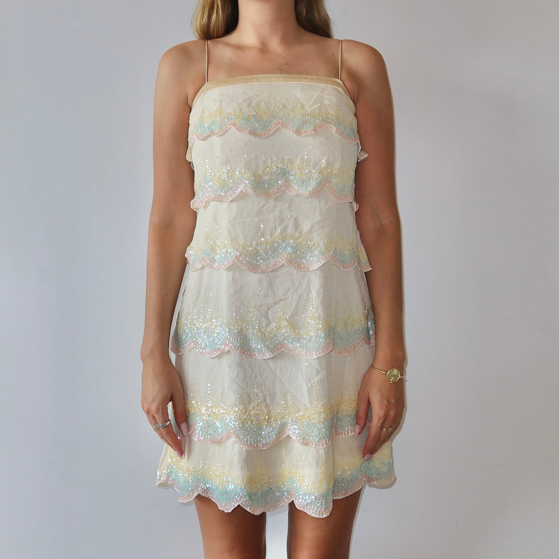 The cutest little Cynthia Rowley shift dress with sequin encrusted scallop layer details.