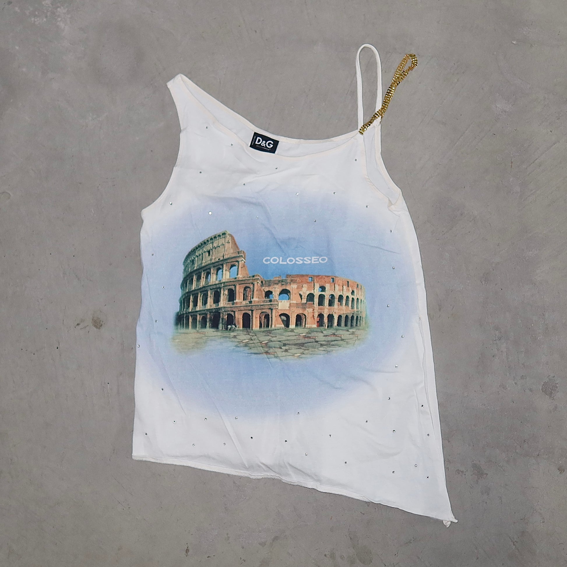 One shoulder-style D&G Colosseum tank top. This y2k style tank is studded with rhinestones and features the cutest gold glomesh strap.