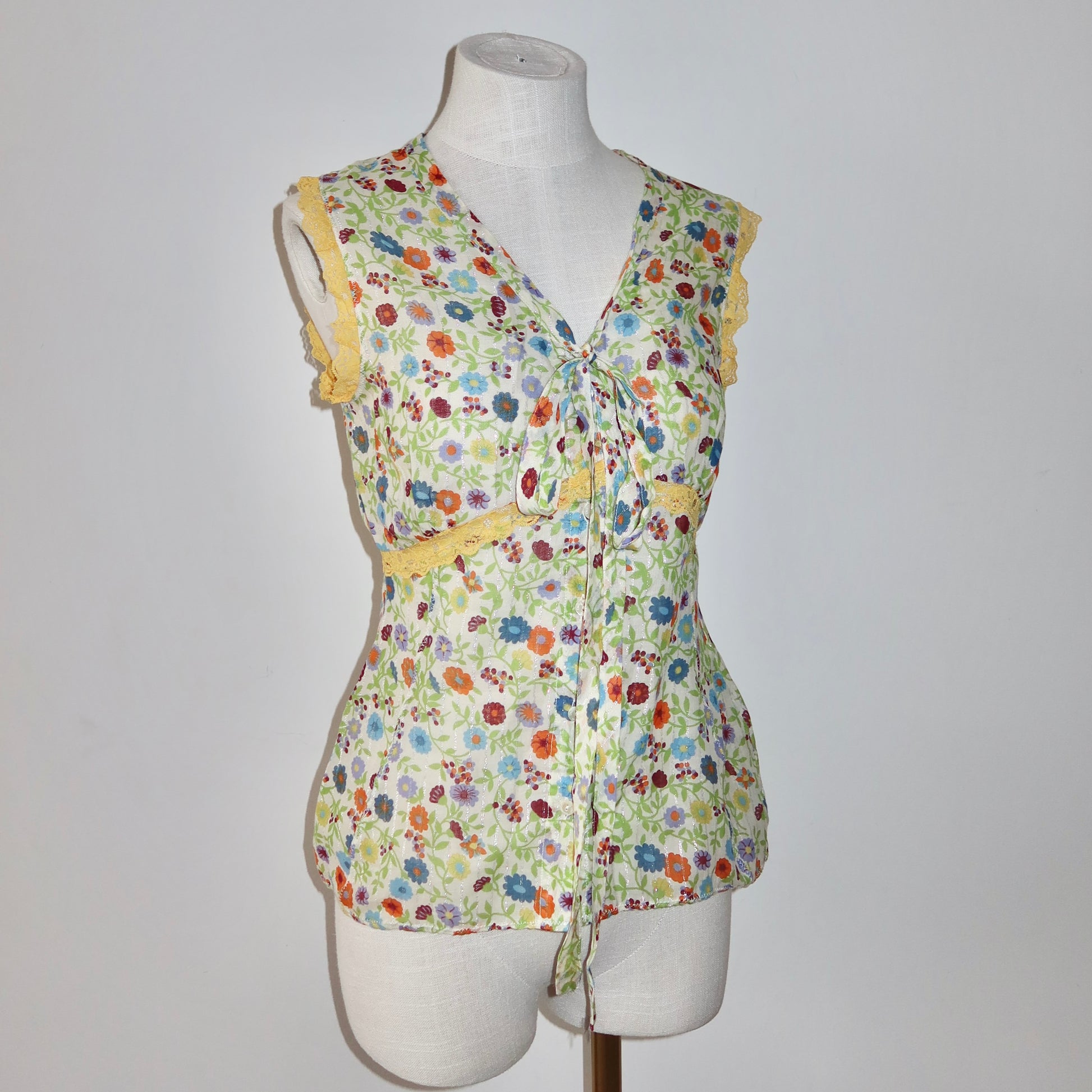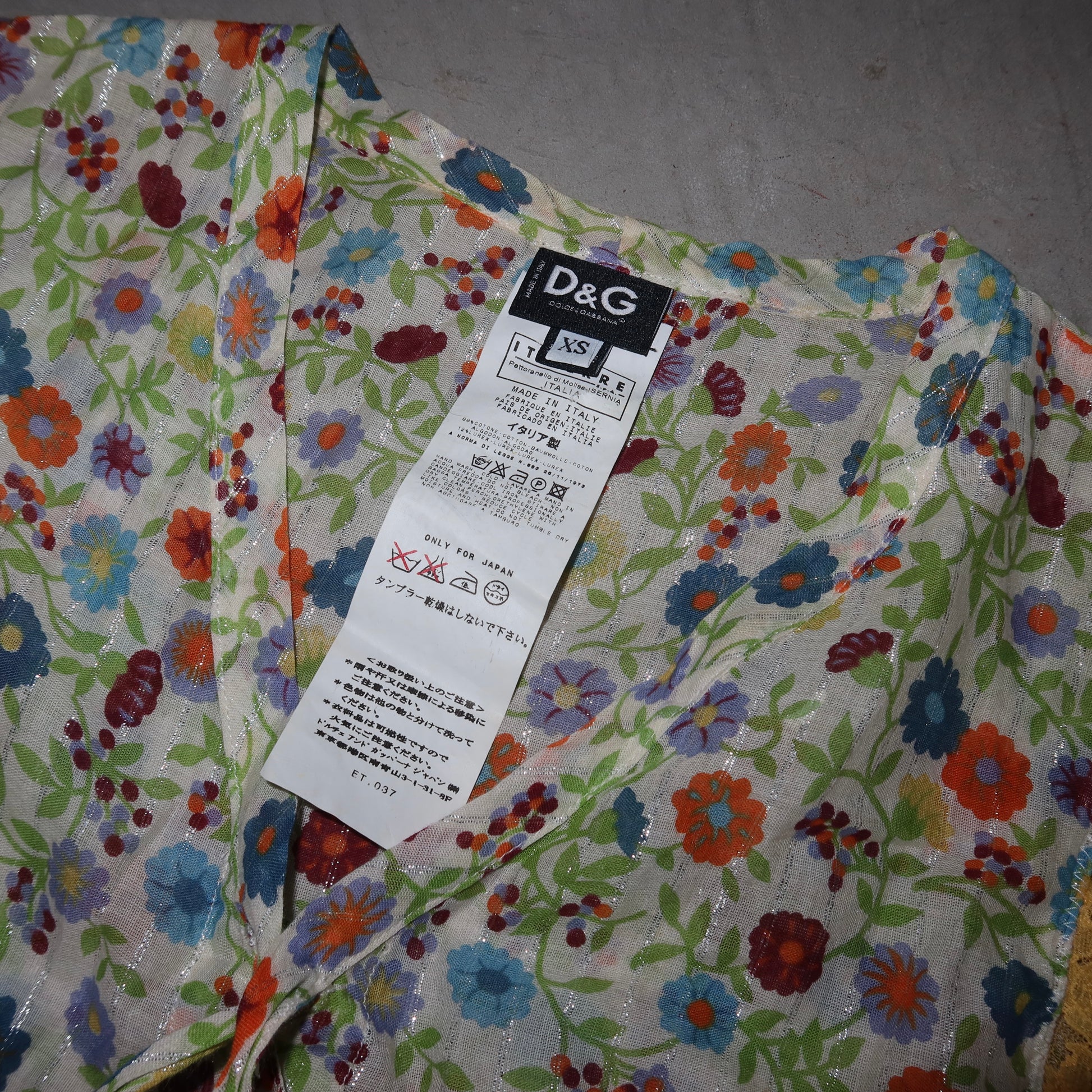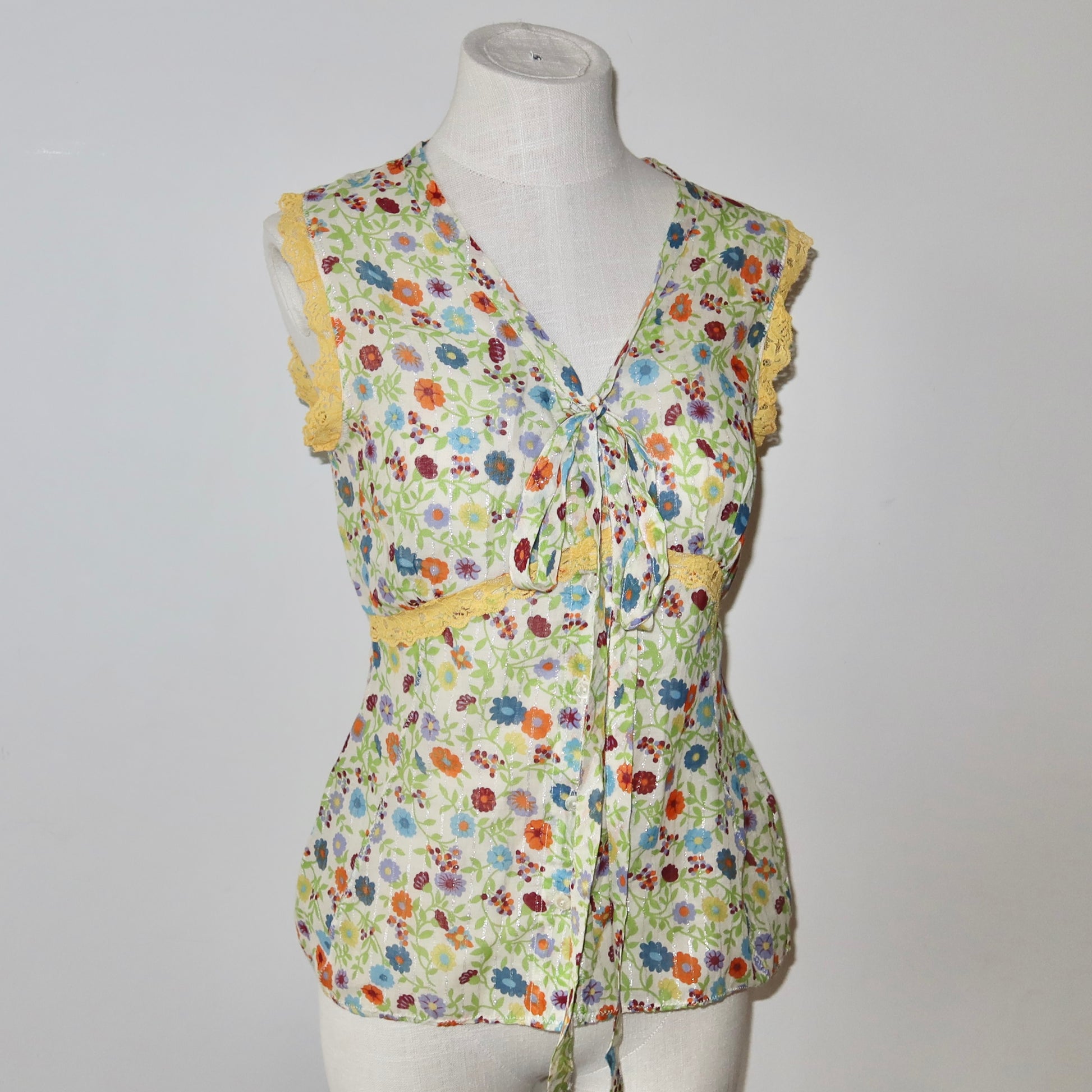 Beautiful floral sleeveless button up blouse by D&G. Features silver lurex weave and yellow lace hems. This style was made as a Japan exclusive.