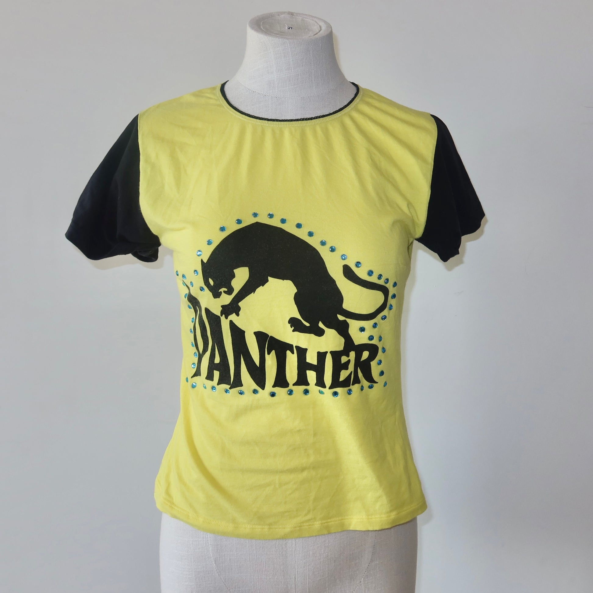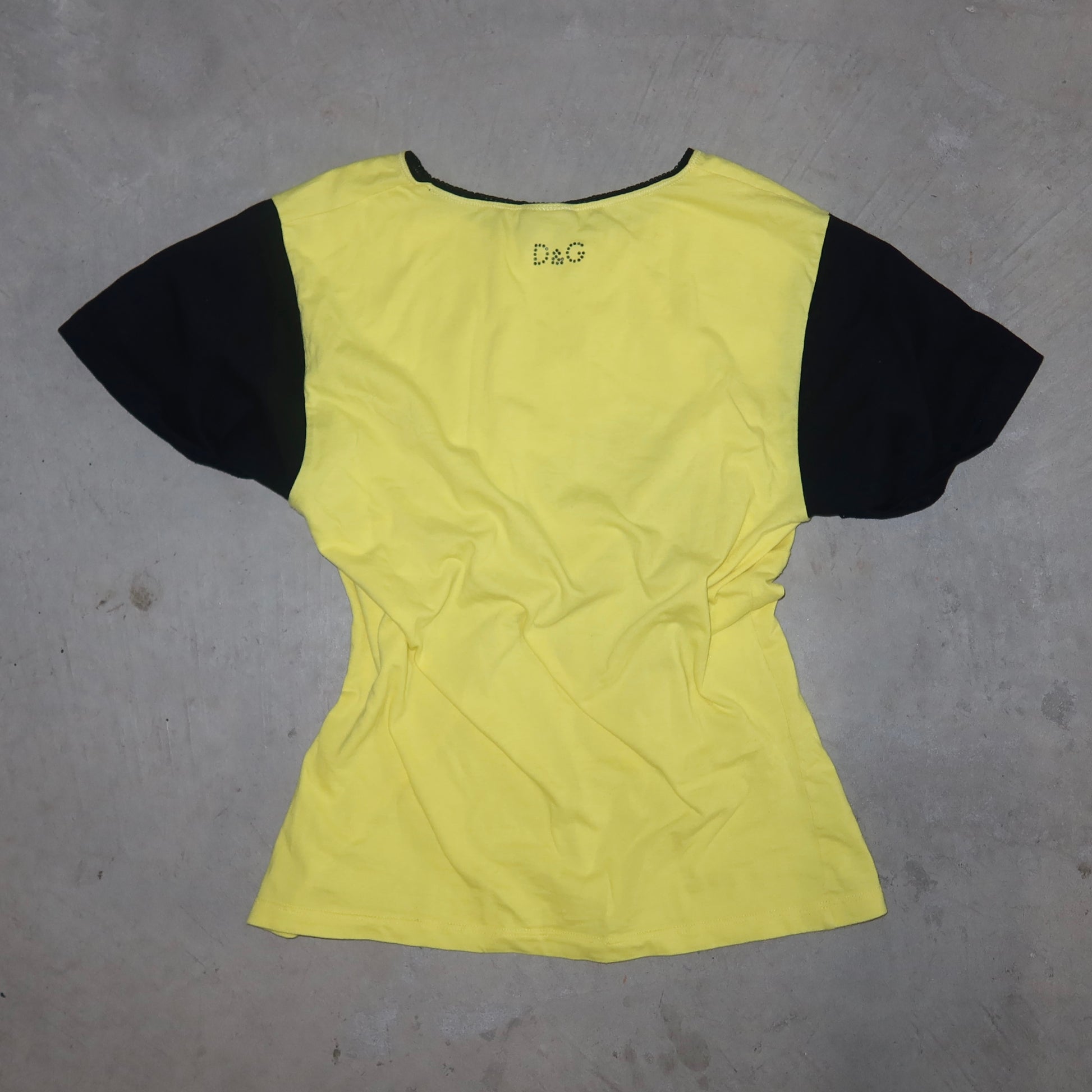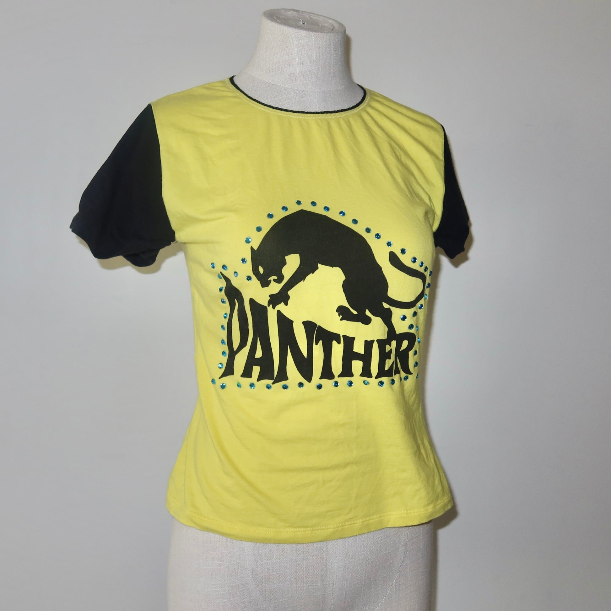 The coolest graphic tee from D&G's sought after 'Panther' collection. Vibrant yellow with panther graphic and blue rhinestone stud details. Sleeves are slightly flared and sewn in place with a roll-up effect. Mini 'D&G' rhinestone logo on the back!