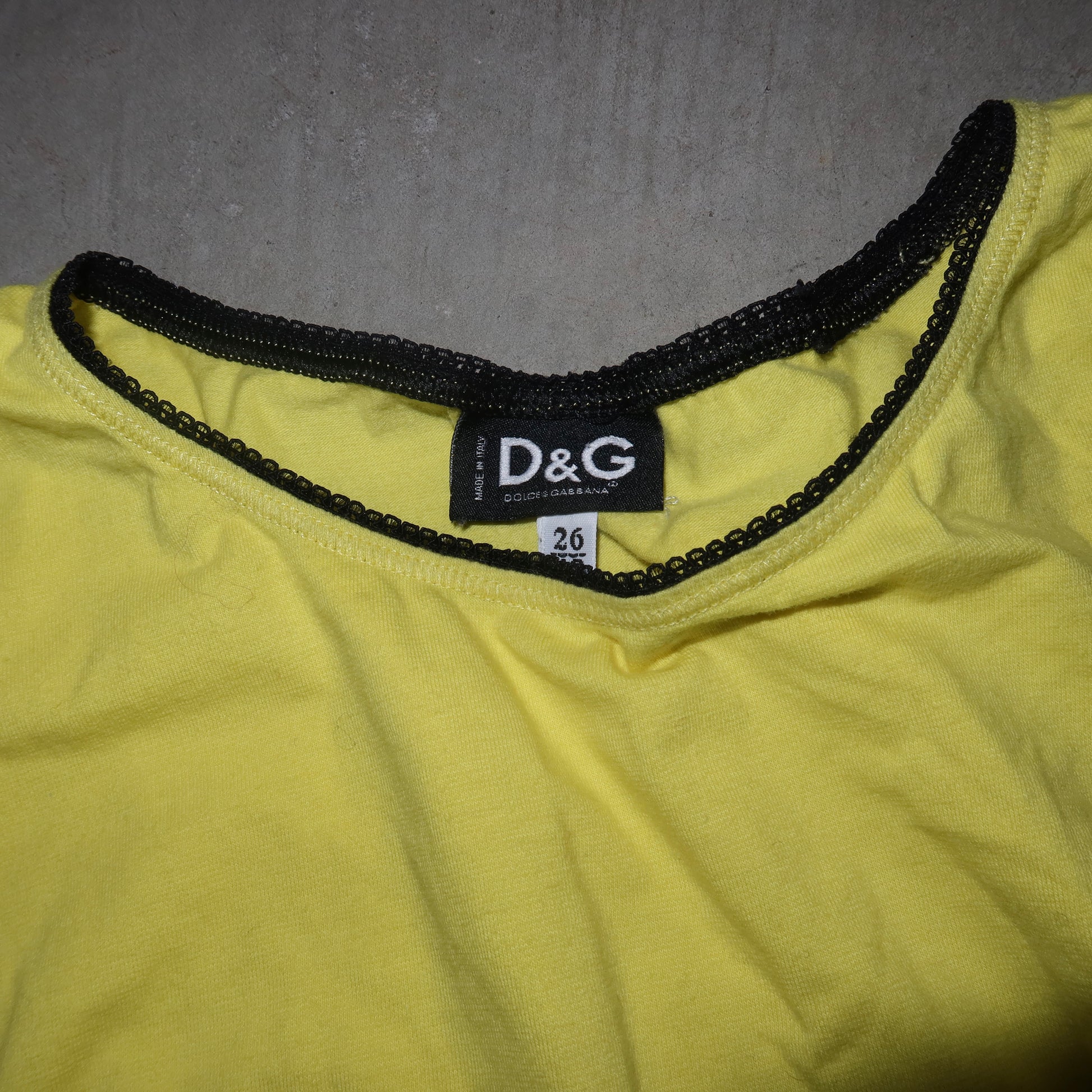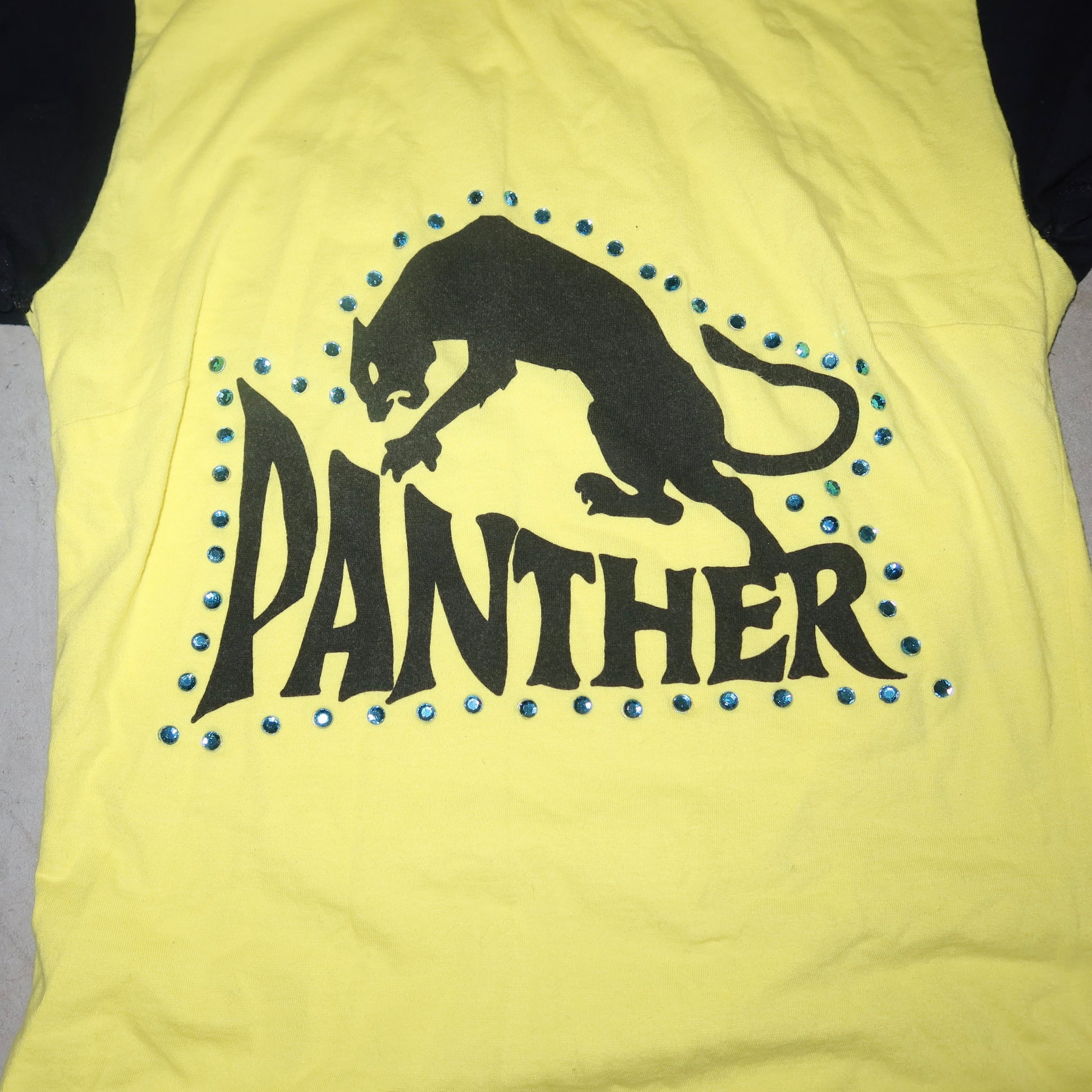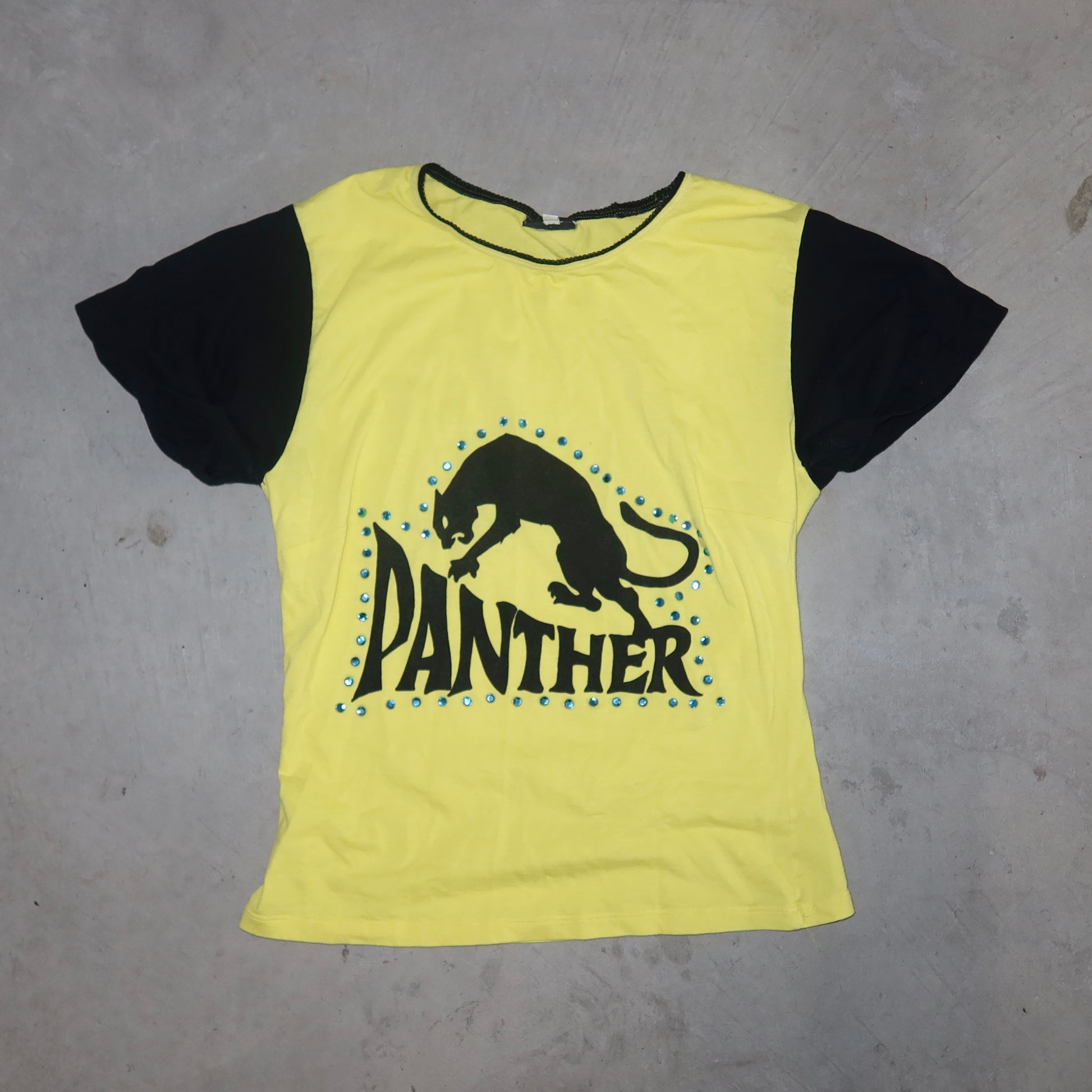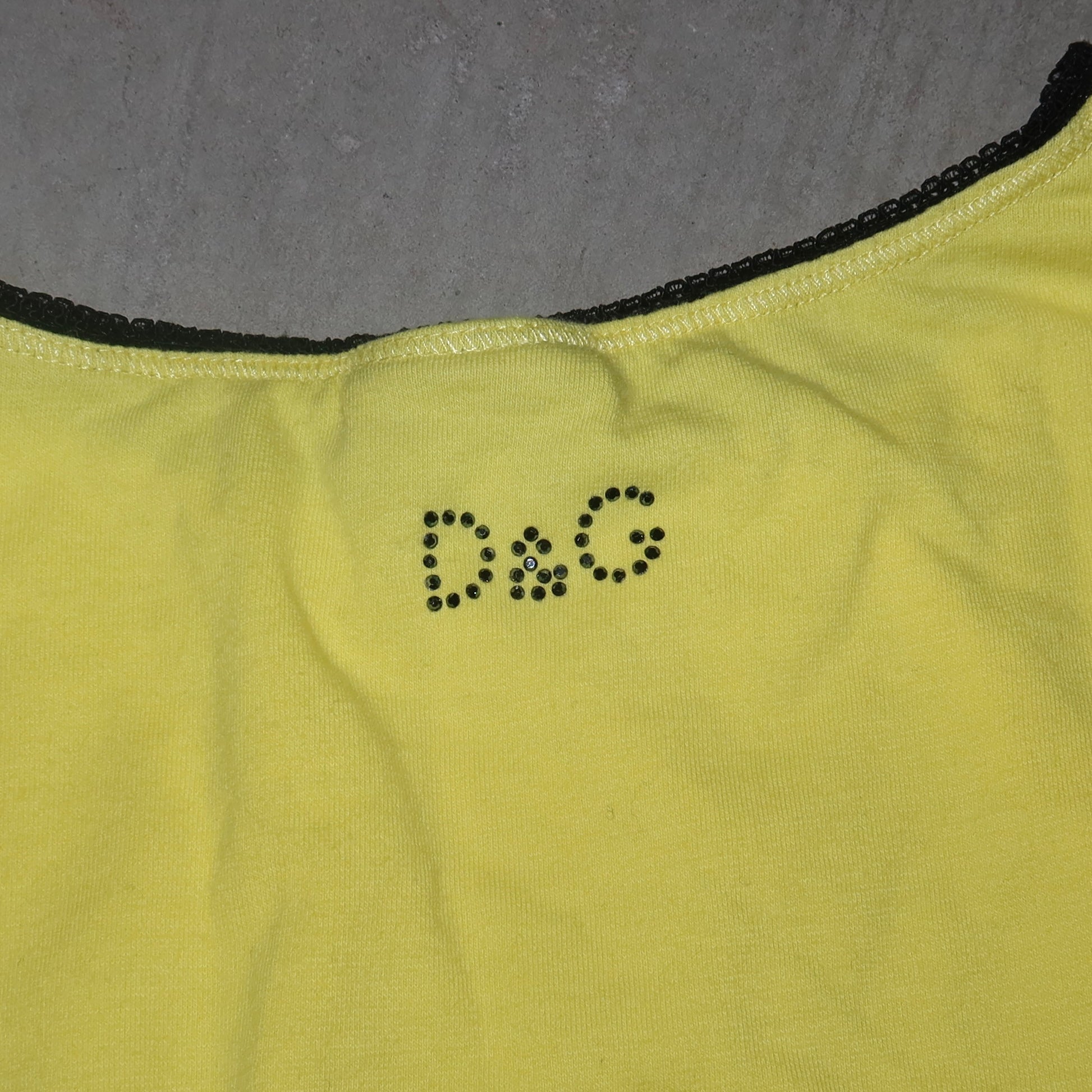The coolest graphic tee from D&G's sought after 'Panther' collection. Vibrant yellow with panther graphic and blue rhinestone stud details. Sleeves are slightly flared and sewn in place with a roll-up effect. Mini 'D&G' rhinestone logo on the back!