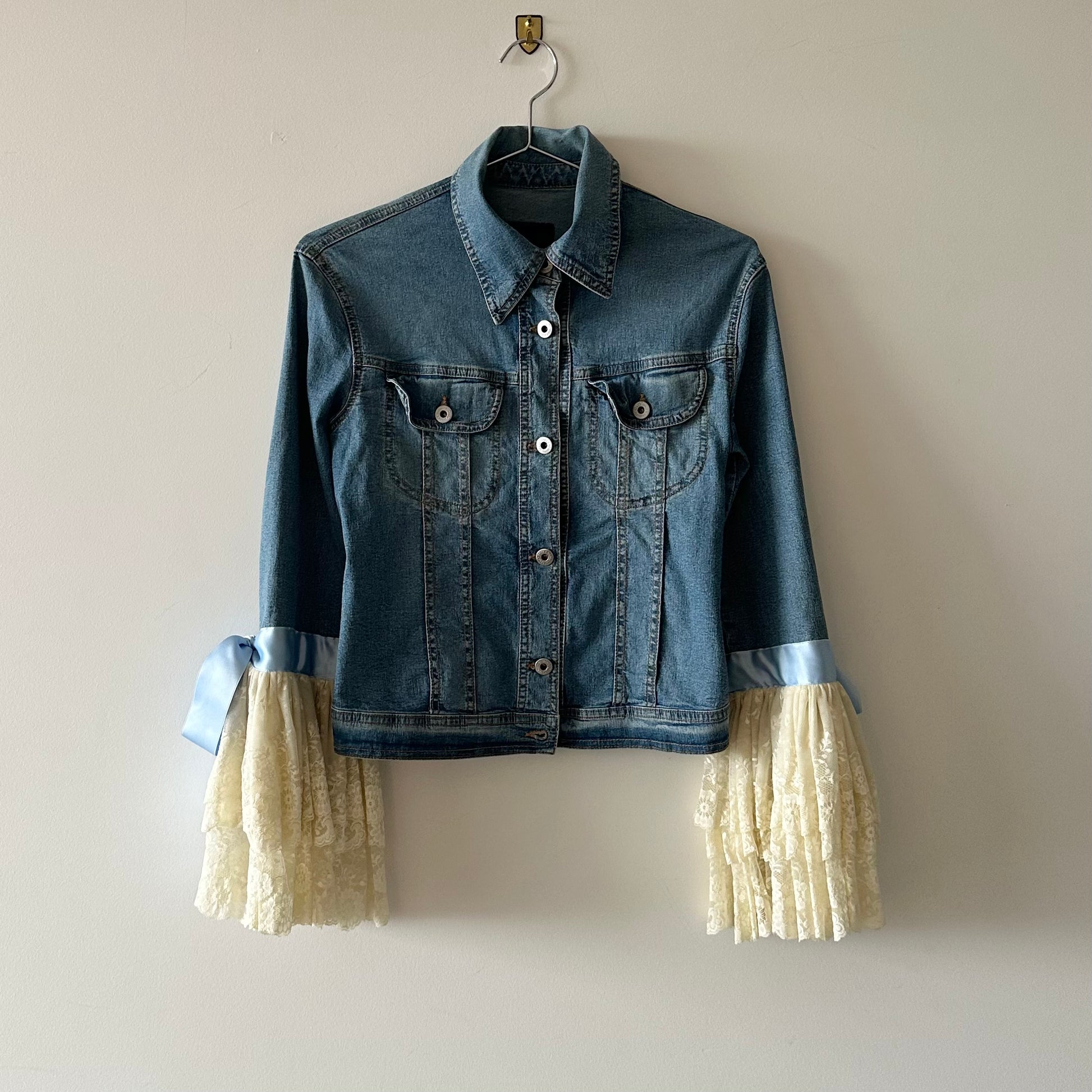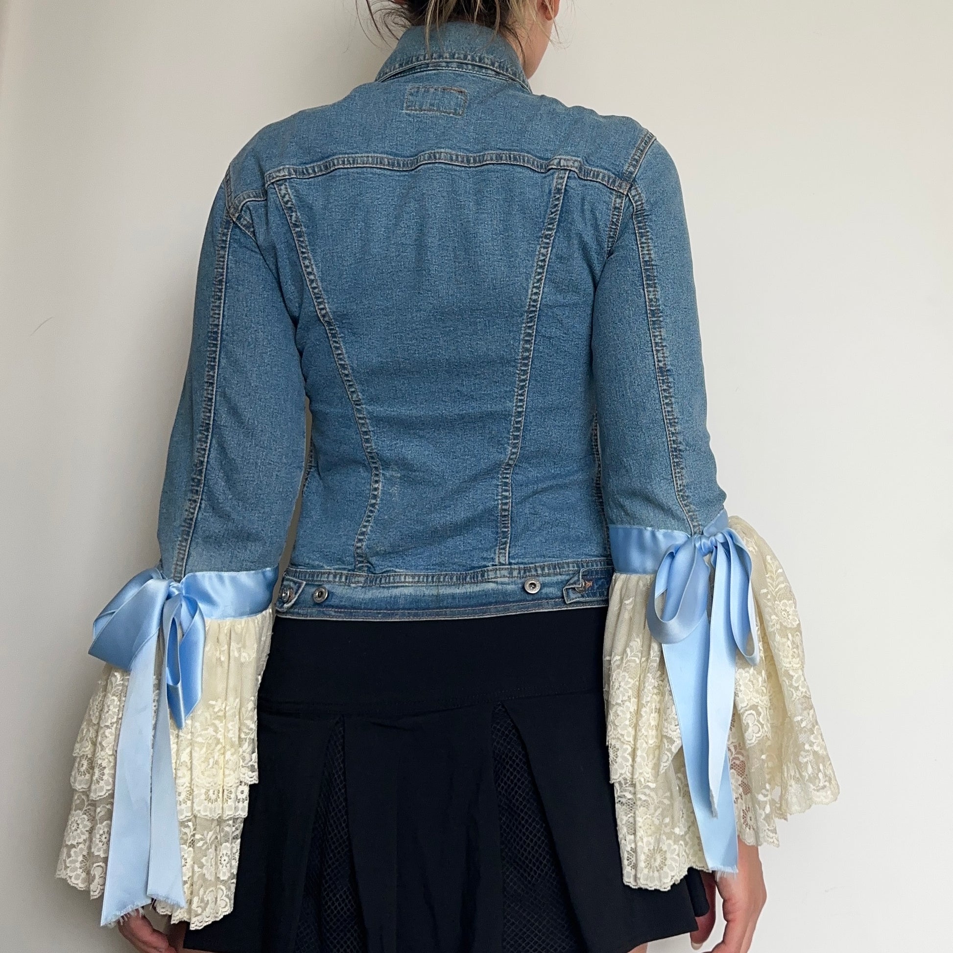 An iconic piece of fashion history - D&G SS2000 runway denim jacket with layered / tiered lace sleeves and a blue satin bow detail. We sold the capris to this look earlier this year and were delighted to come across the jacket from the same look! Please note, these are very rare pieces.