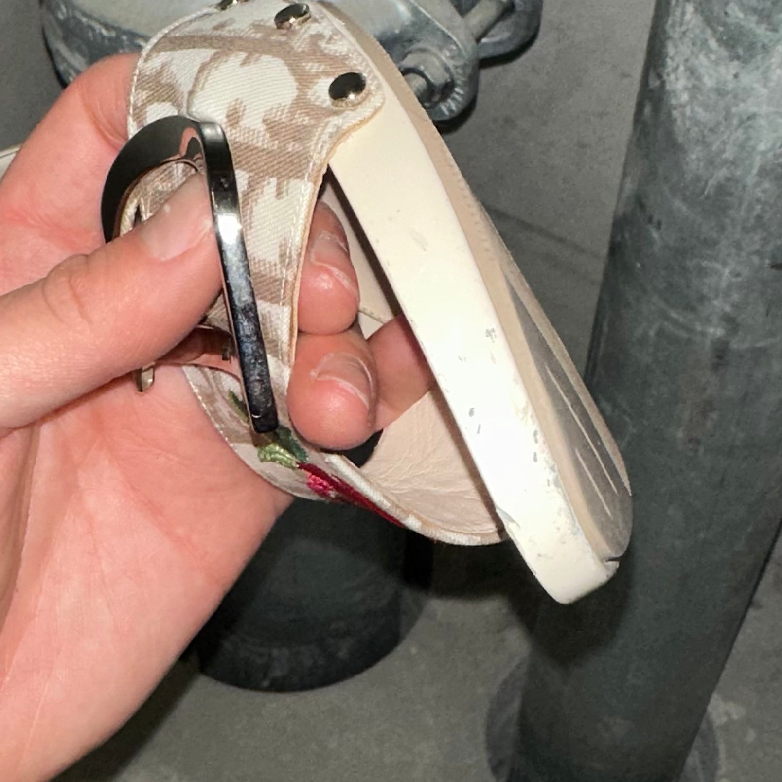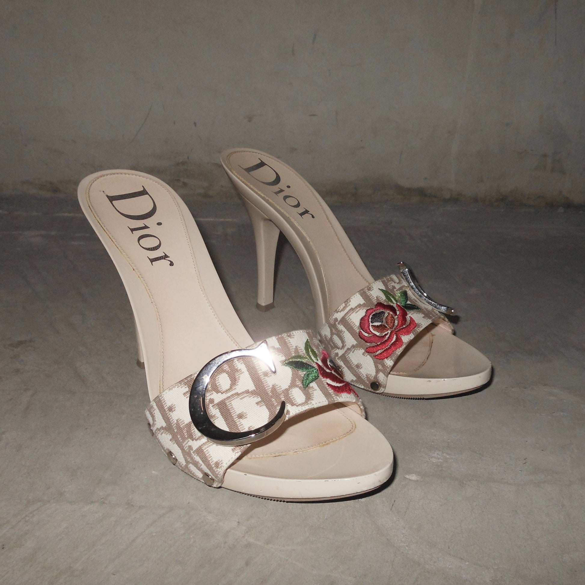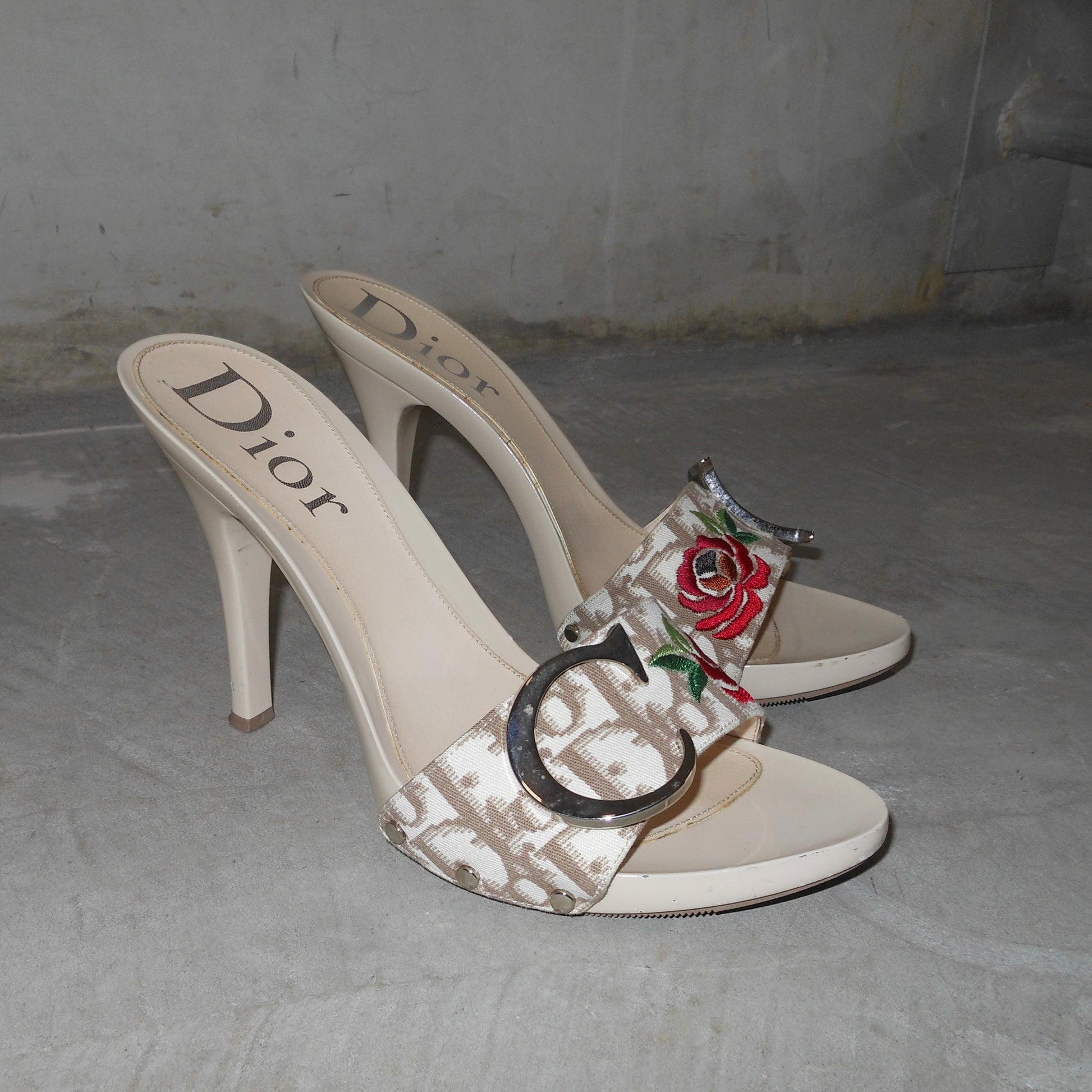 Amazing Galliano-era Dior high heels with their iconic early 00’s beige trotter print, floral embroidery, and classic ‘CD’ hardware.