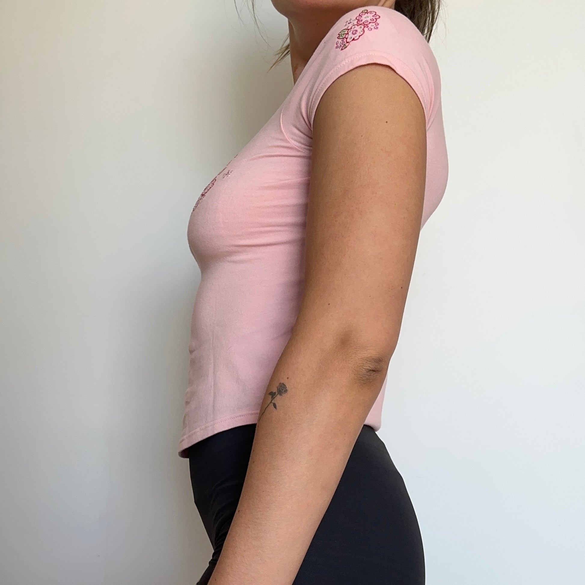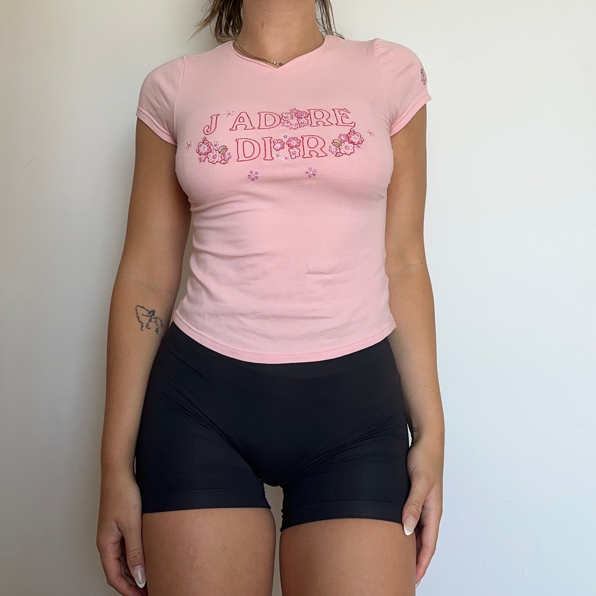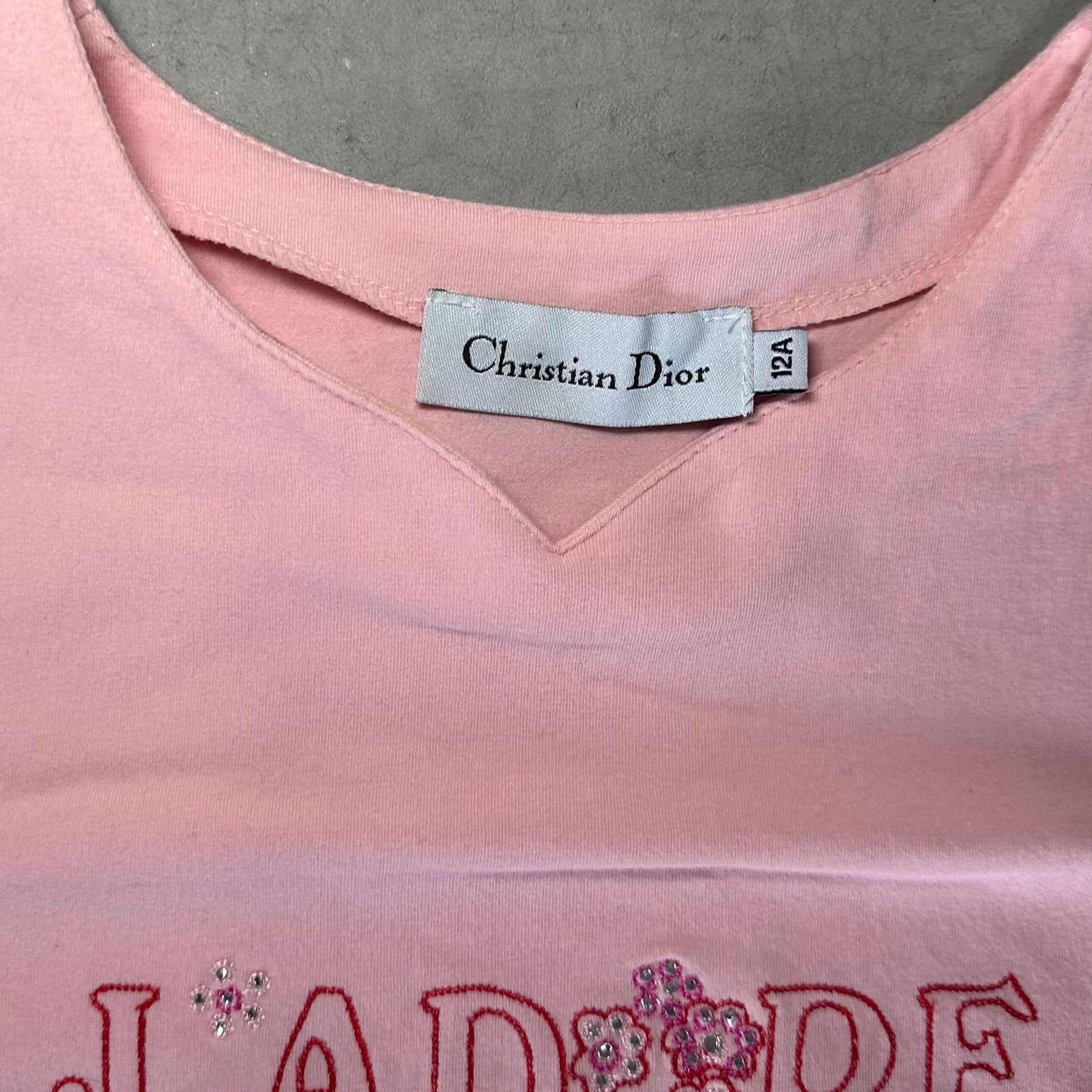 The cutest baby pink Dior kidswear ‘J’Adore Dior’ tee. This, in my humble opinion, is cuter than most adult versions 😮💨 Because this is a kids tee, it has the cutest baby tee fit, featuring the sweetest embellished floral details, unique sweetheart V neckline, and cap sleeves.