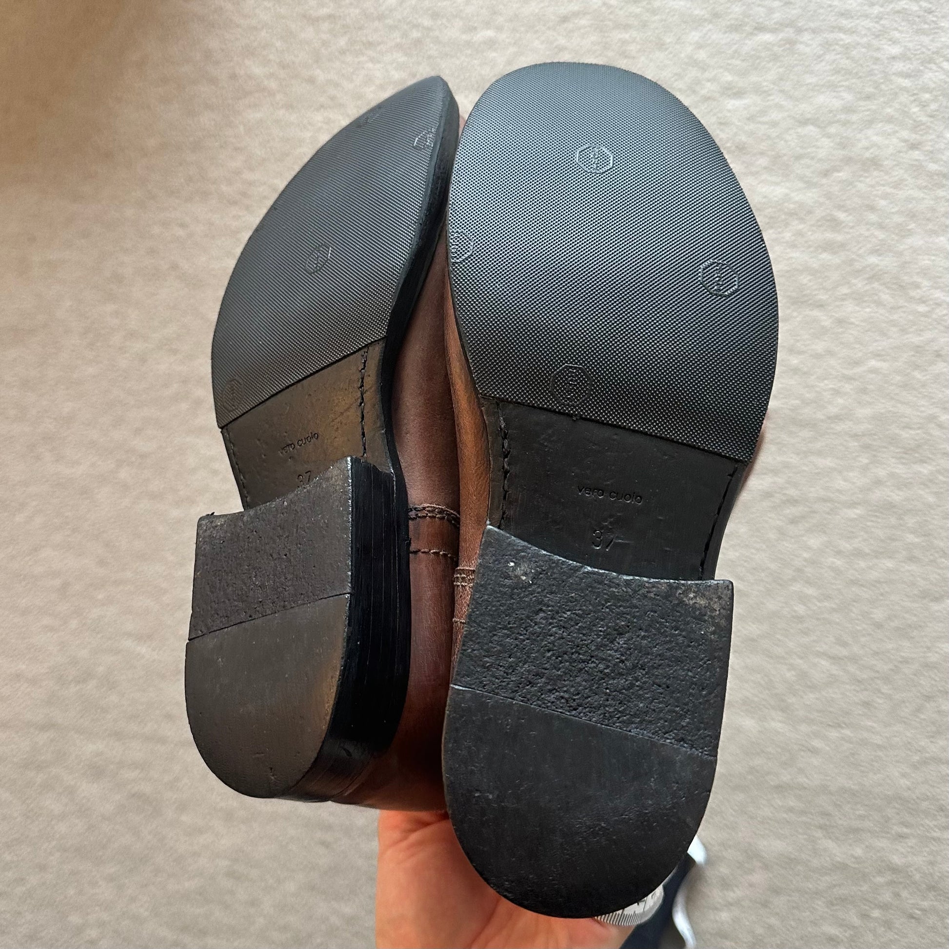 Size 37. Run small! Best fit 36.5/true 37. Please note that these must be pulled on.