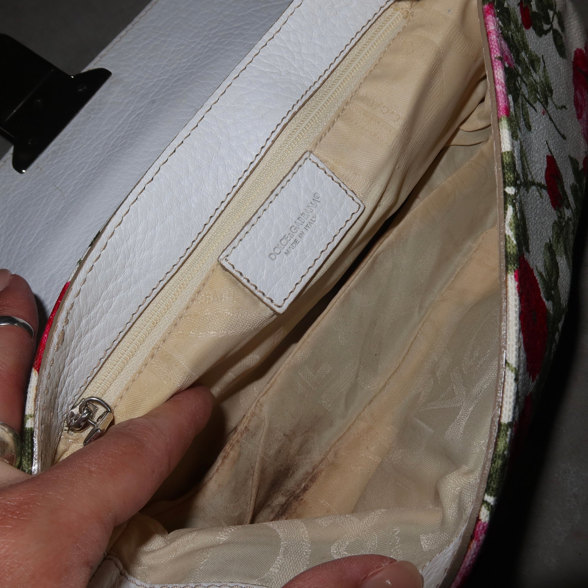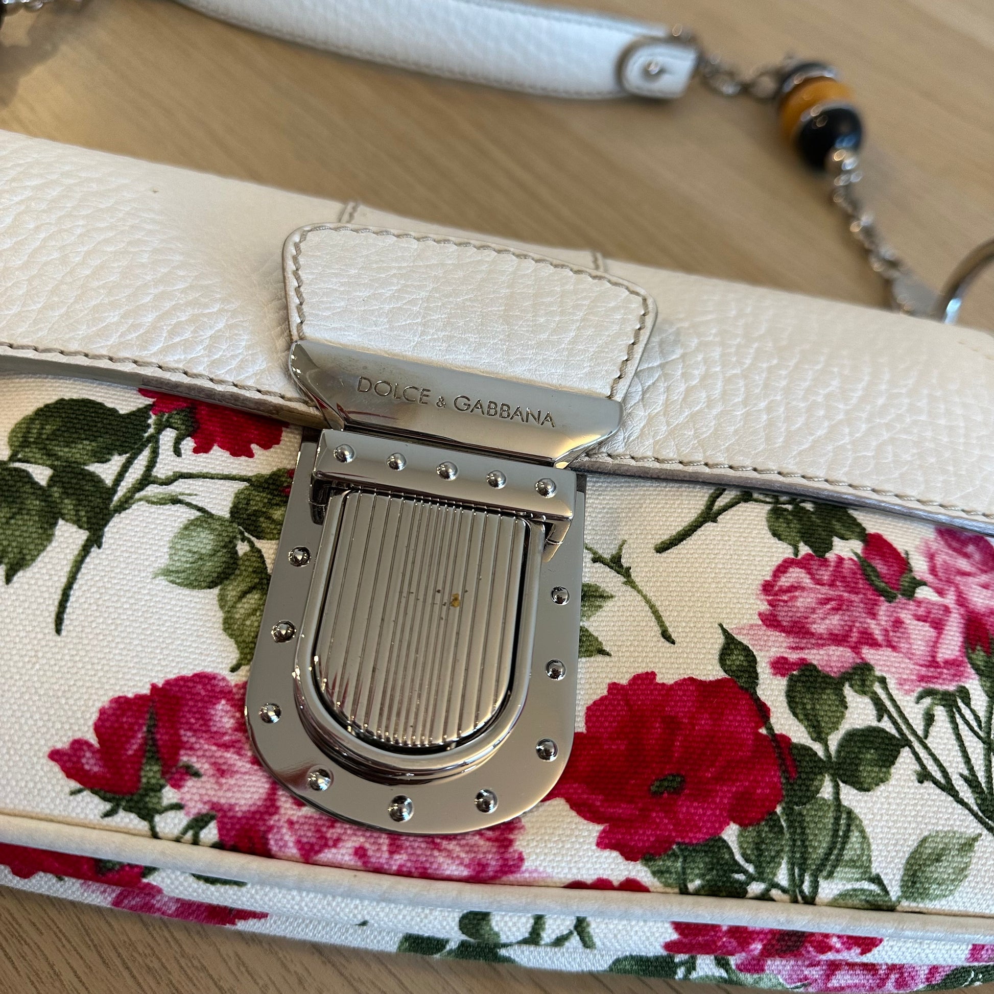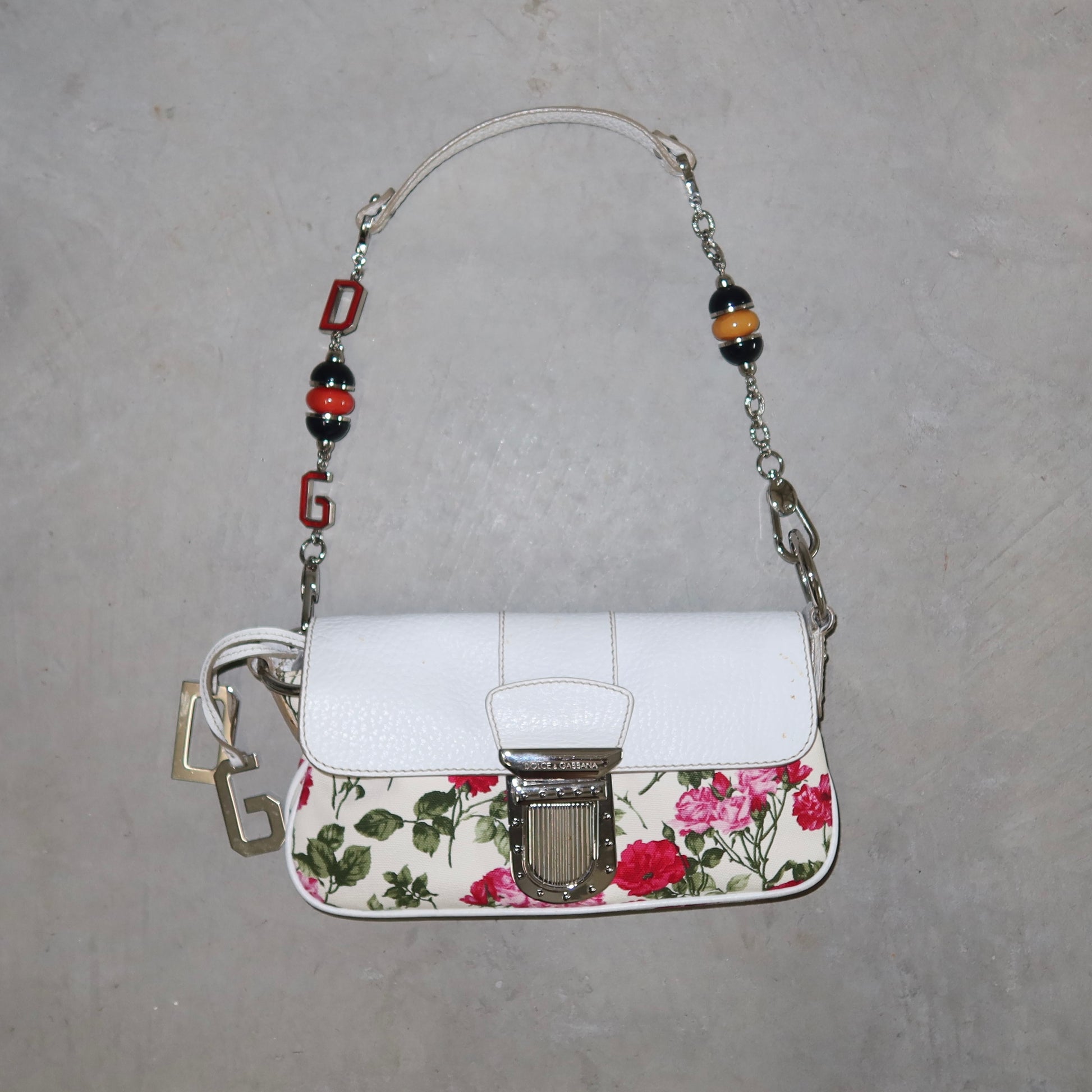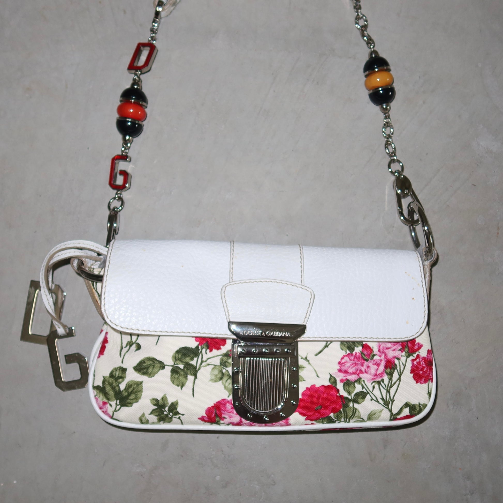 Beautiful with leather and canvas floral pattern Dolce & Gabbana flap front shoulder bag with incredible bead and chain handle details. 'D' and 'G' charms attached.