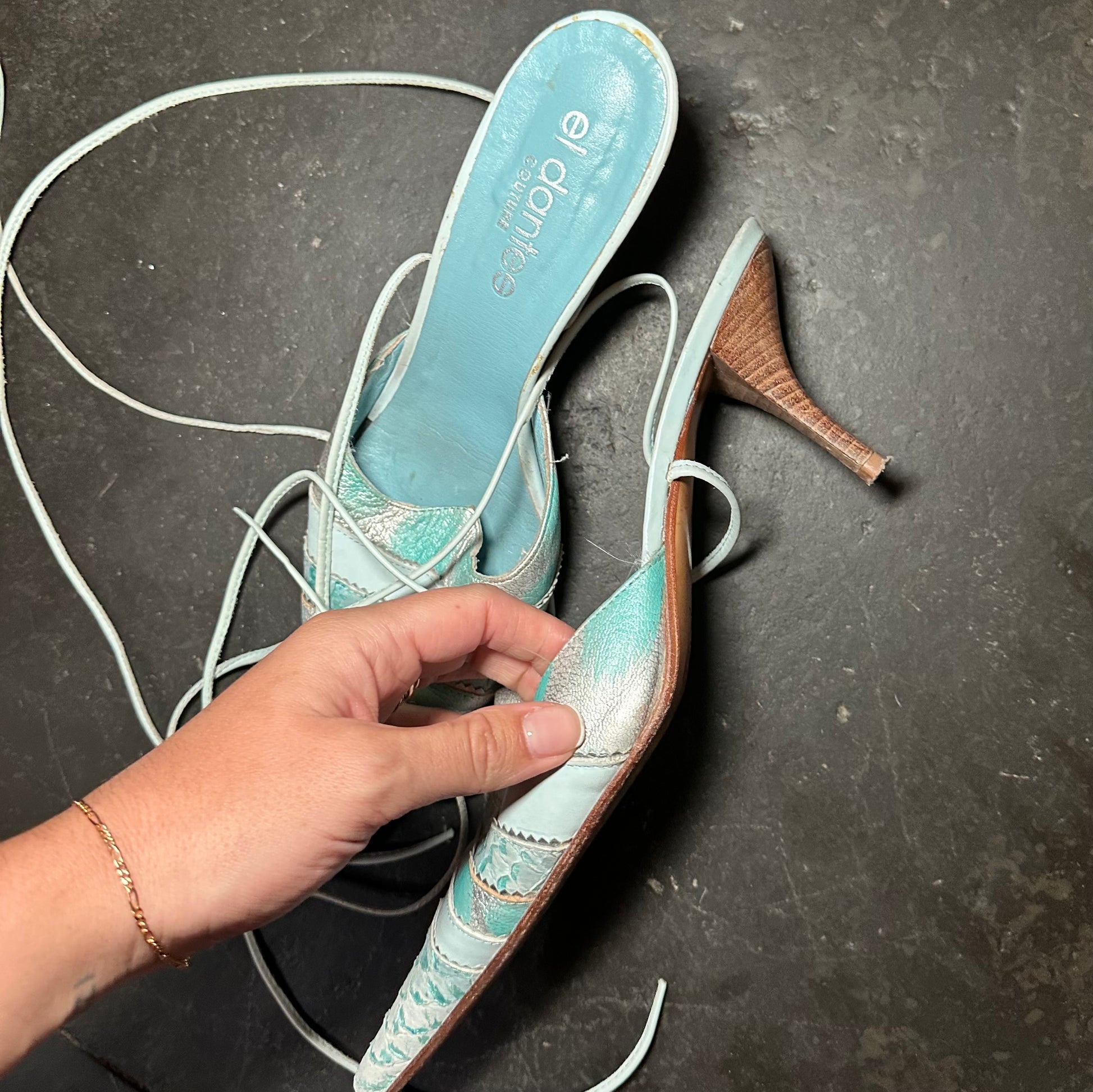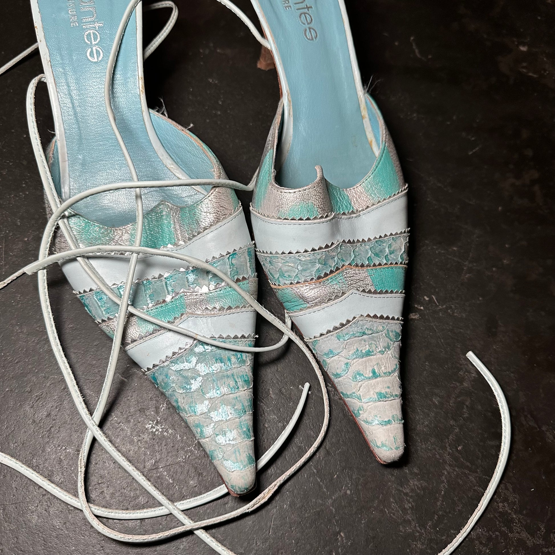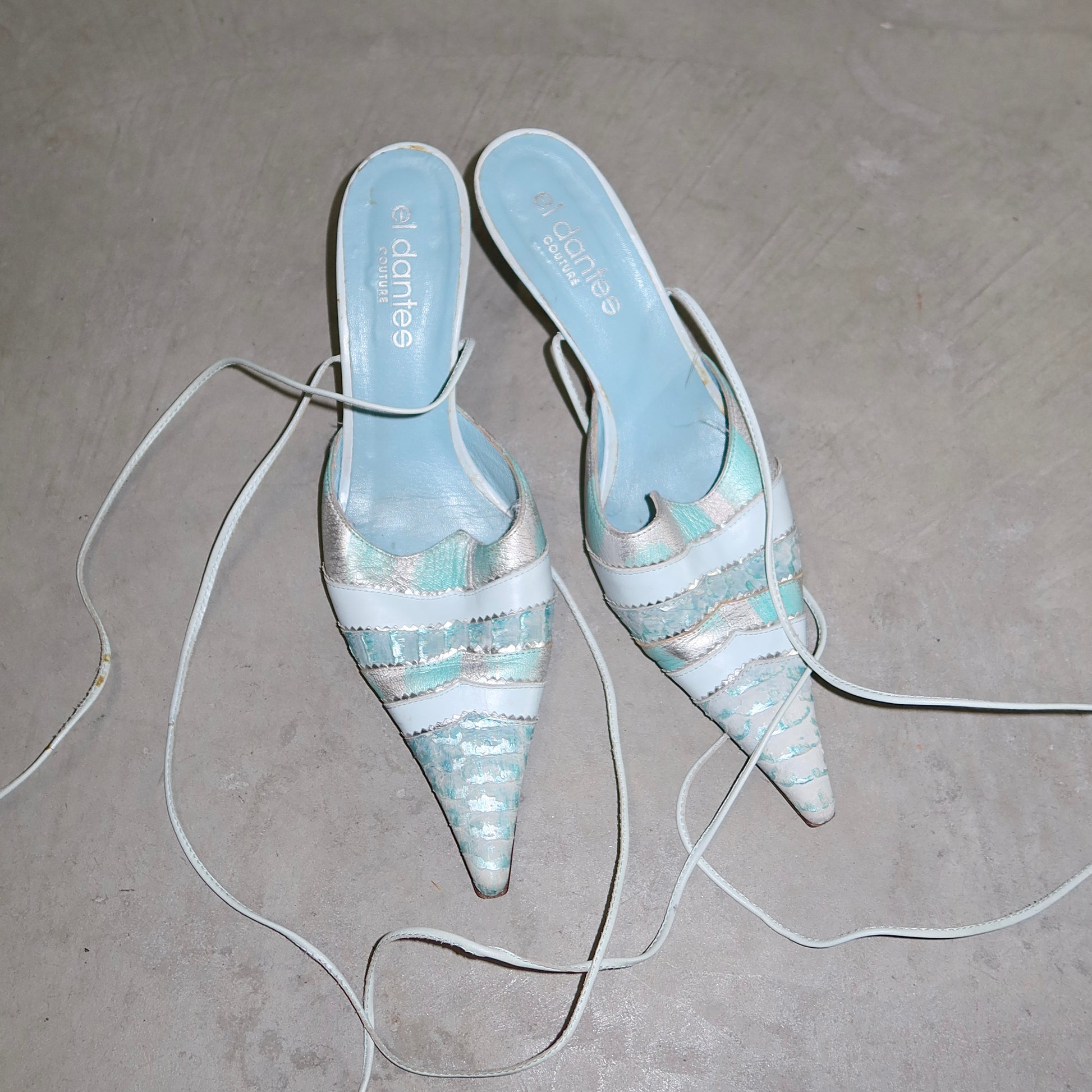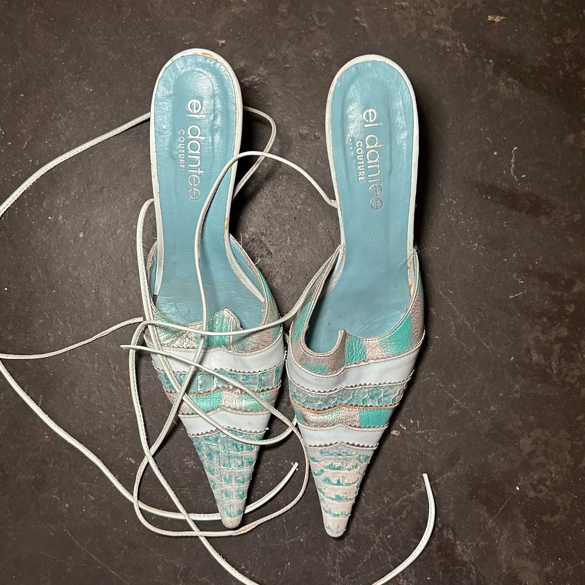 Gorgeous rare blue El Dante’s mules with snakeskin effect accents and ankle wrap detail.