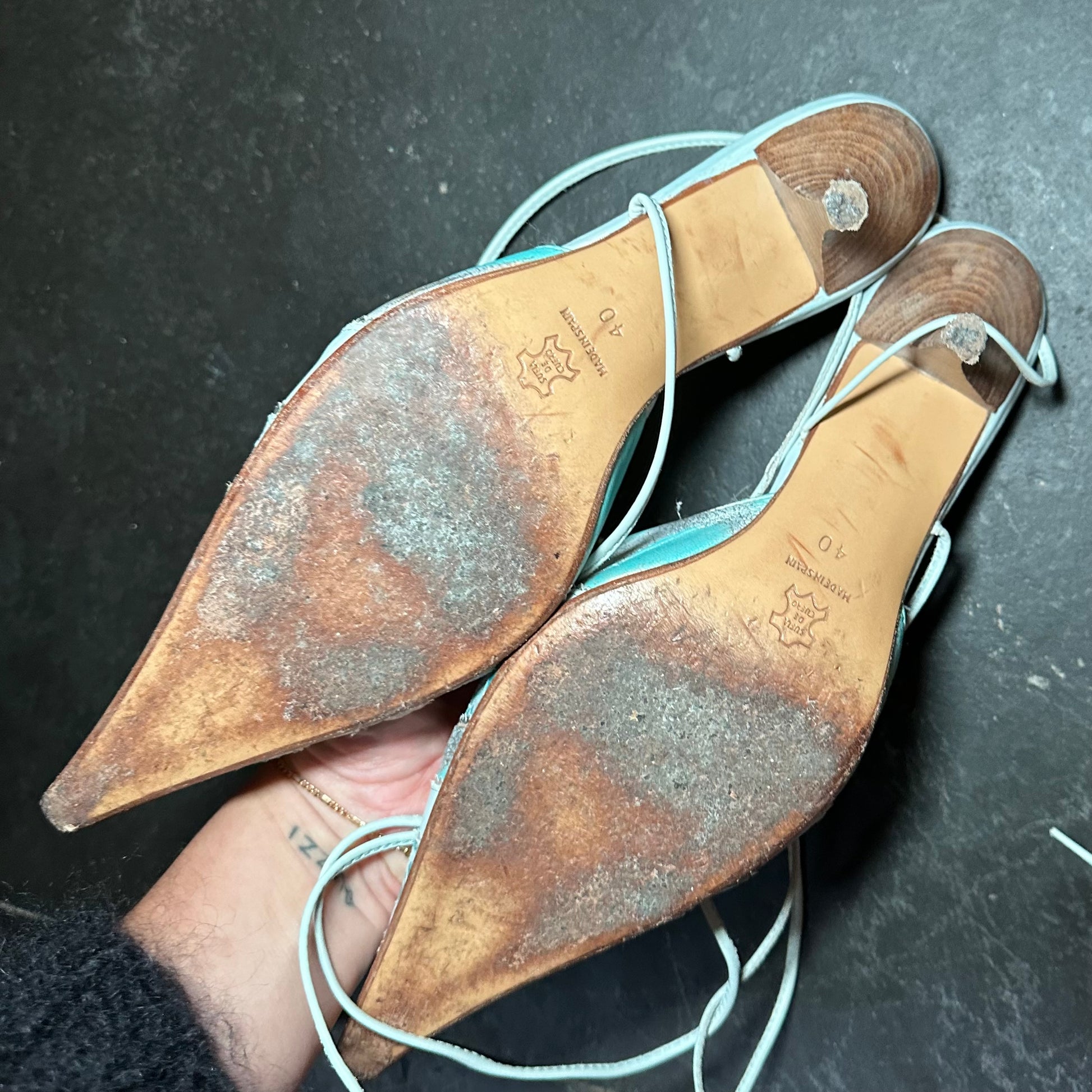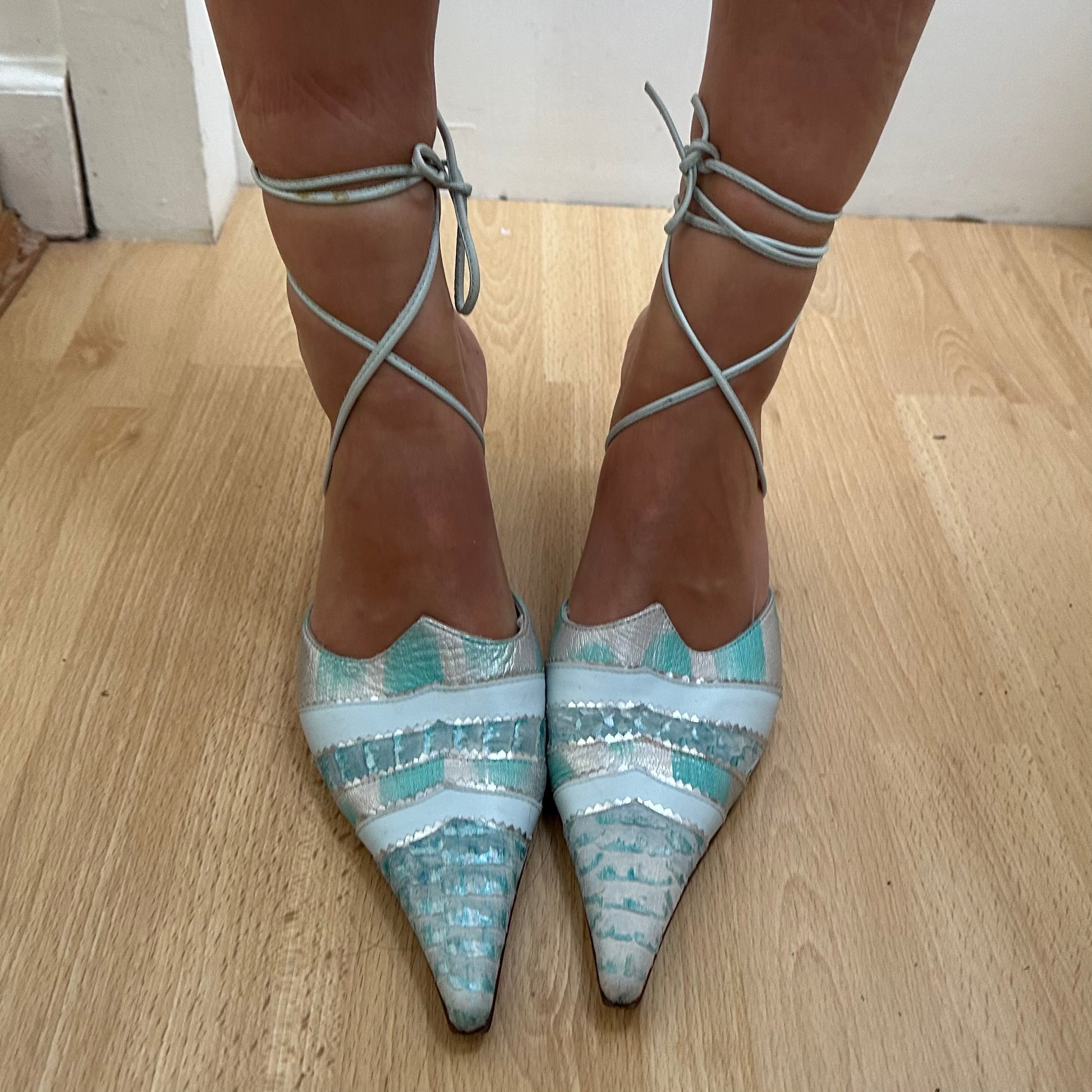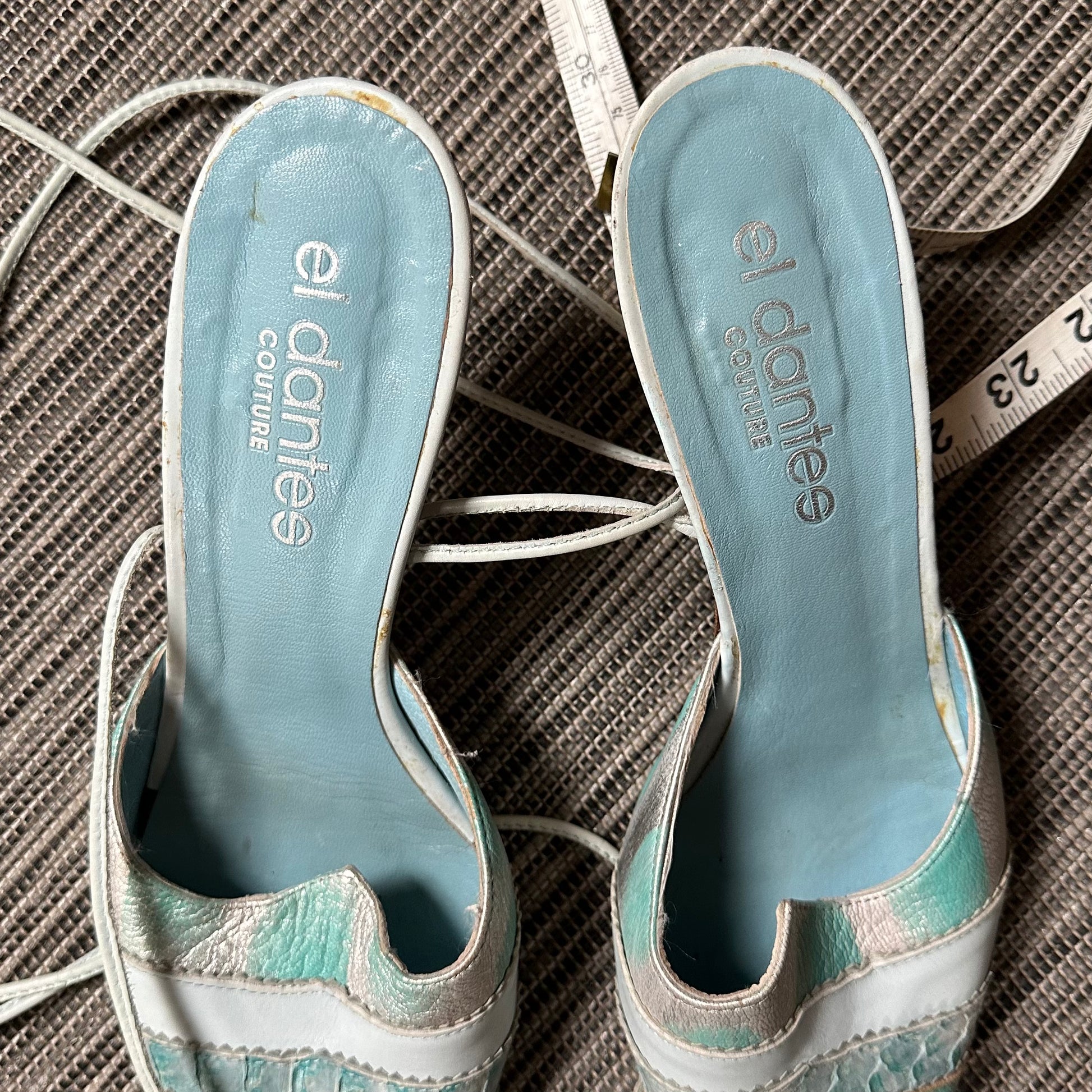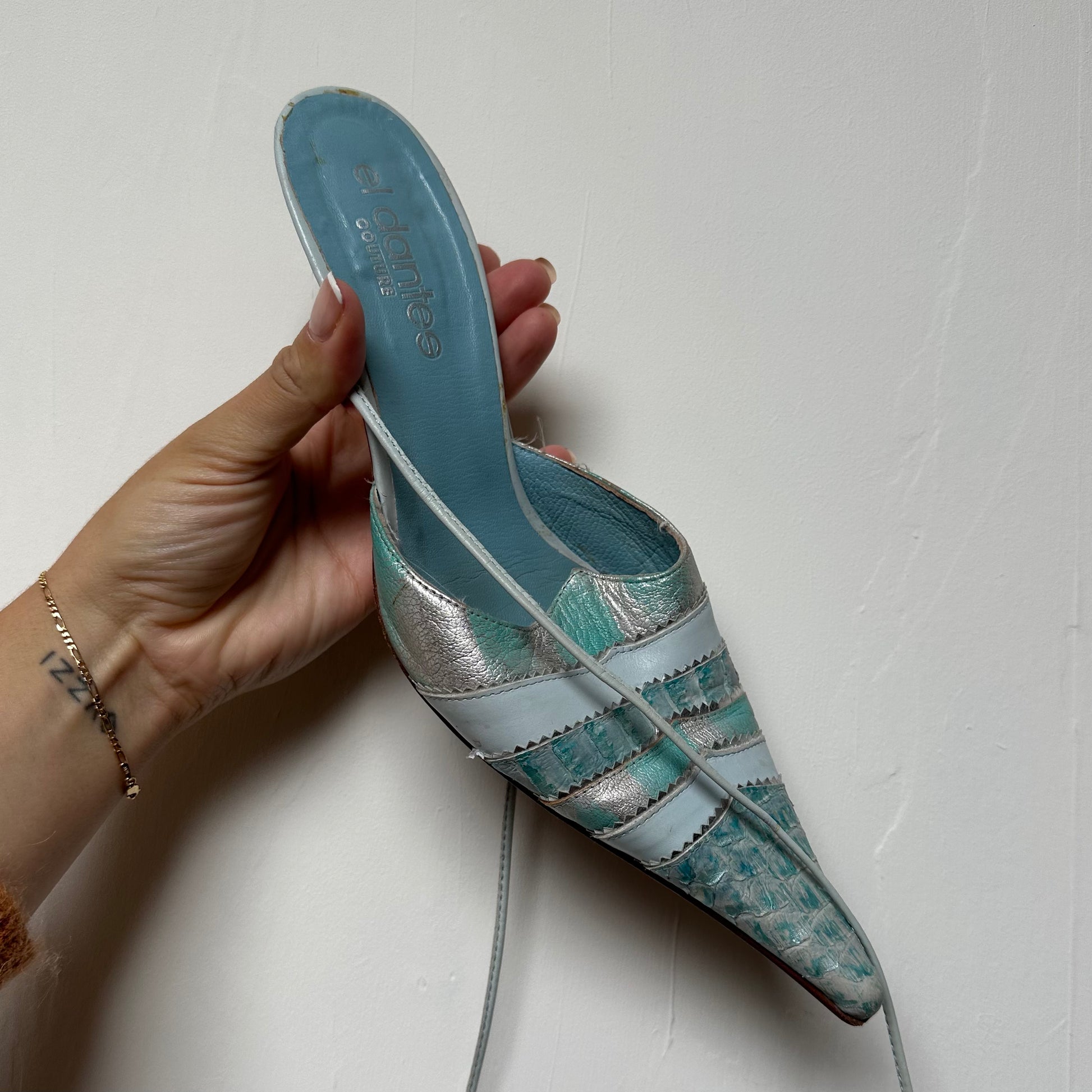 Gorgeous rare blue El Dante’s mules with snakeskin effect accents and ankle wrap detail.