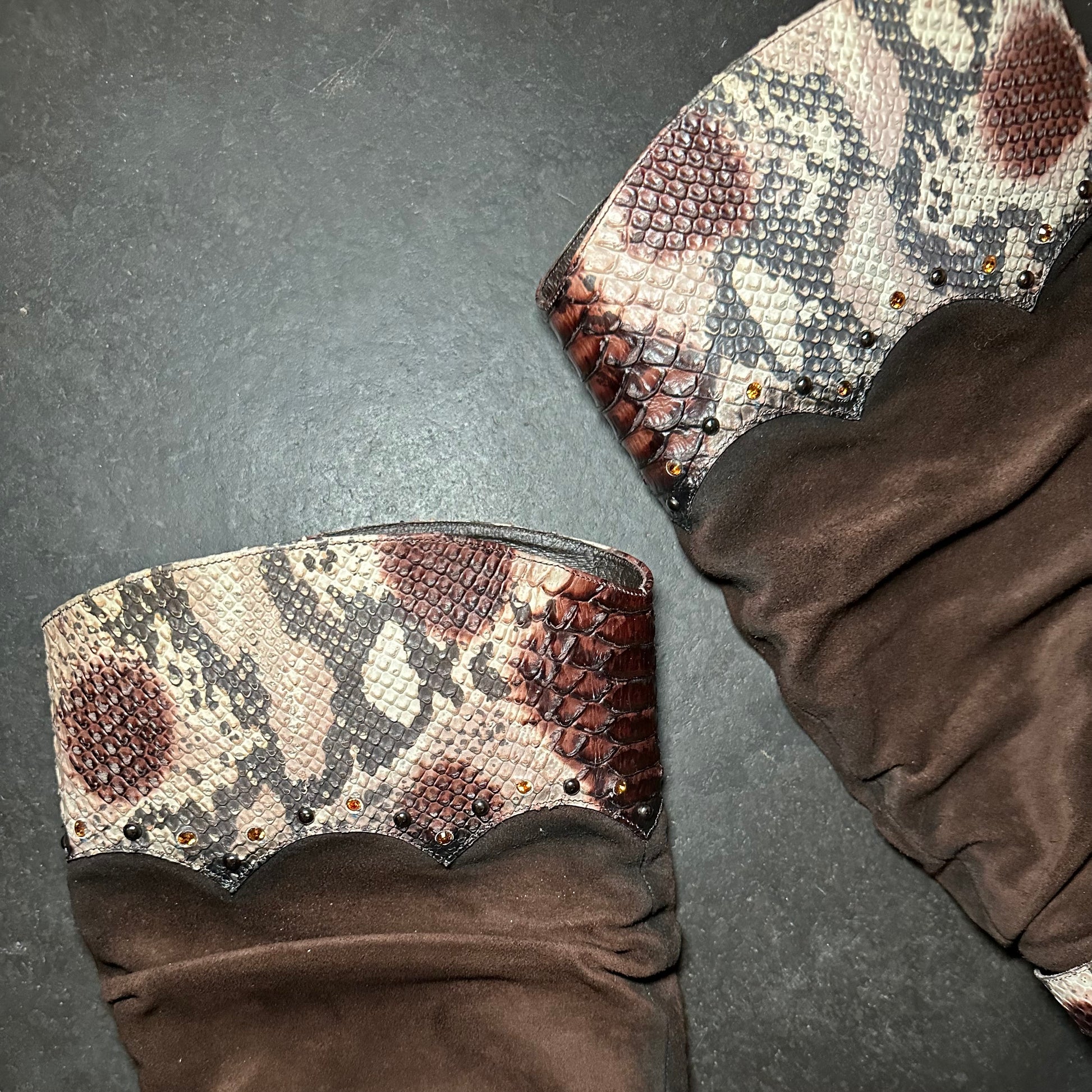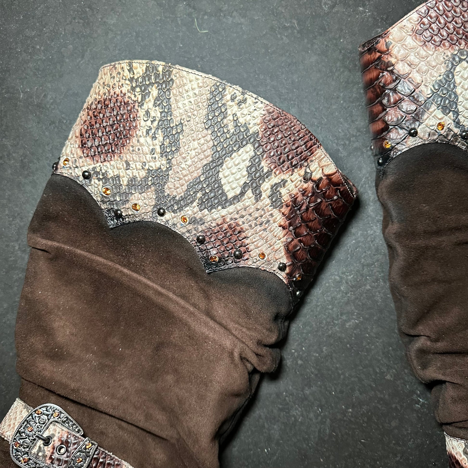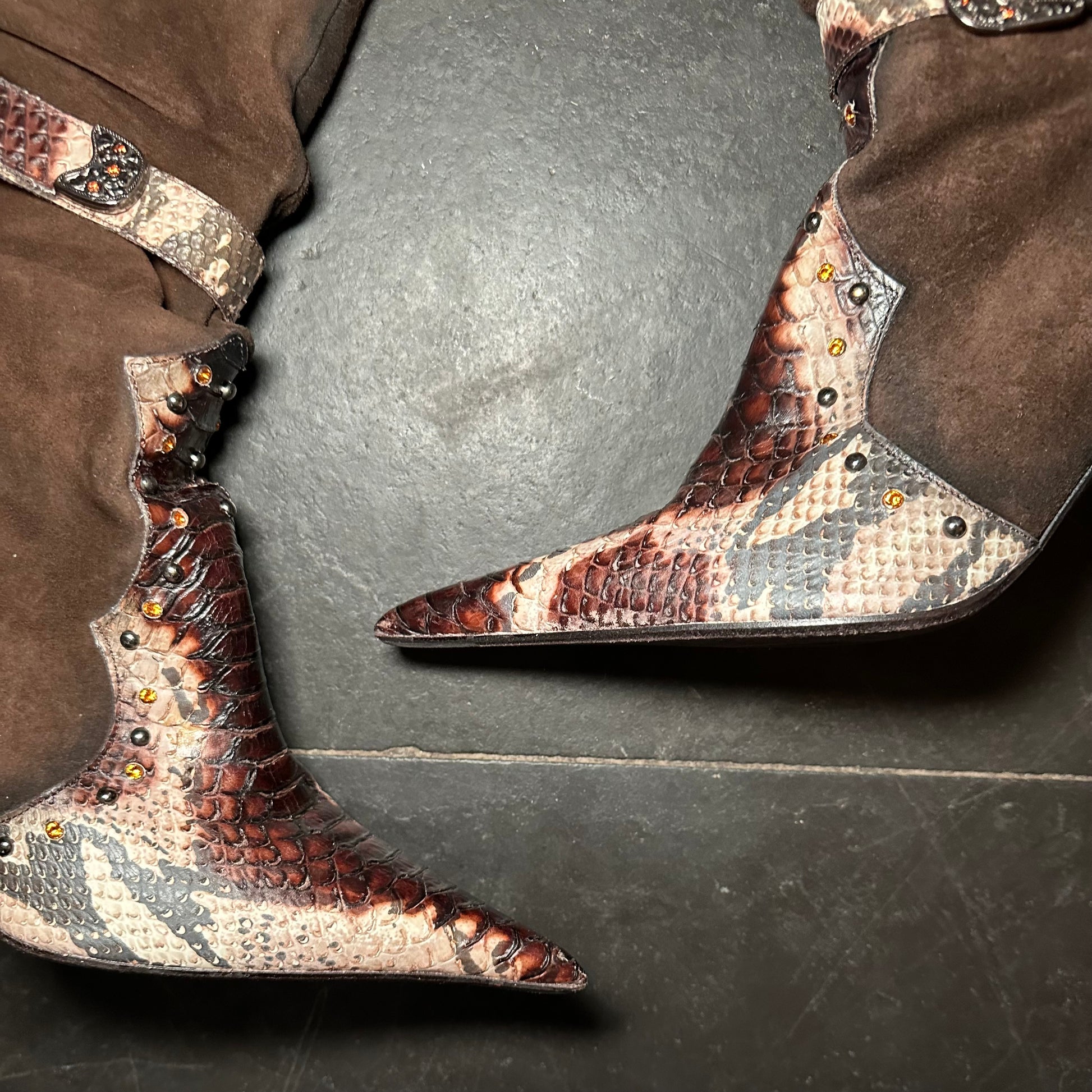 El Dante’s brown suede embellished western heeled boots with snakeskin effect accents.